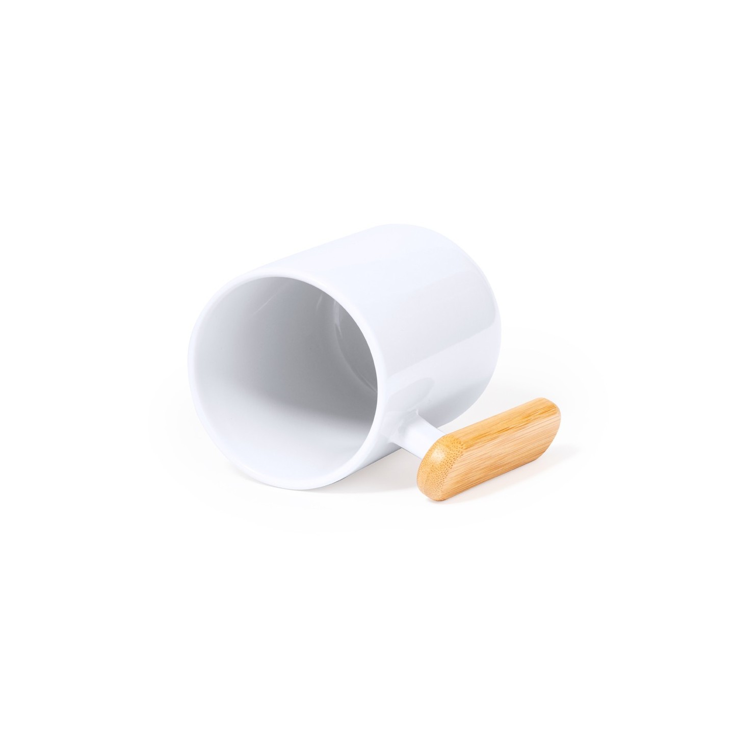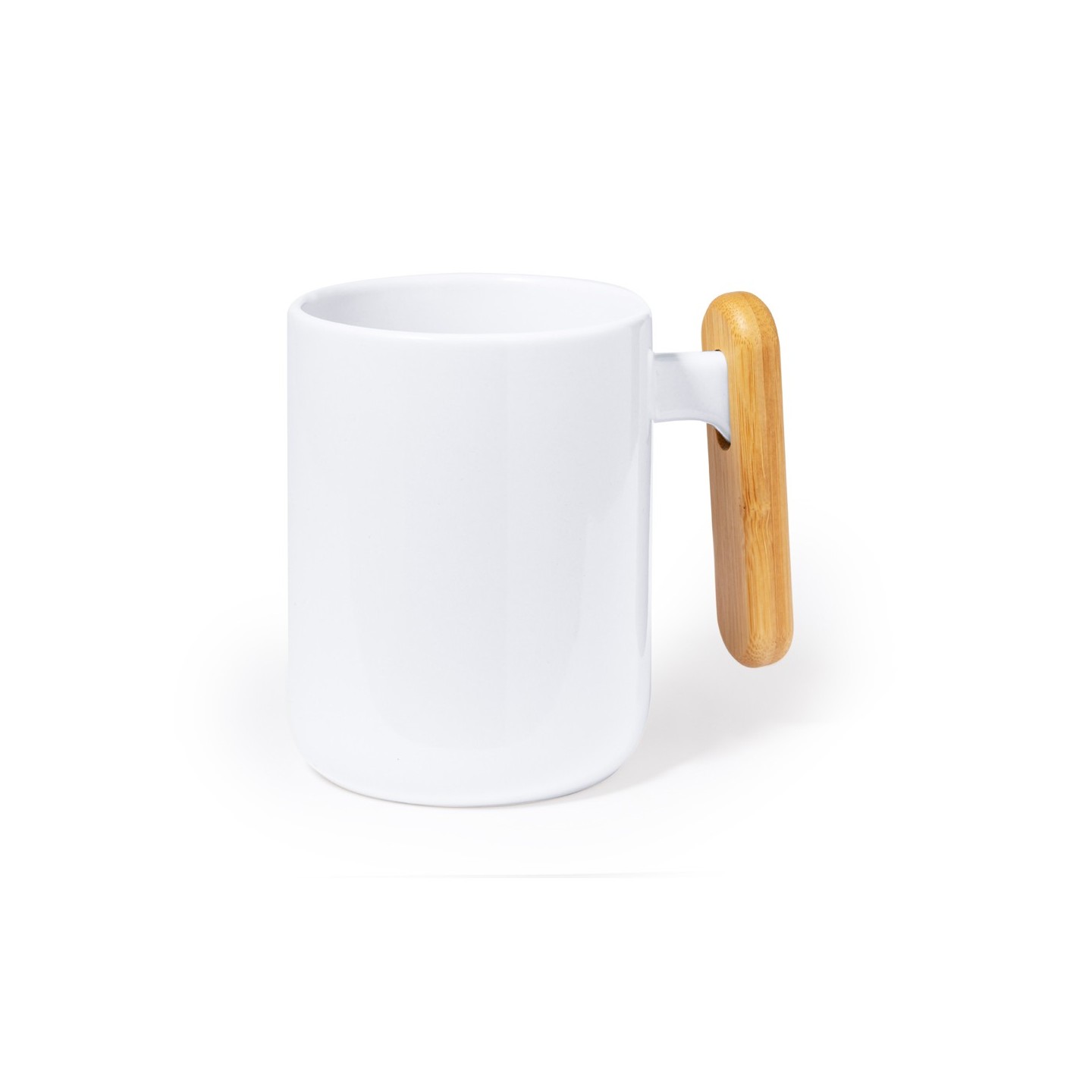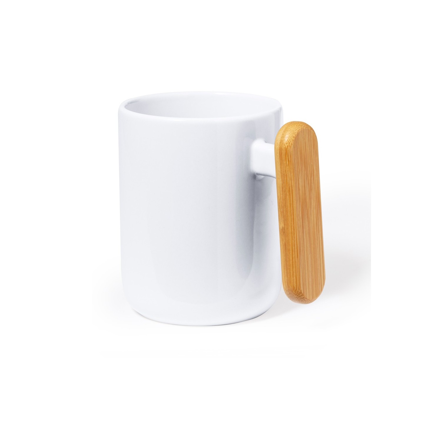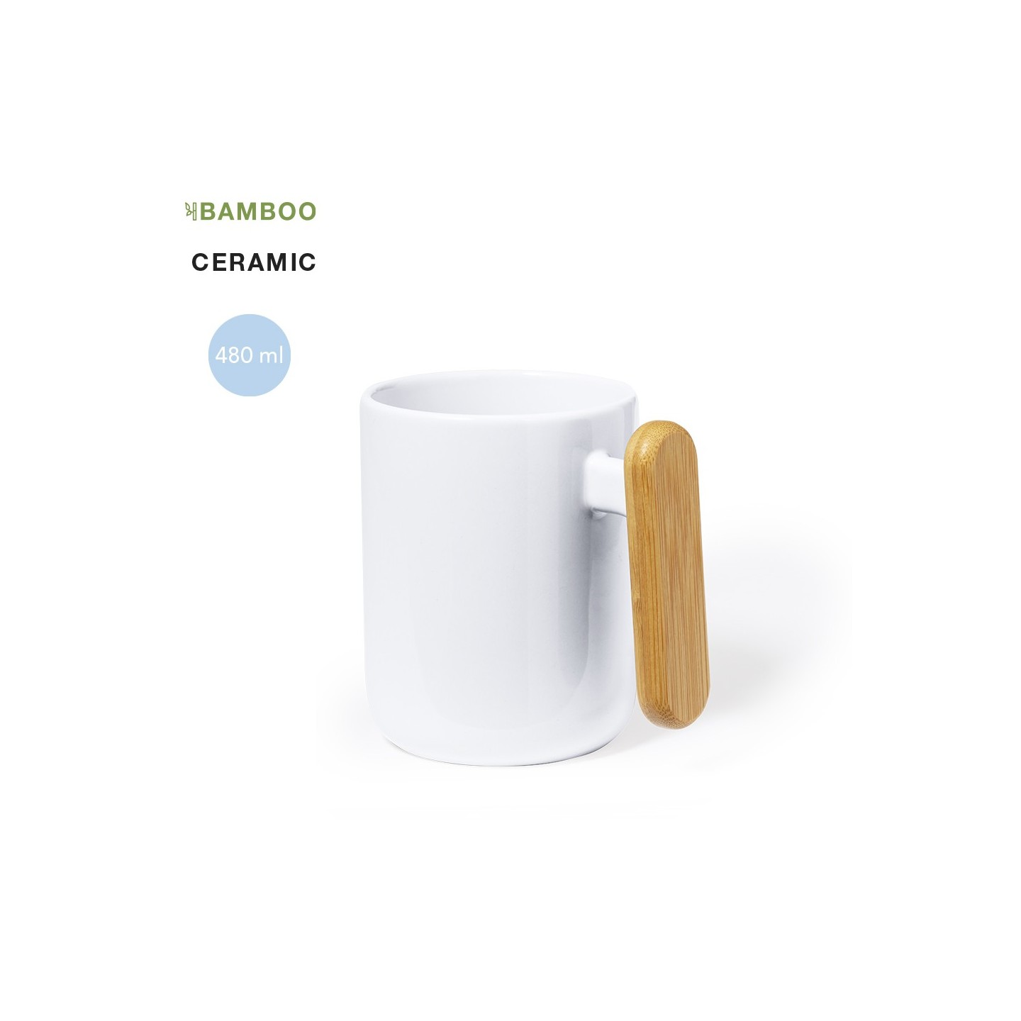 La Taza Mystral es de cerámica blanca de 480 ml con asa de bambú. Presentada en caja kraft. Ideal para personalizar con tu logo.
