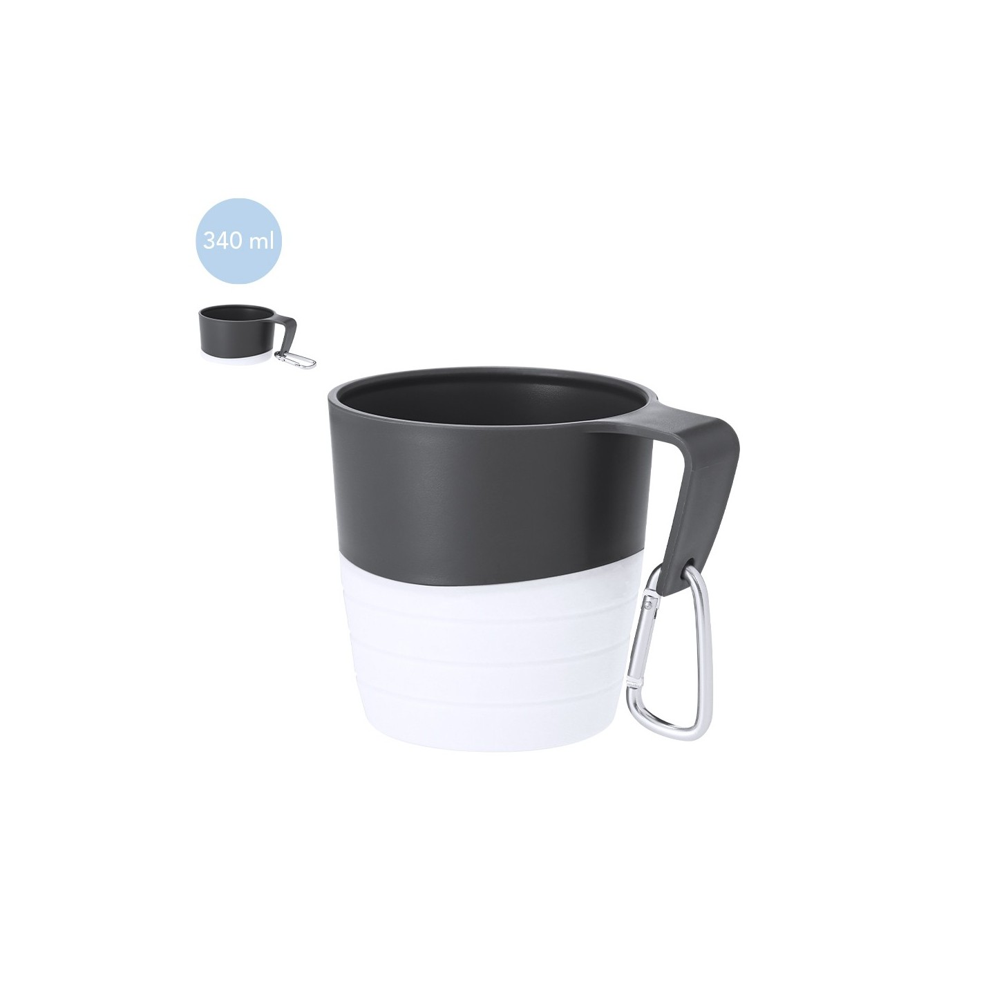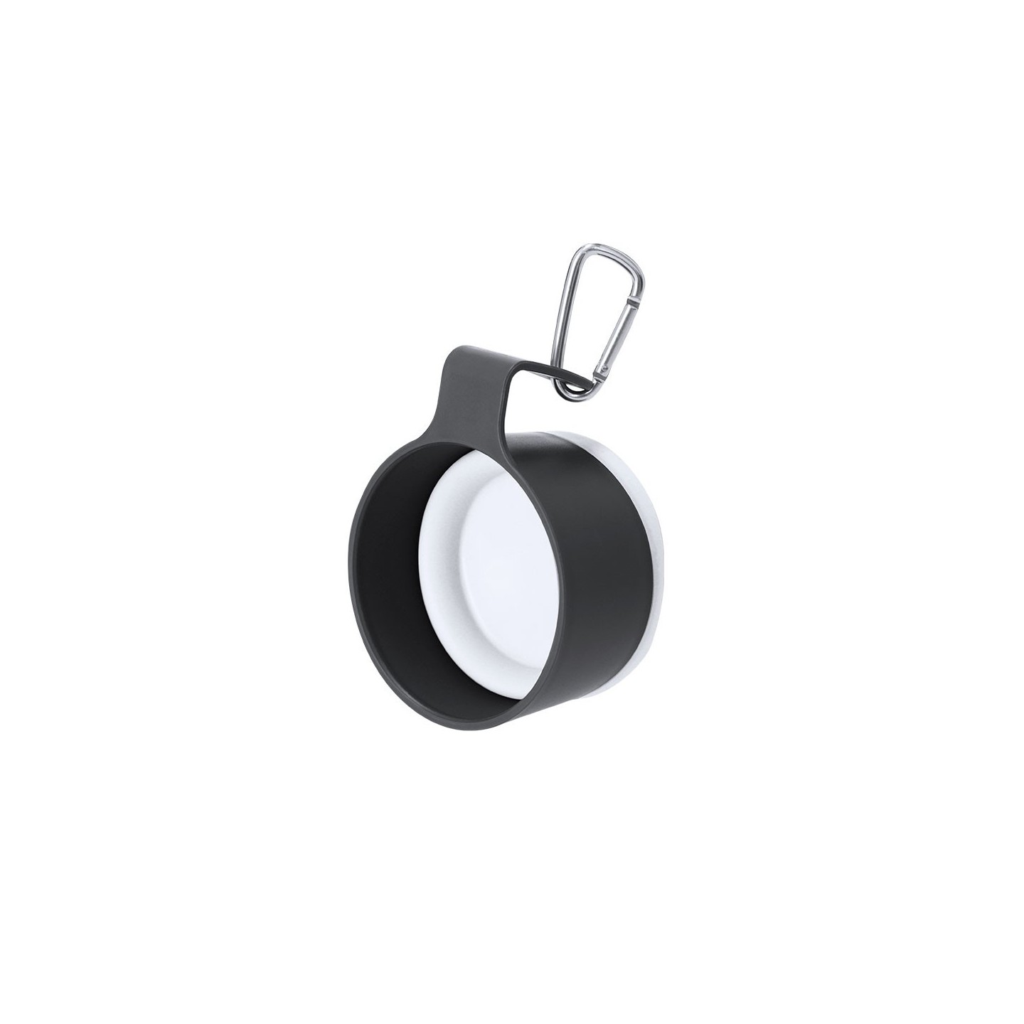 Taza plegable de silicona de 340 ml, con borde y asa rígidos de PP. Compacta, ligera y personalizable, perfecta para transportar con su mosquetón. Libre de BPA. Ideal para promociones y merchandising empresarial.