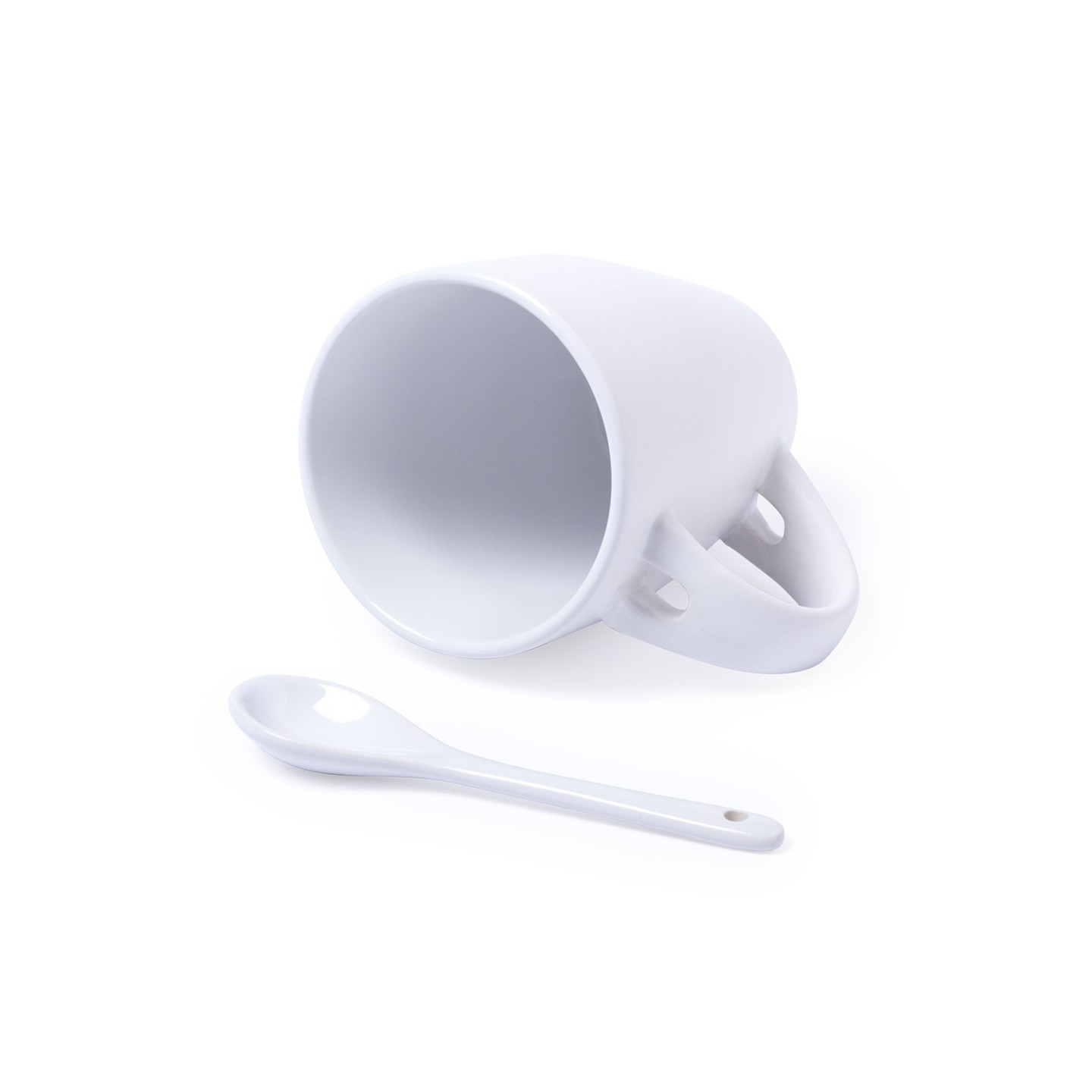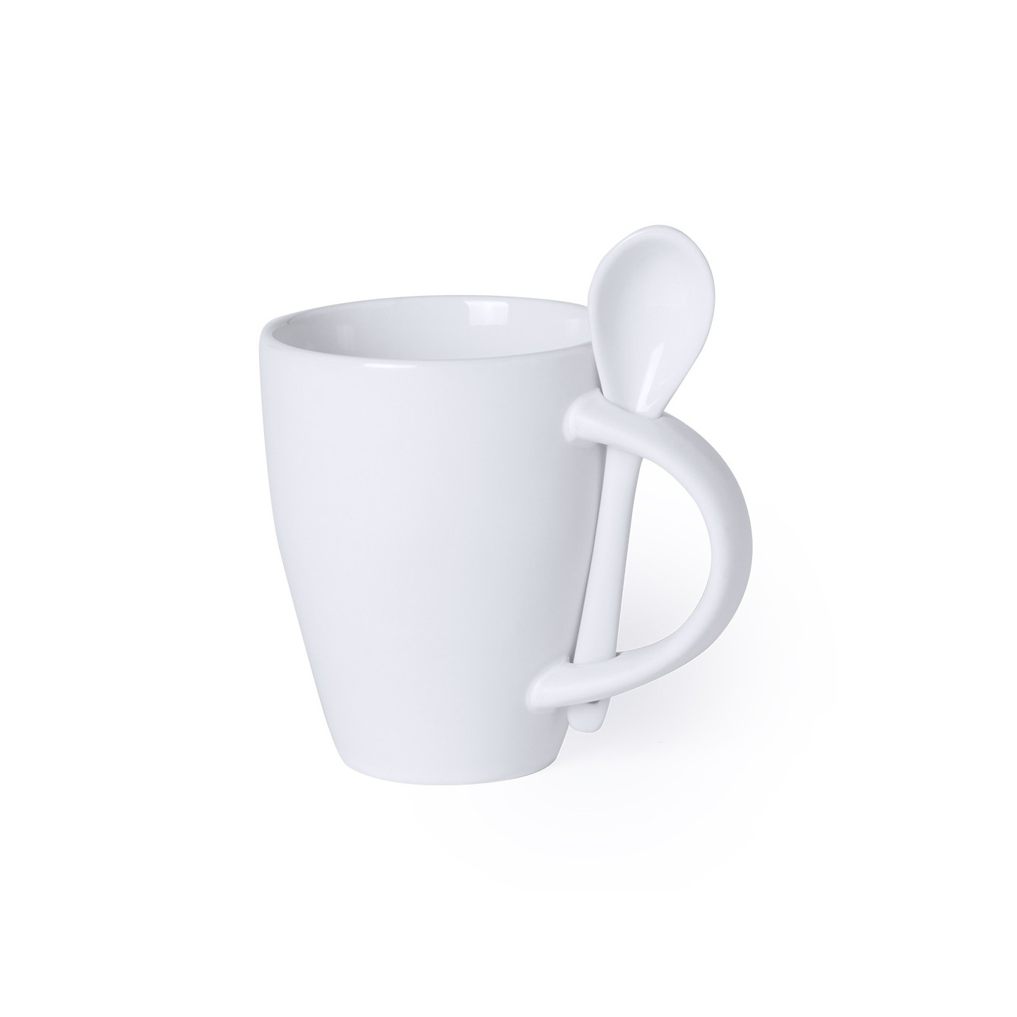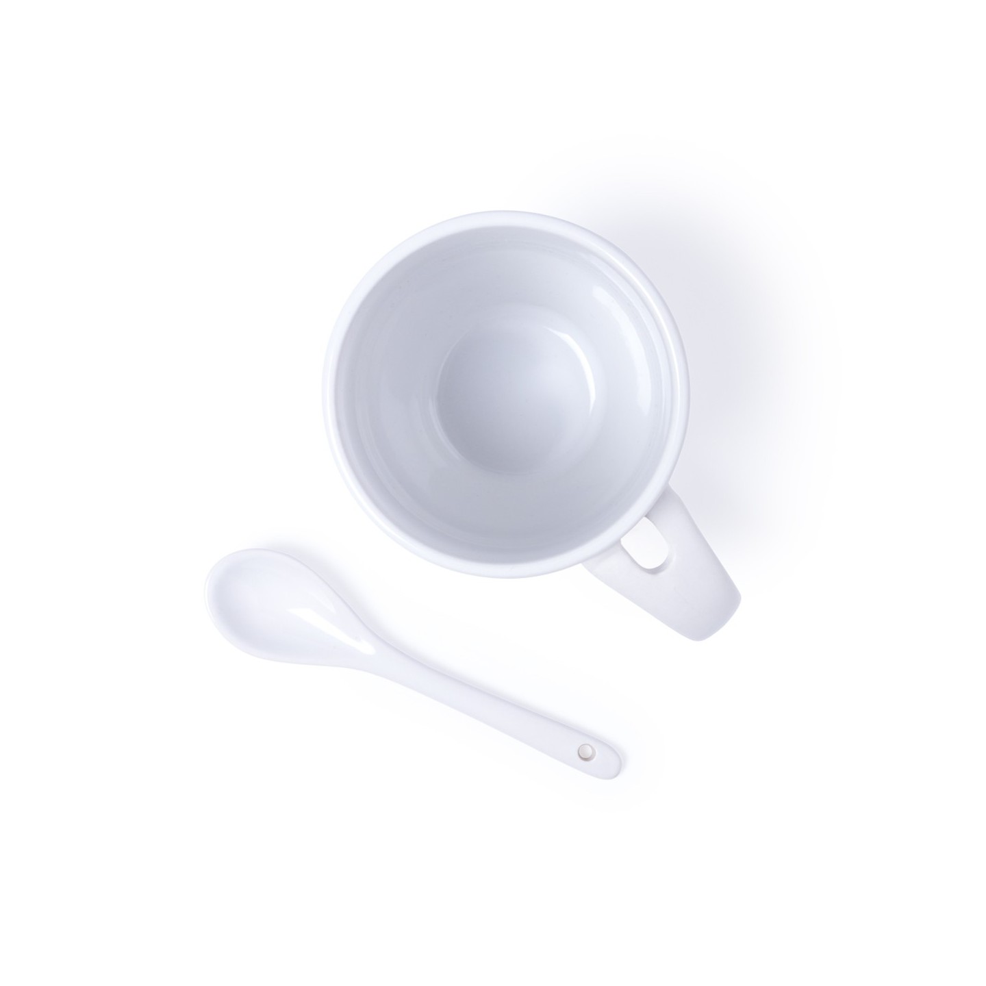 Taza Samay de cerámica blanca con cuchara integrada. Ideal para disfrutar de tus bebidas favoritas. Presentada en caja individual.