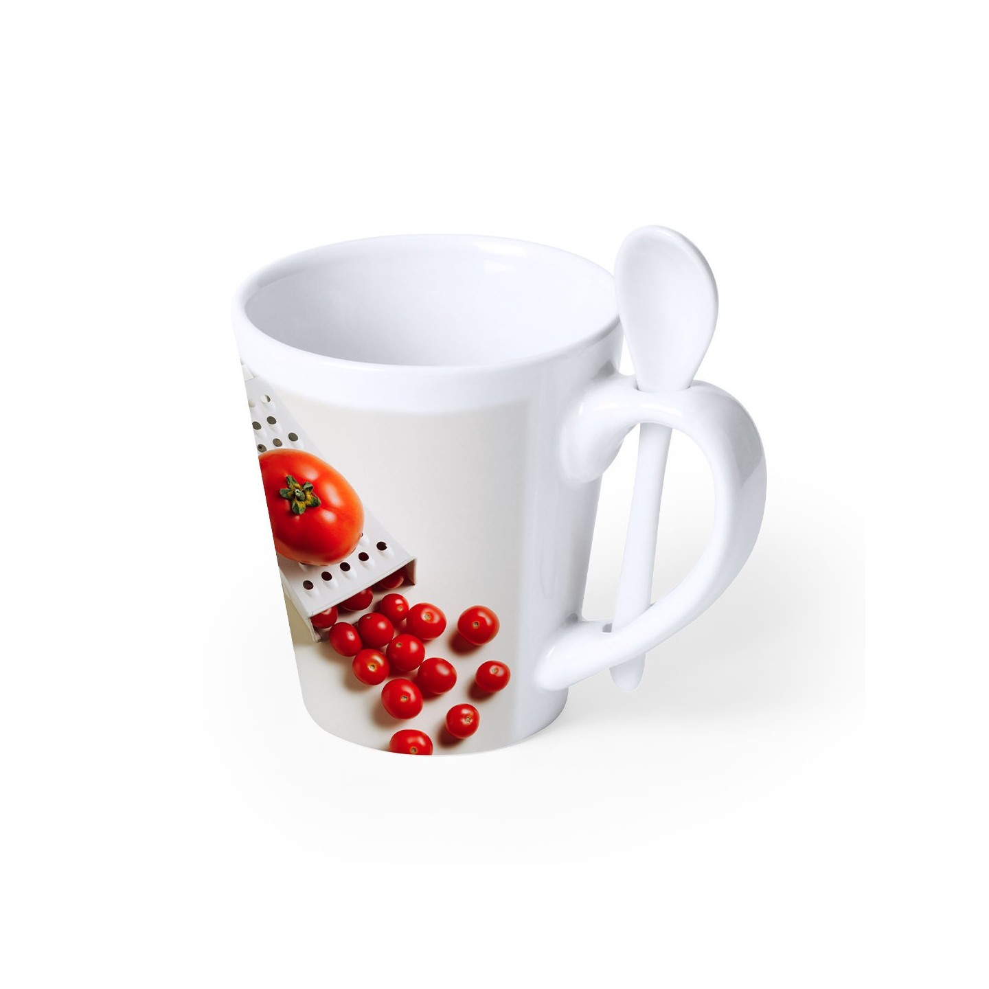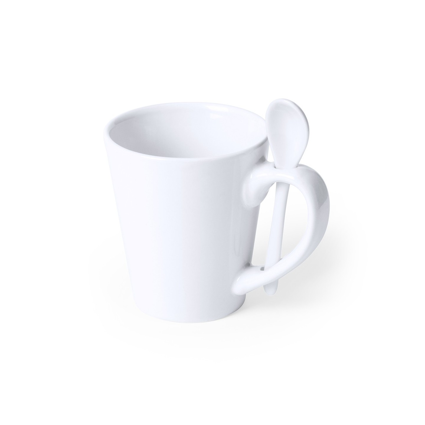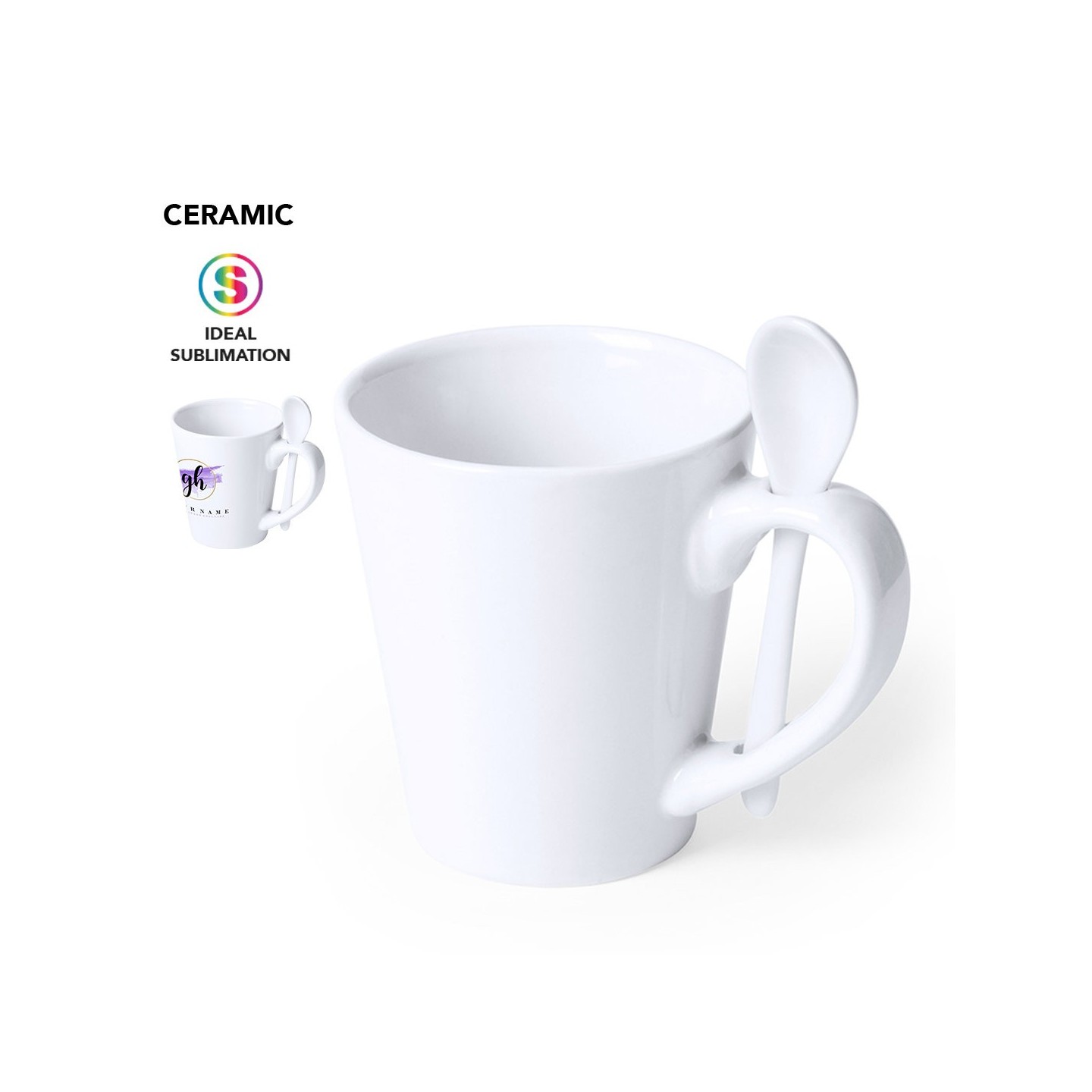 Lo que hace que la Taza Sublimación Kaffir sea única es su cucharilla de cerámica integrada en el asa. Esta característica práctica y funcional añade un toque especial a la experiencia de disfrutar una bebida caliente. Con solo deslizar la cucharilla, tus clientes y empleados podrán endulzar su café o mezclar su té con facilidad.