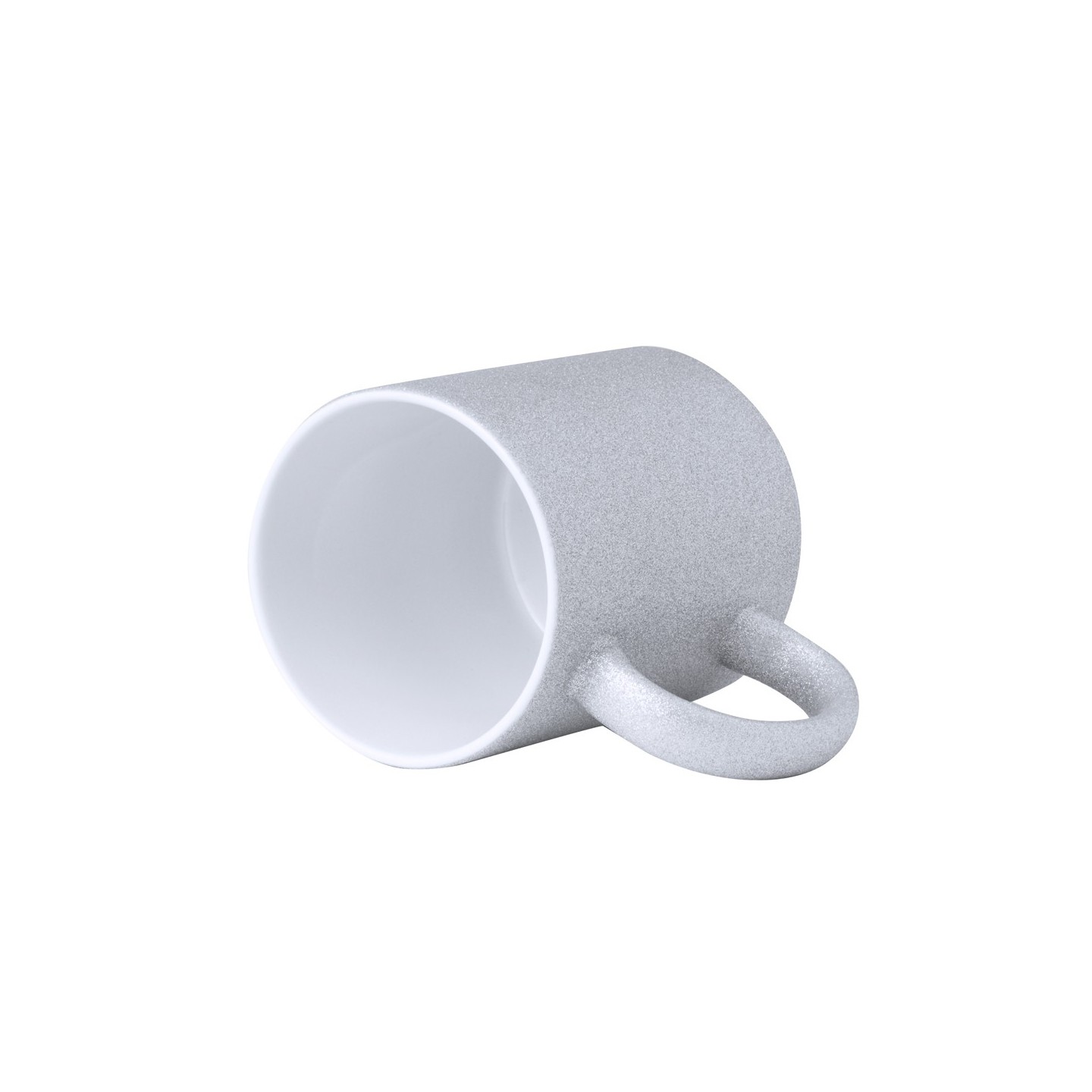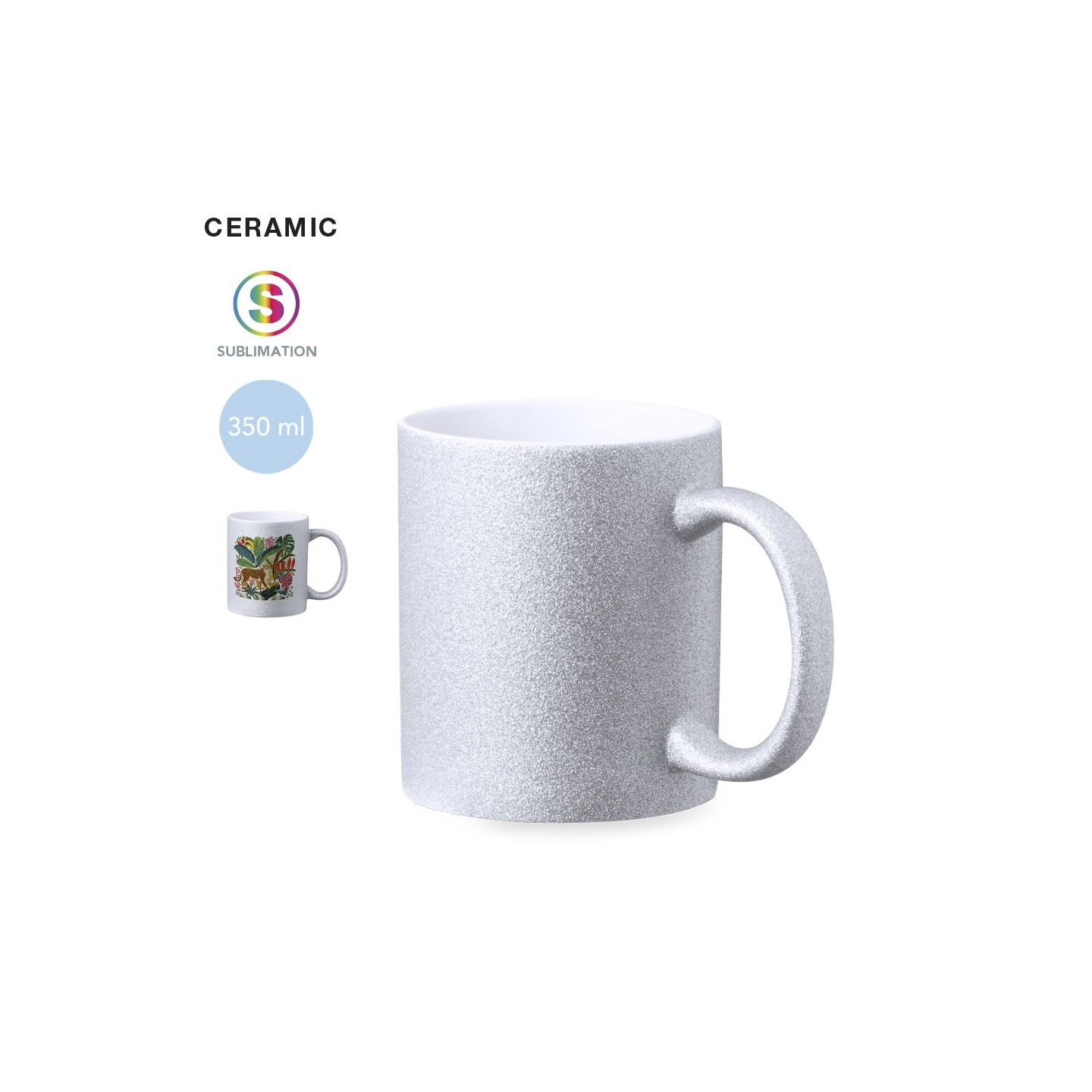 Taza de cerámica con 350 ml de capacidad. Original cobertura efecto purpurina y especialmente diseñada para marcaje en sublimación. Disponible en plata y presentada en caja individual kraft.