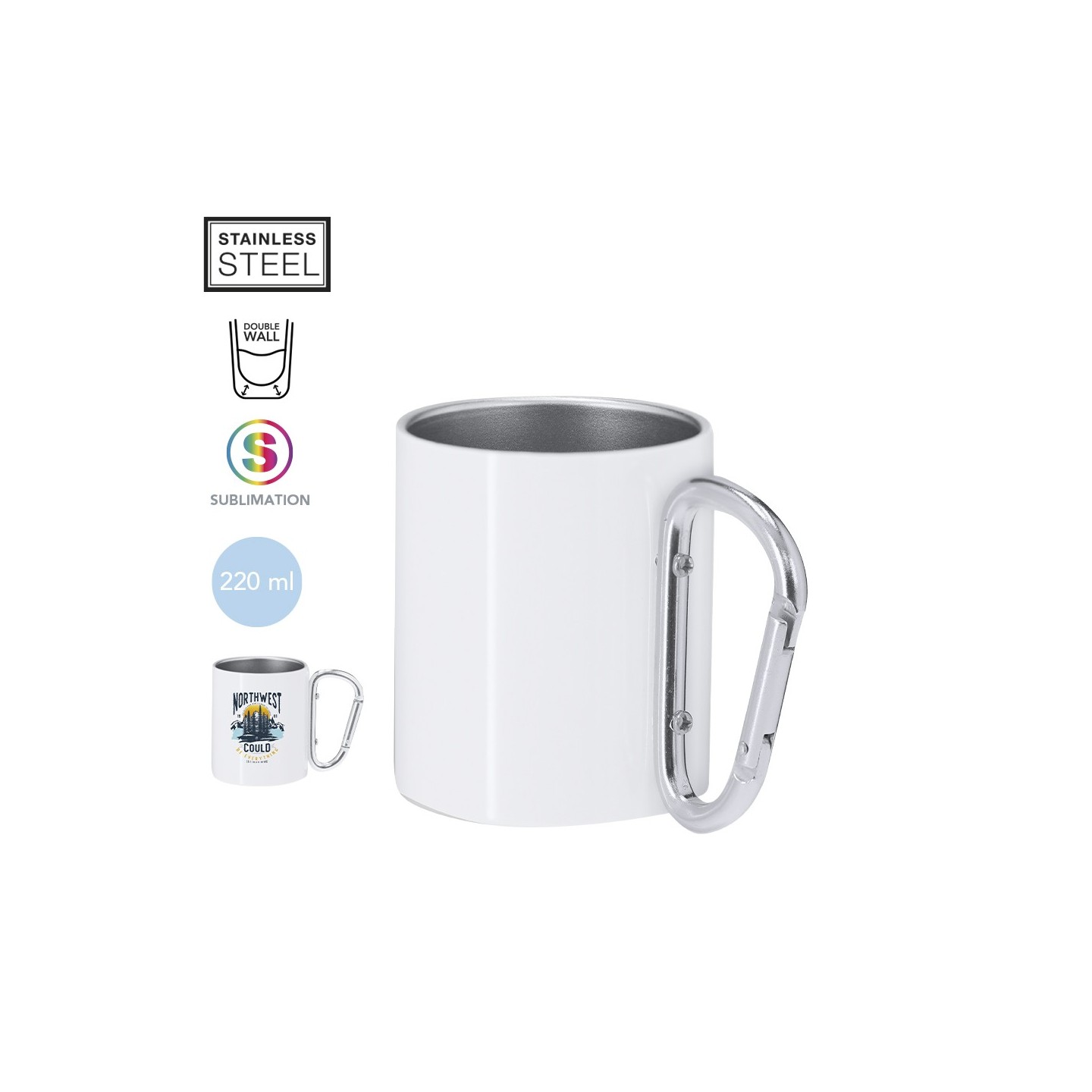 Taza de acero inoxidable de 220 ml con acabado blanco brillante, asa de mosquetón y doble pared para mantener la temperatura. Ideal para sublimación y personalizable con tu logotipo.