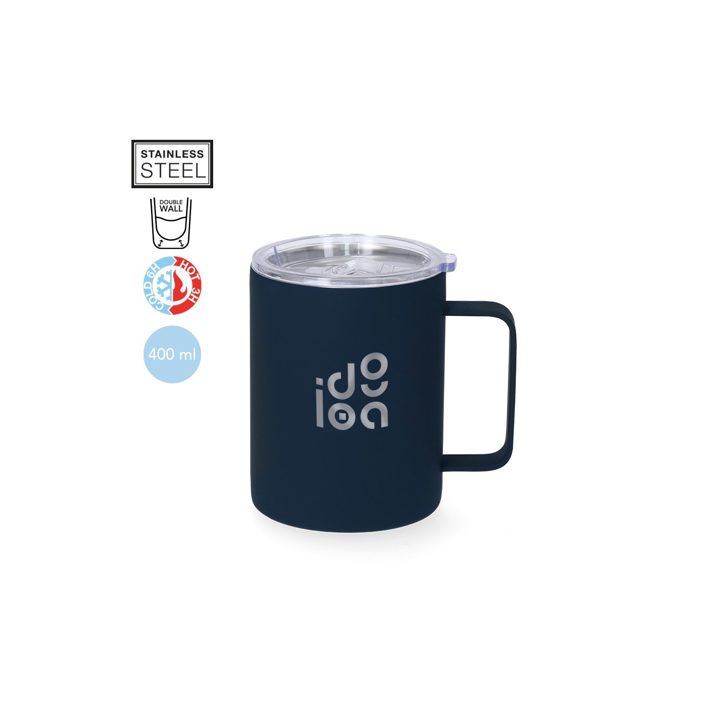Taza térmica Adelax en acero inoxidable de doble pared, 400 ml. Acabado en caucho ideal para marcaje láser. Incluye tapa a presión y dosificador. Personalizable con tu logotipo