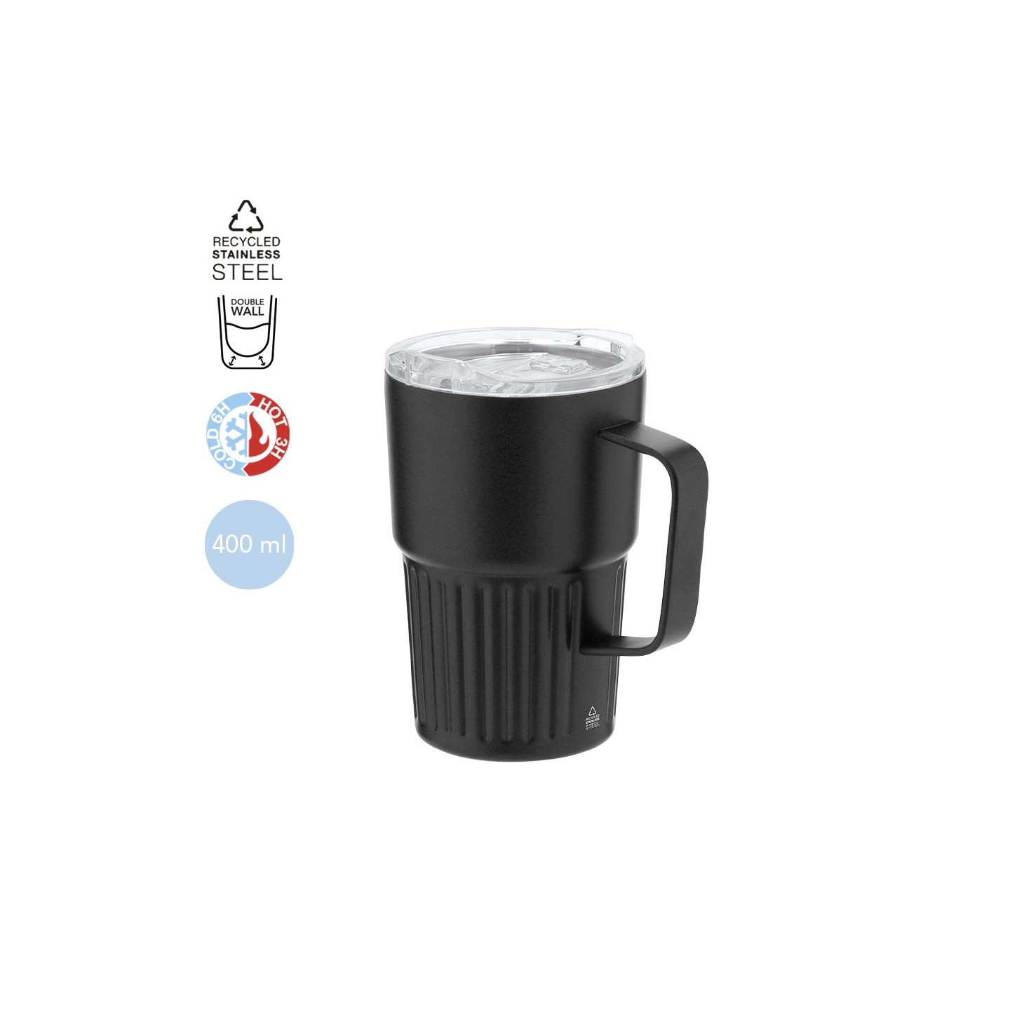 Taza Térmica FINBAR de 400 ml, acero inoxidable reciclado. Mantiene bebidas frías 6h y calientes 3h. Personalizable con tu logotipo. Con dosificador y cierre a presión.