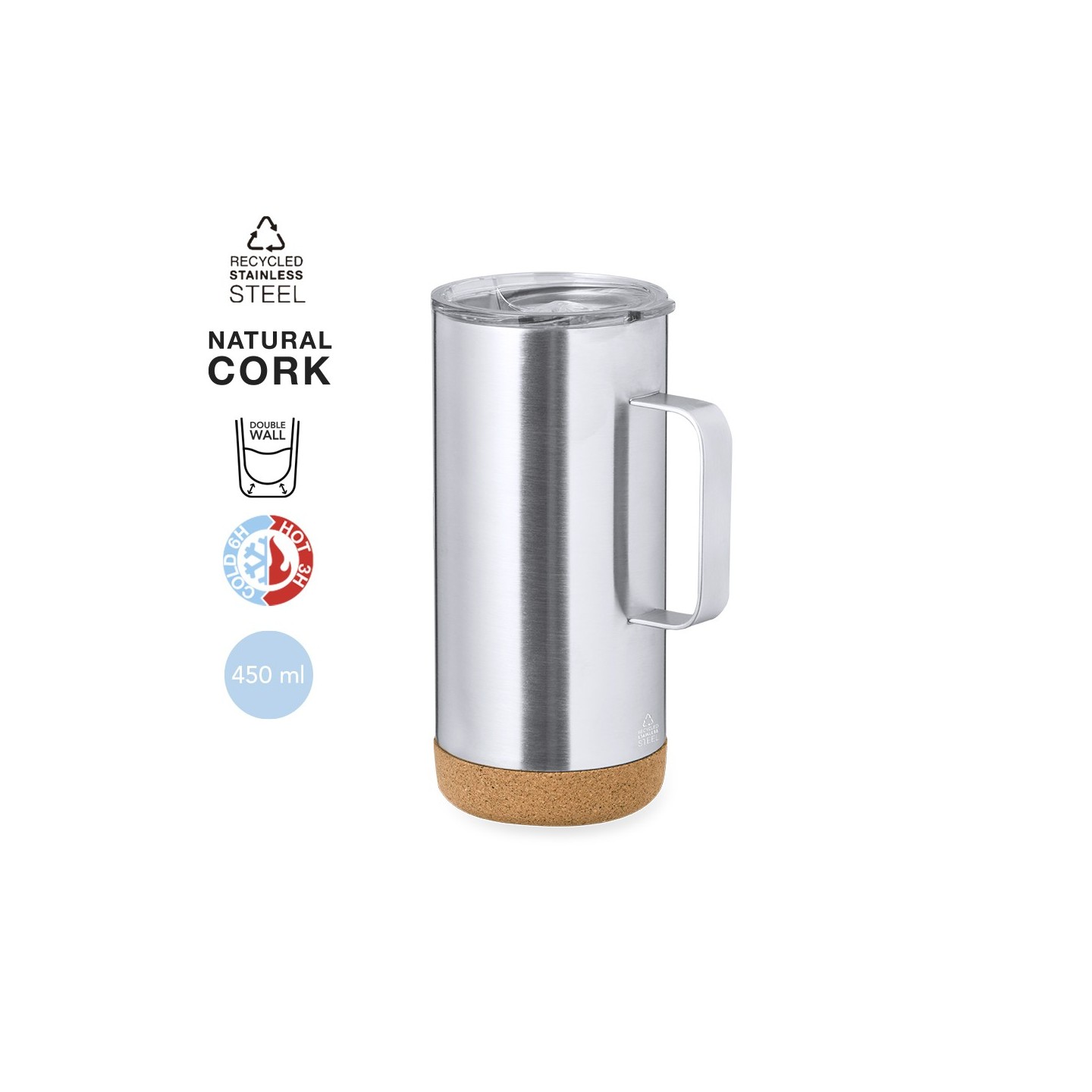 Esta taza térmica, fabricada en acero inoxidable reciclado de doble pared, no solo te acompaña en tus momentos de disfrute, sino que también refleja tu compromiso con el medio ambiente. Con una capacidad de 450 ml, es perfecta para mantener tus bebidas calientes o frías durante más tiempo.
