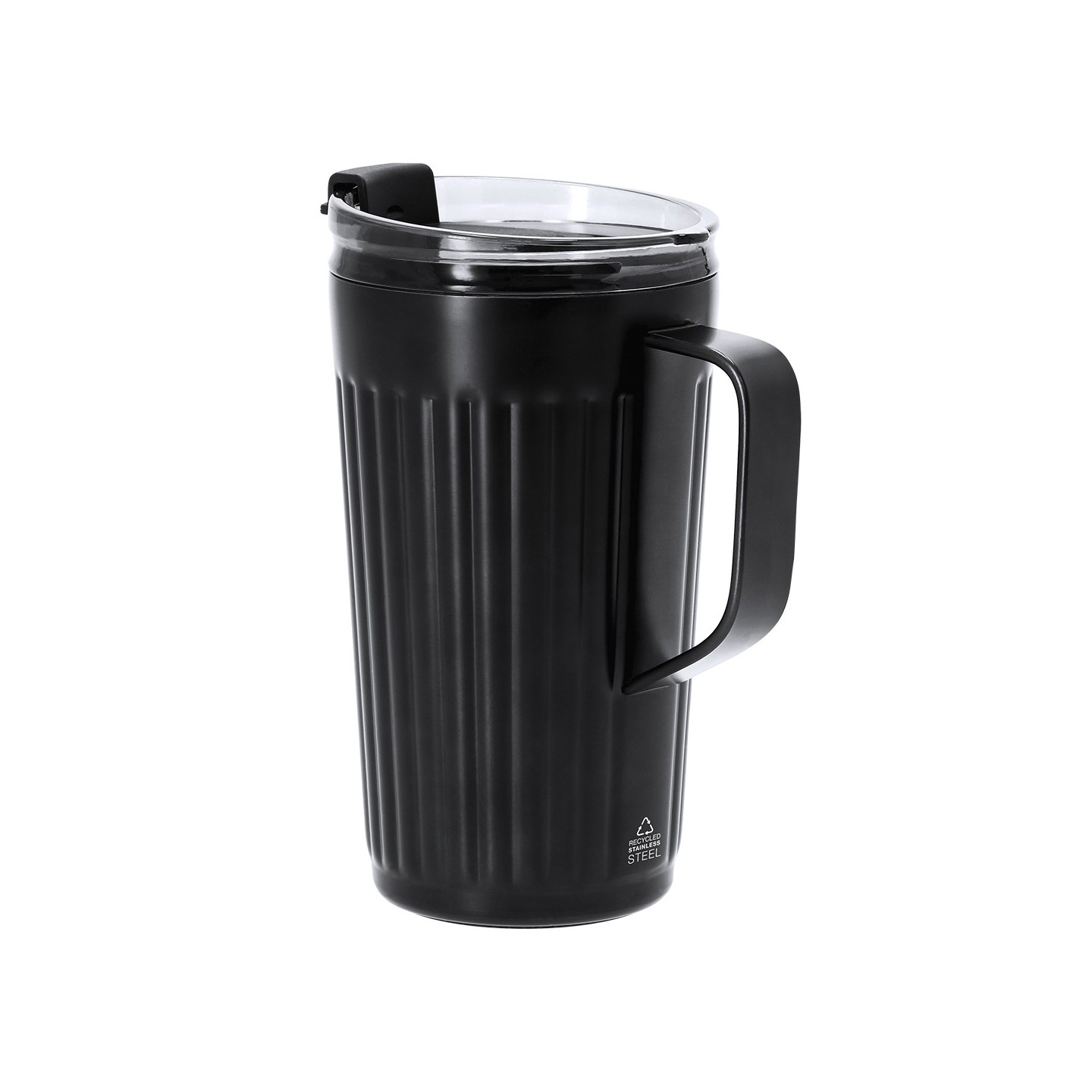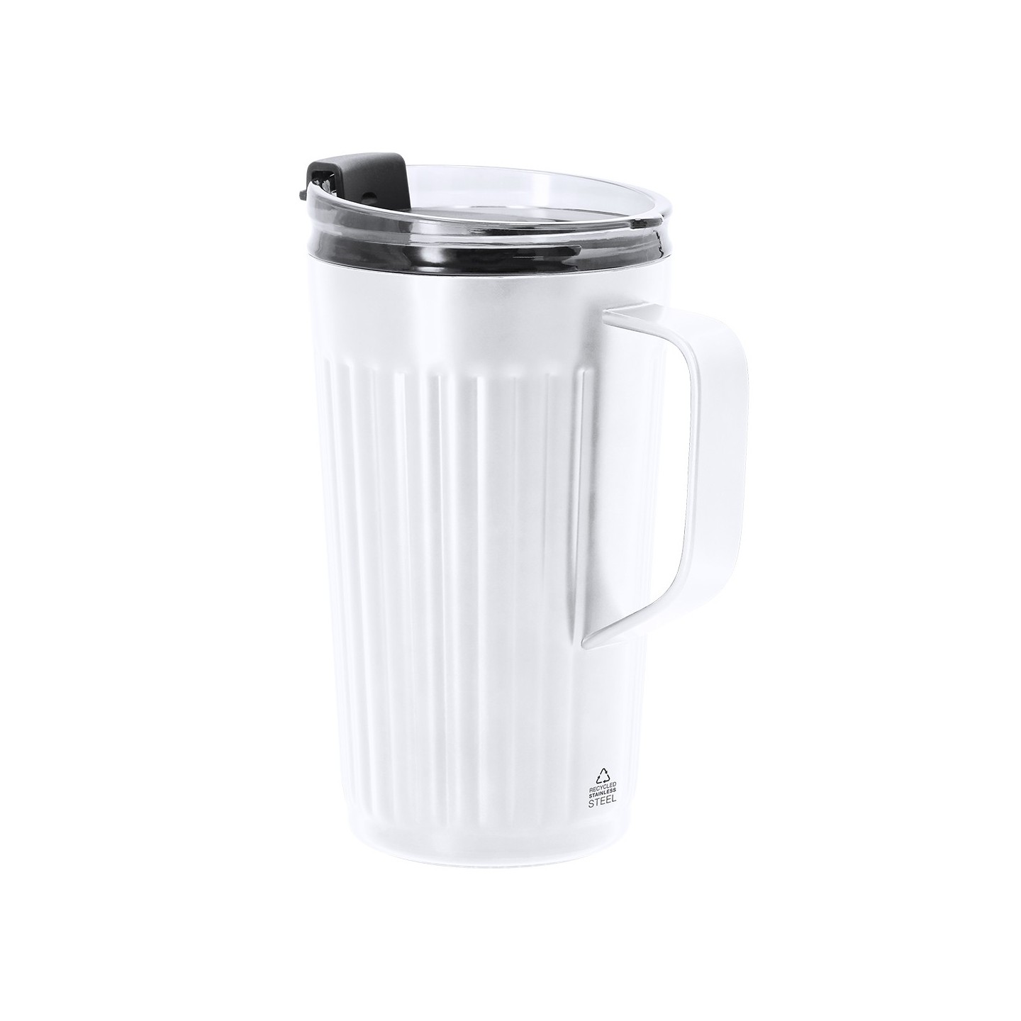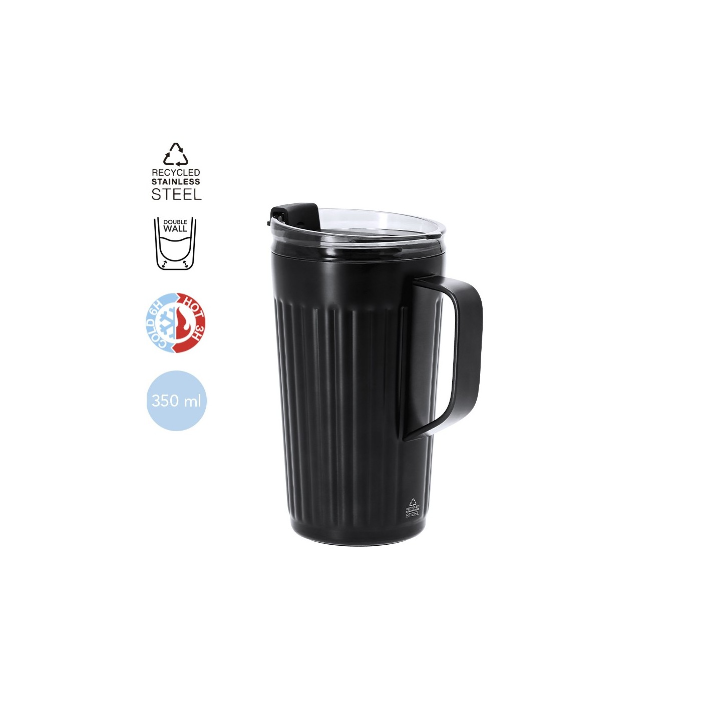 La Taza Térmica Korpla de 350 ml, fabricada en Acero Inox Reciclado, destaca por su diseño biselado y tapa con dosificador. Personalizable y libre de BPA, perfecta para cualquier ocasión.