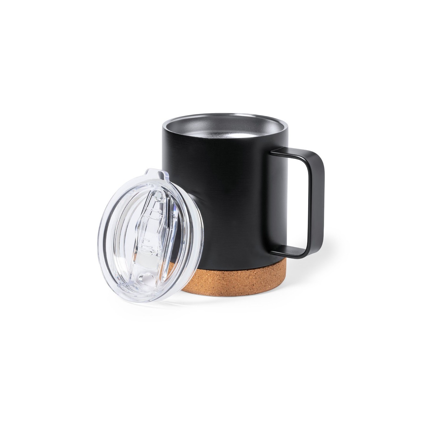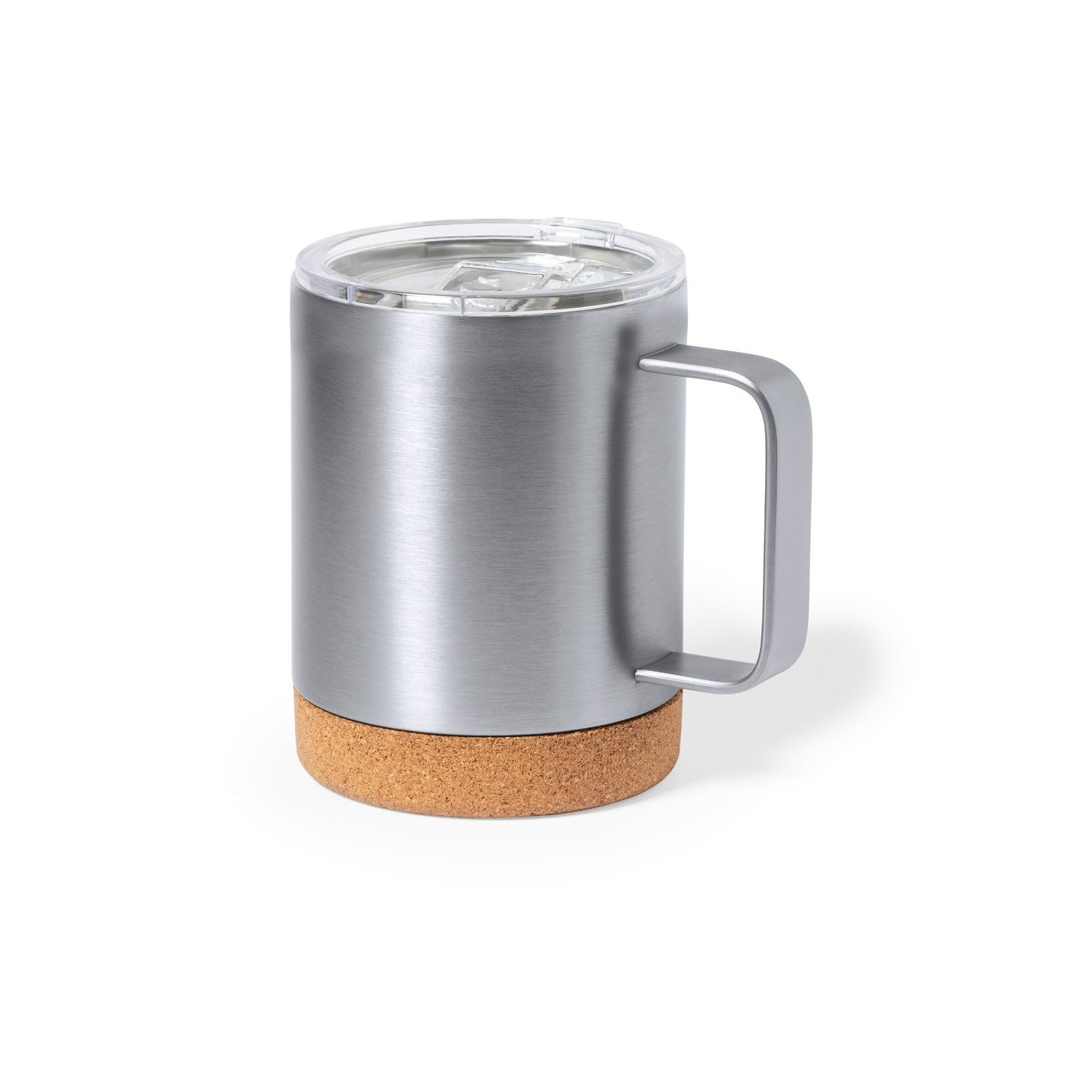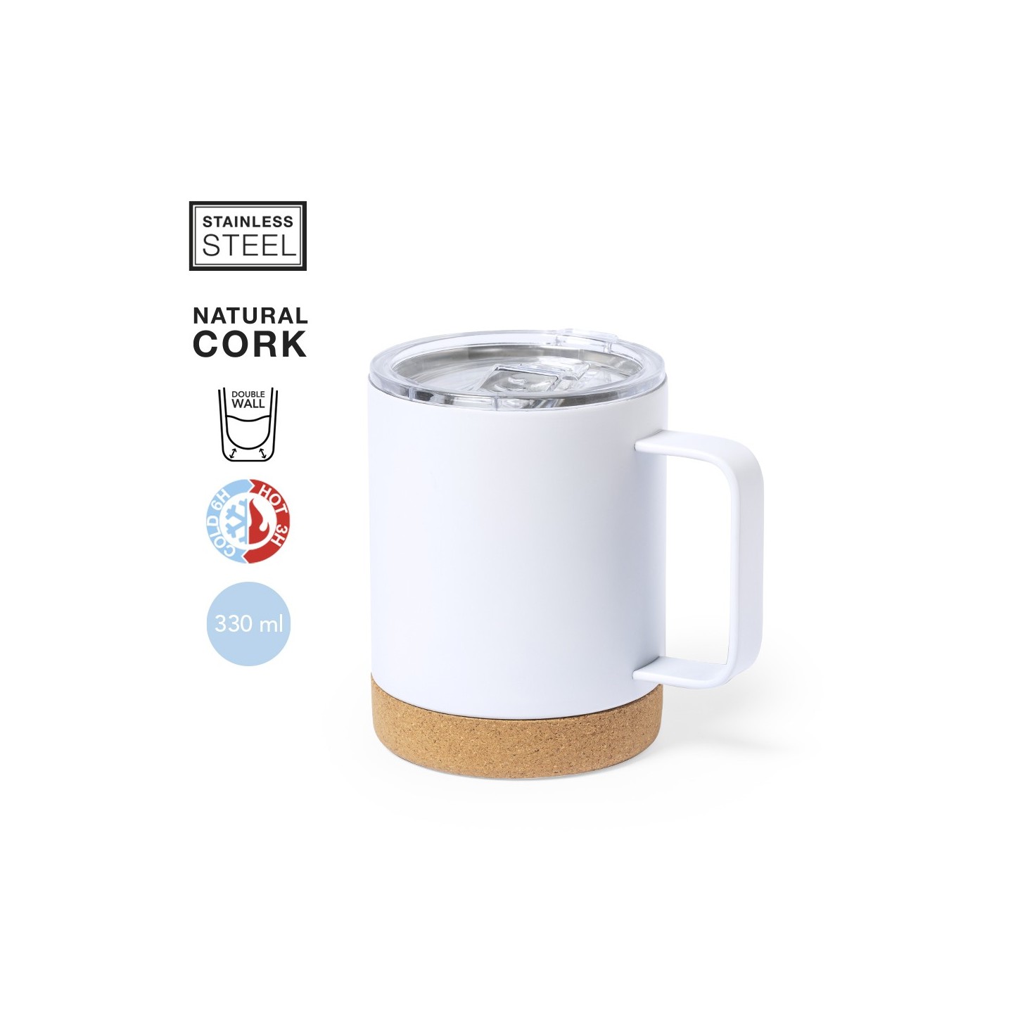 Disfruta de tus bebidas en movimiento con la Taza Térmica Loret de acero inoxidable, capacidad 330 ml, dosificador en tapa y base de corcho natural. Estilo y funcionalidad en una sola taza.