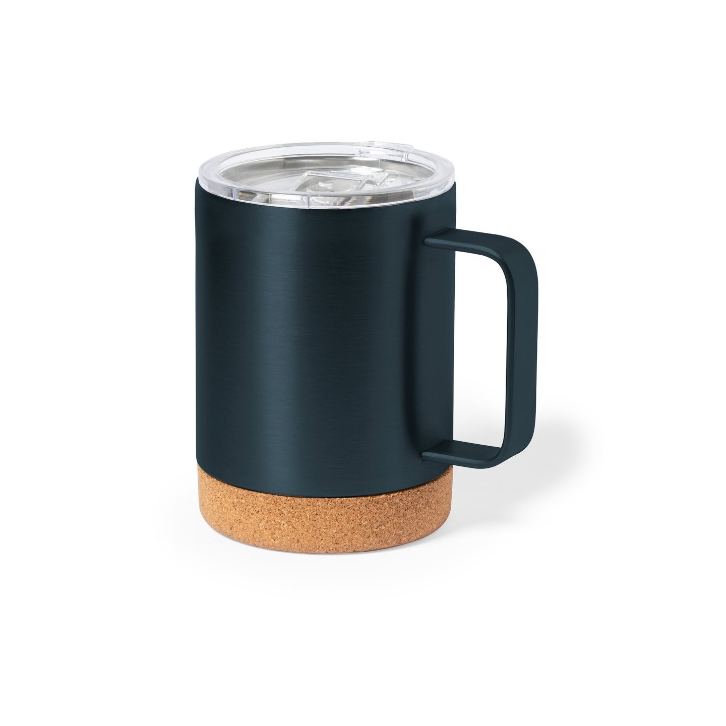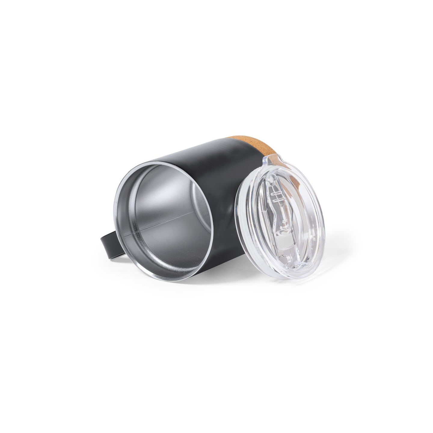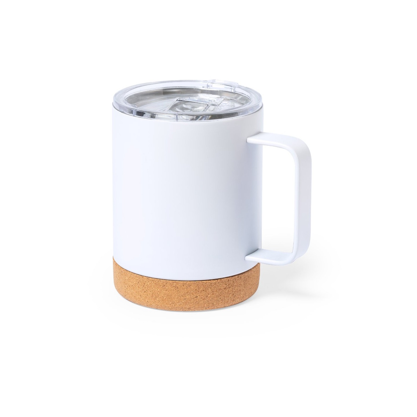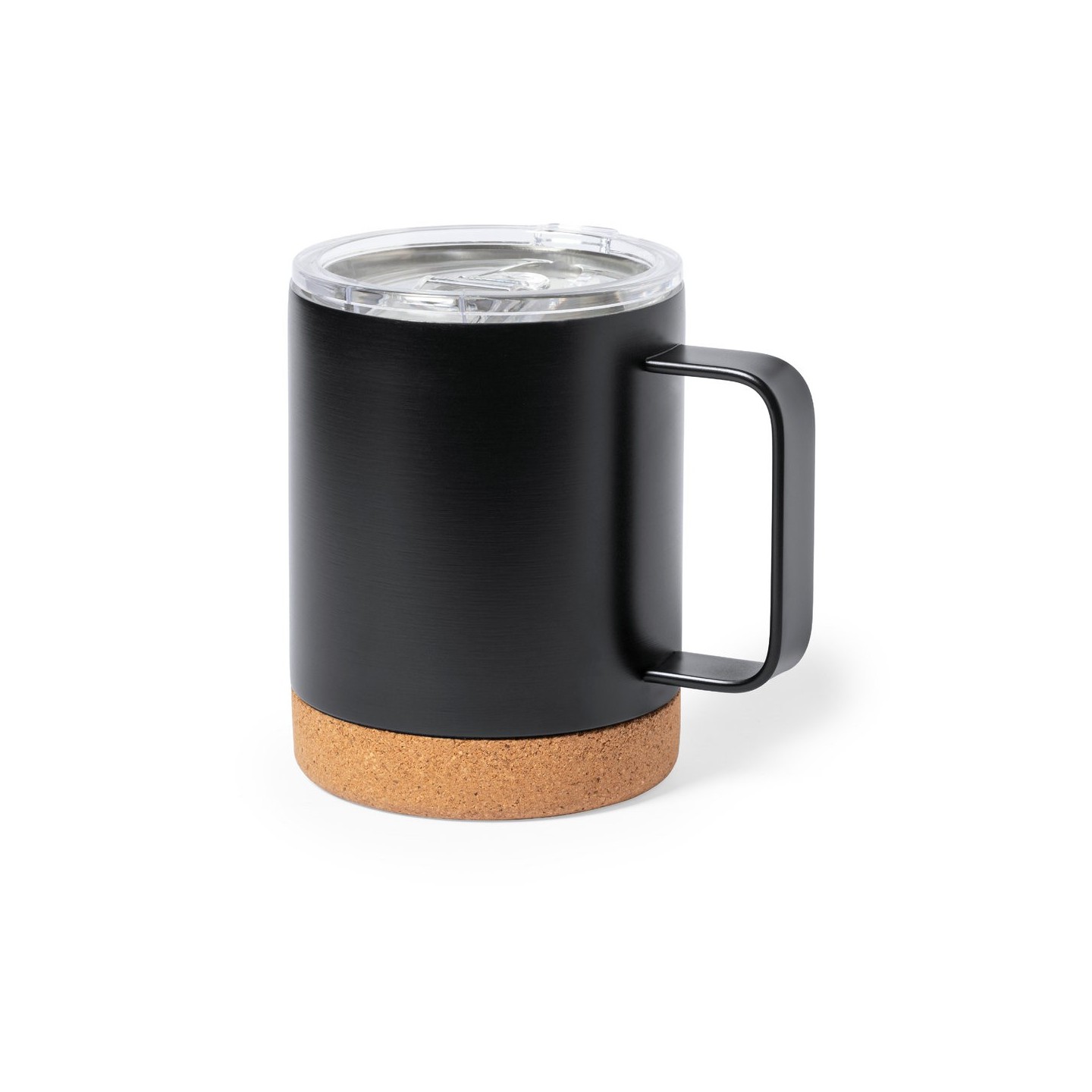 Disfruta de tus bebidas en movimiento con la Taza Térmica Loret de acero inoxidable, capacidad 330 ml, dosificador en tapa y base de corcho natural. Estilo y funcionalidad en una sola taza.