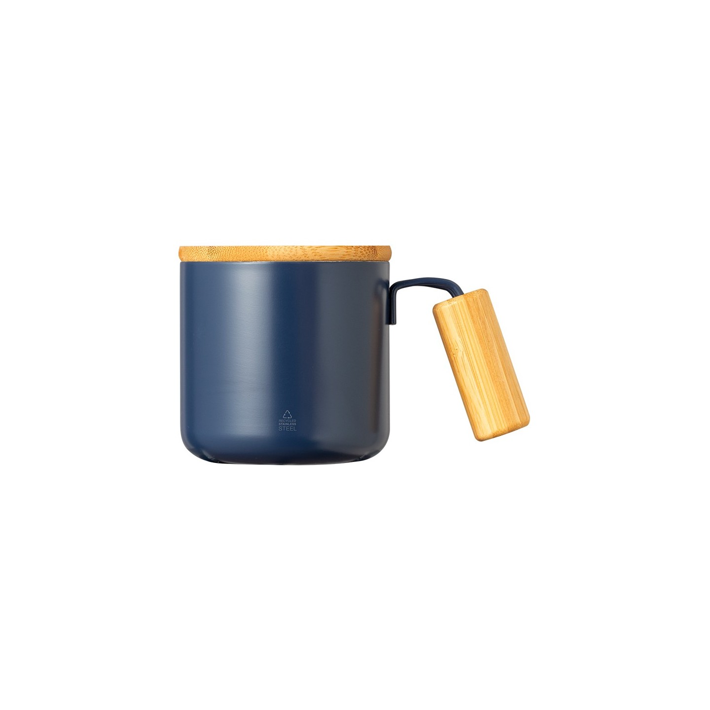 El distintivo Acero Inoxidable Reciclado resalta su compromiso con la sostenibilidad, mostrando la incorporación de materiales reciclados en su producción. La taza se presenta en una caja individual de diseño kraft y en una bolsa reciclada, reforzando su compromiso con el cuidado del medio ambiente.
