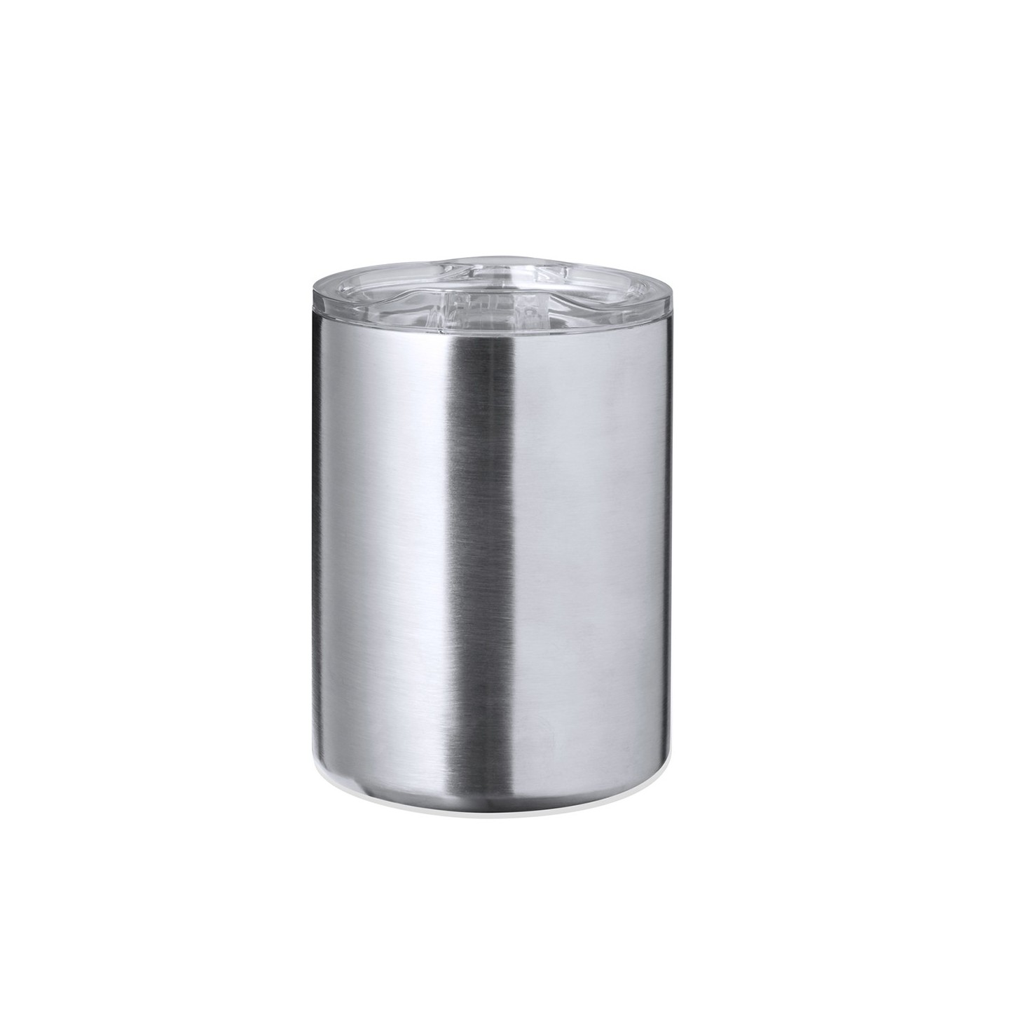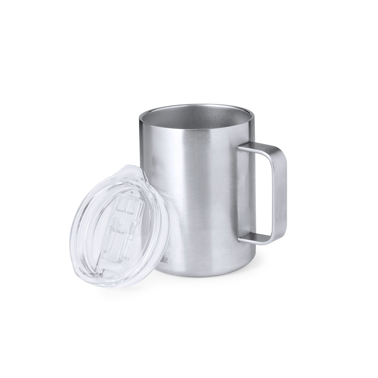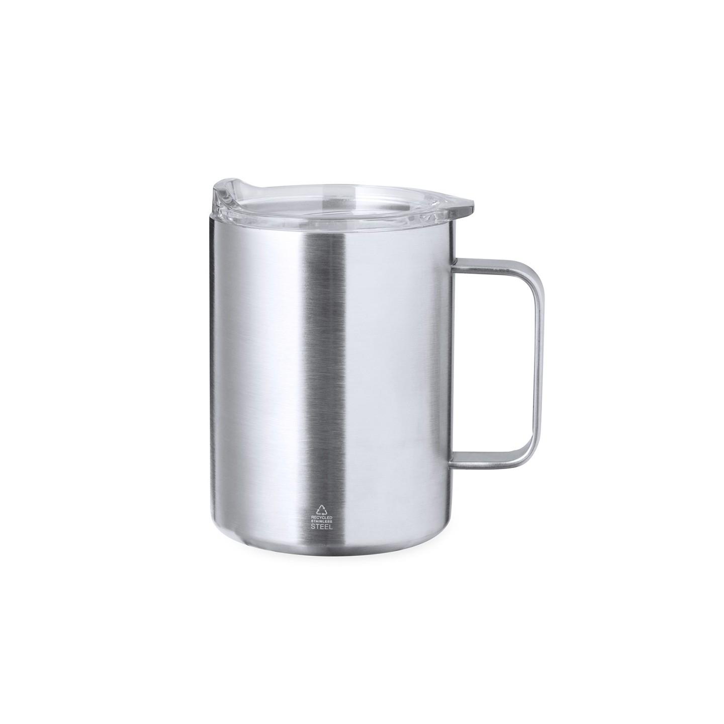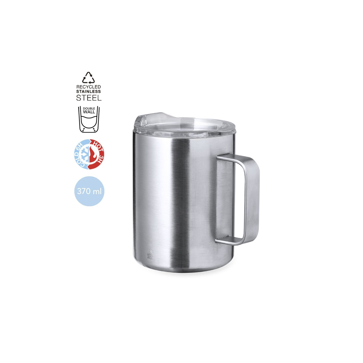 Taza térmica de sobremesa fabricada con acero inox reciclado de doble pared y 370 ml de capacidad. Con dosificador abrefácil en tapa, libre de BPA, y acabado plata. Con logotipo Acero Inox Reciclado. Presentada en caja individual de diseño kraft.