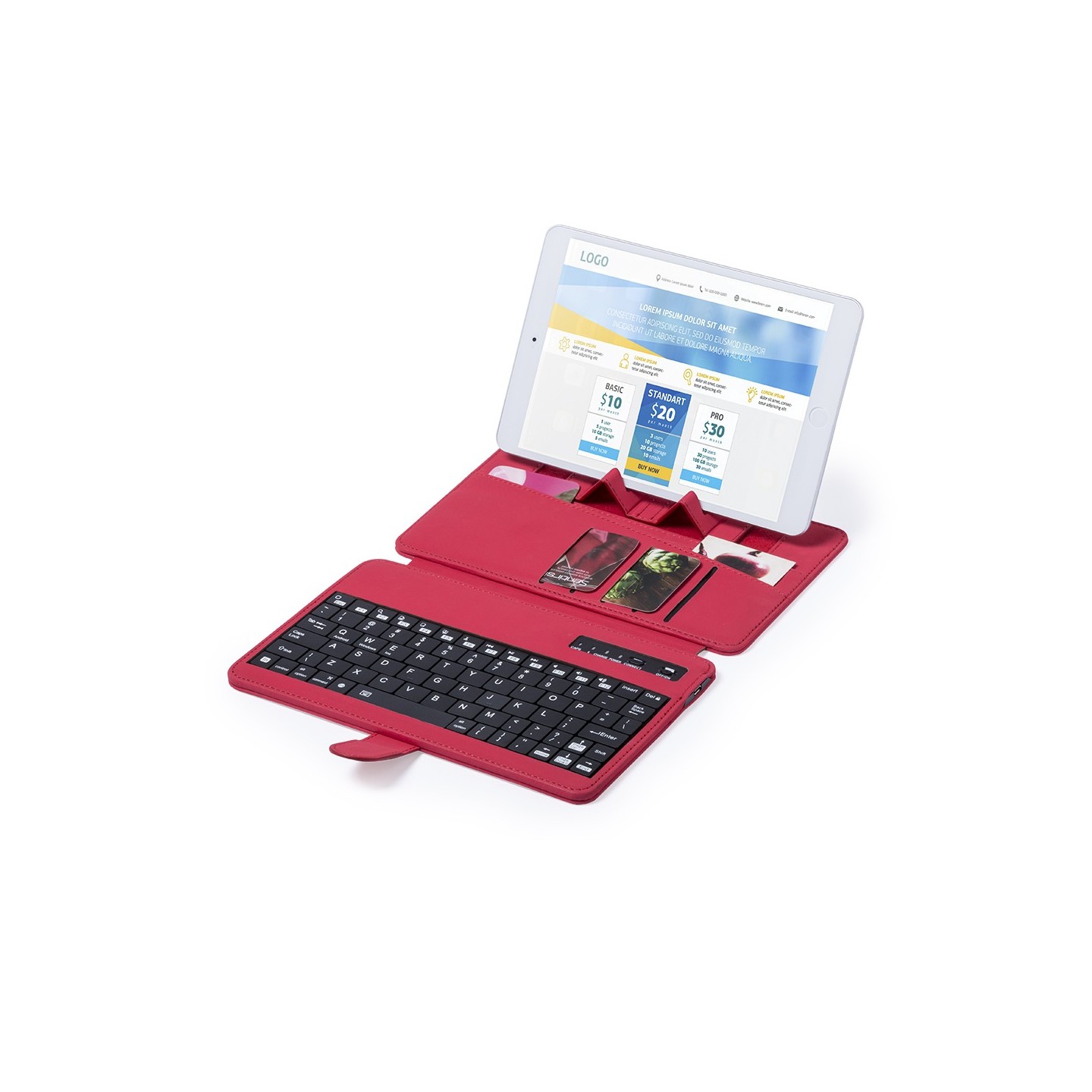 El Teclado Soporte Dustin tiene Bluetooth® y soporte para móvil en polipiel. Compacto, recargable y compatible con todos los sistemas. Personaliza para tu empresa.