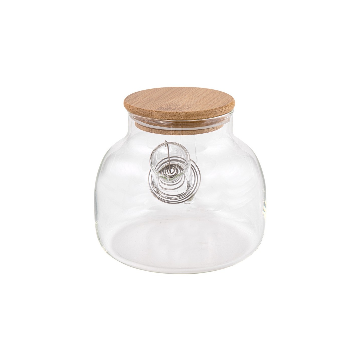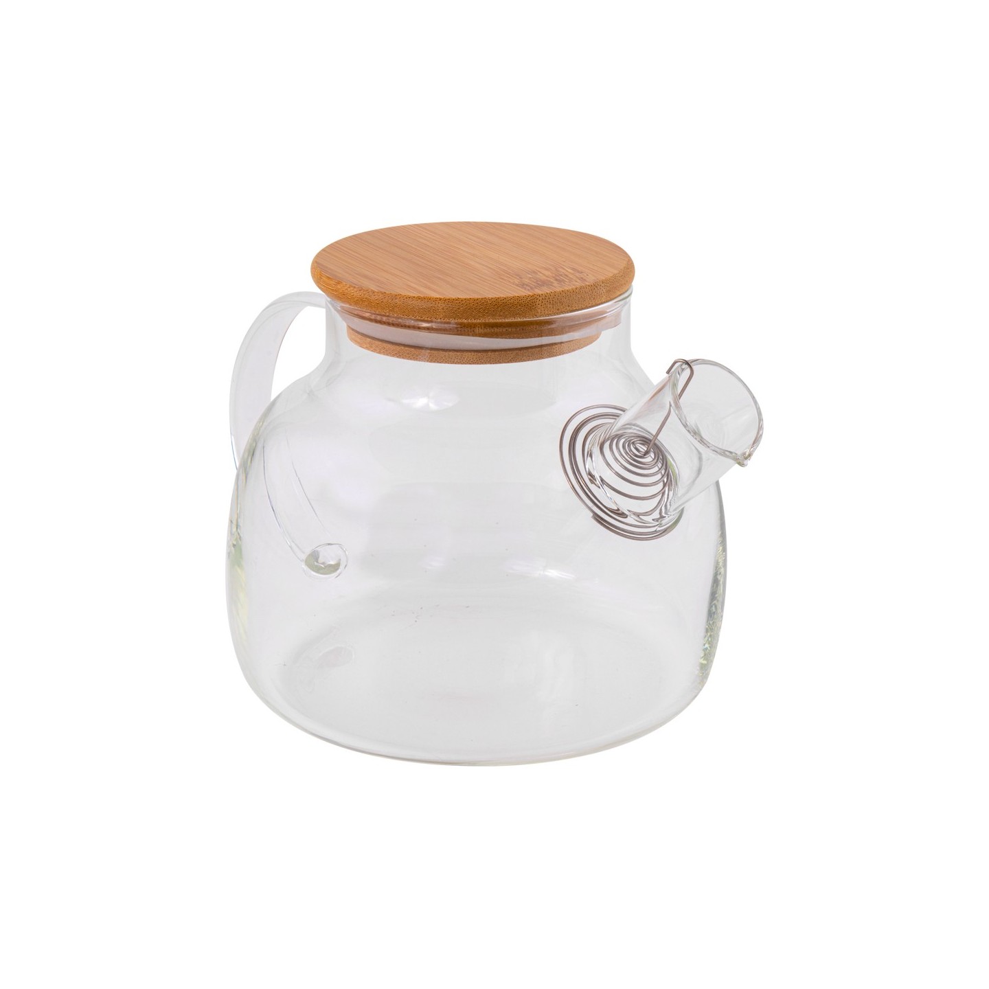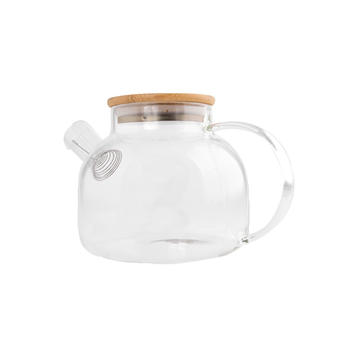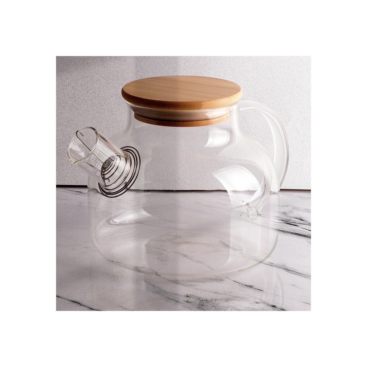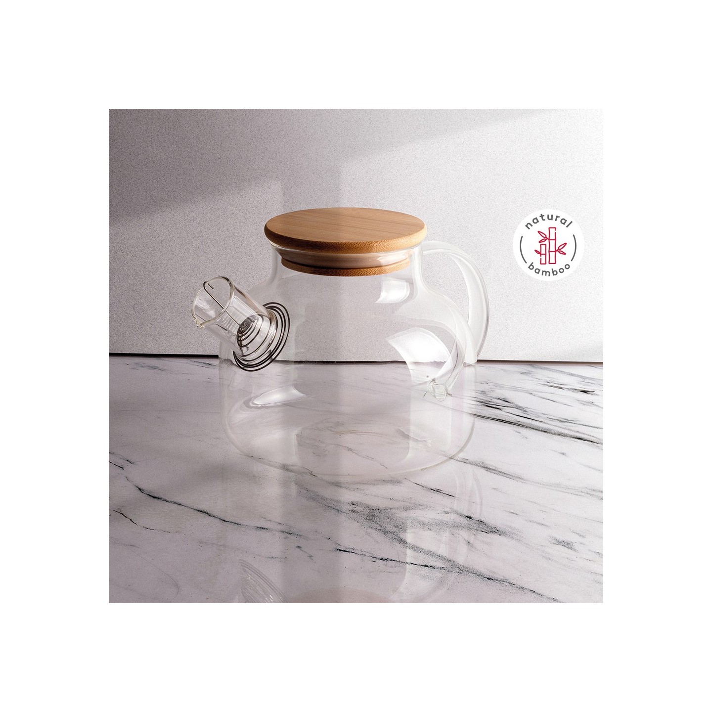 Tetera de borosilicato con tapa de bambú y filtro metálico. Capacidad 1 litro. Personalizable. Ideal para regalos corporativos.