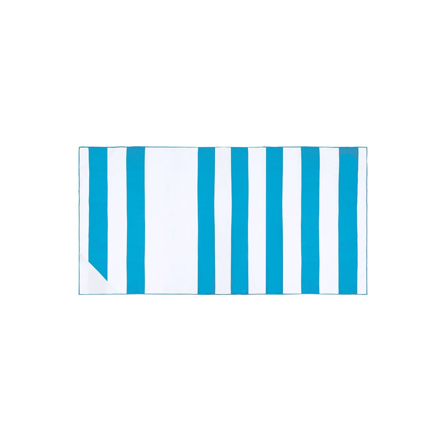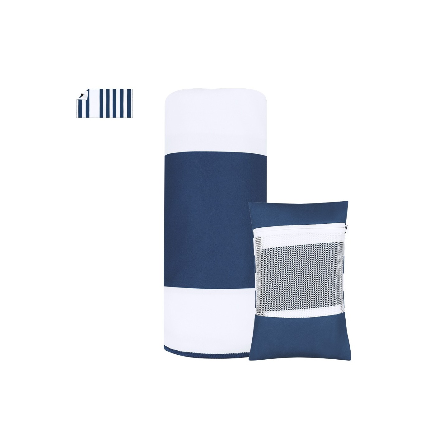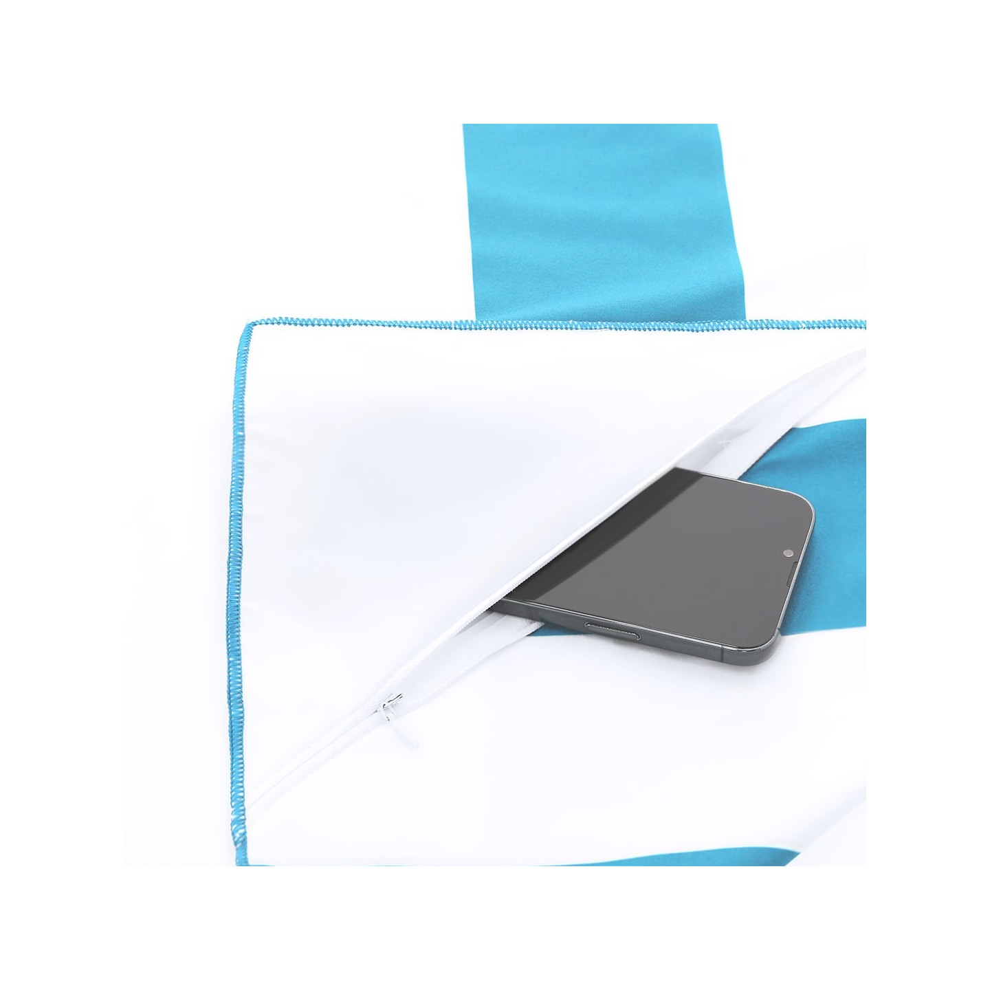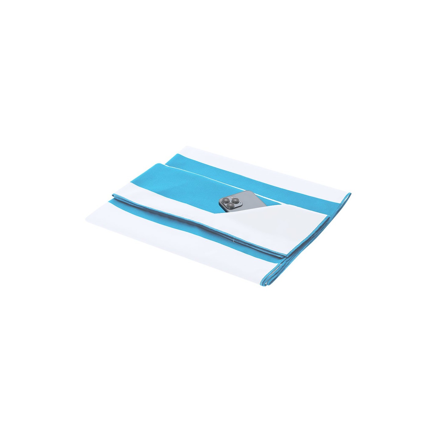 Toalla absorbente de poliéster con bolsillo impermeable y funda. Diseño a rayas, ideal para playa o piscina. Personalizable con tu logo.