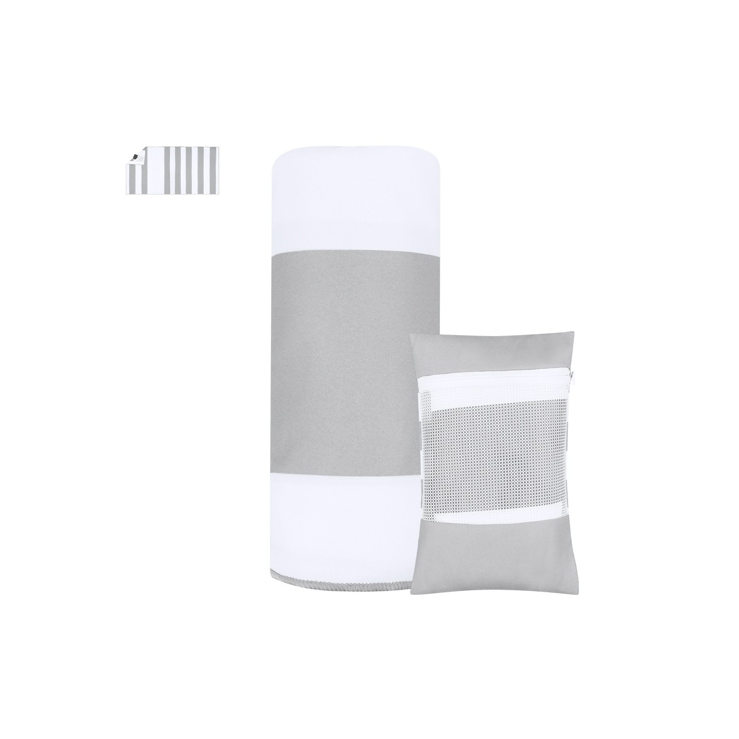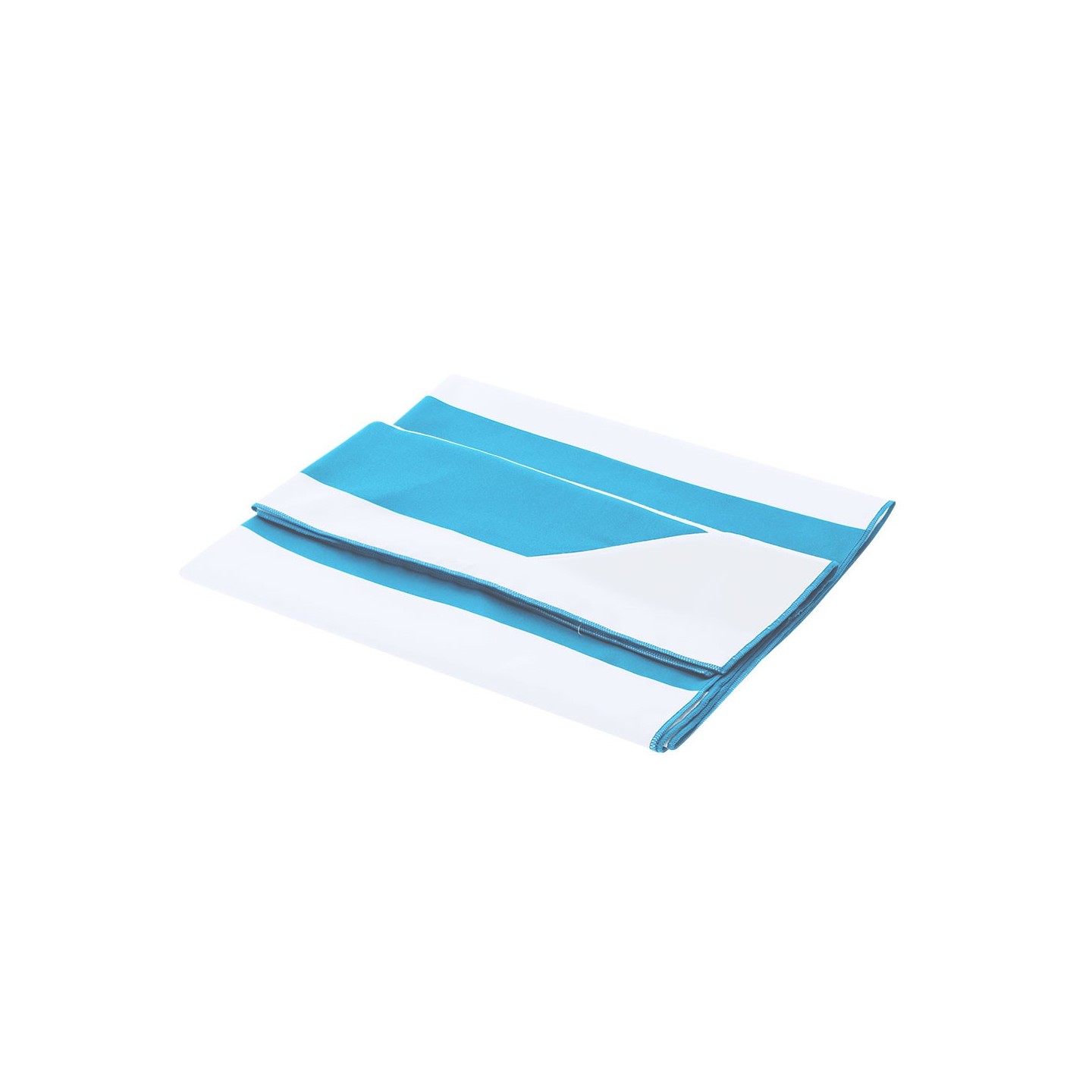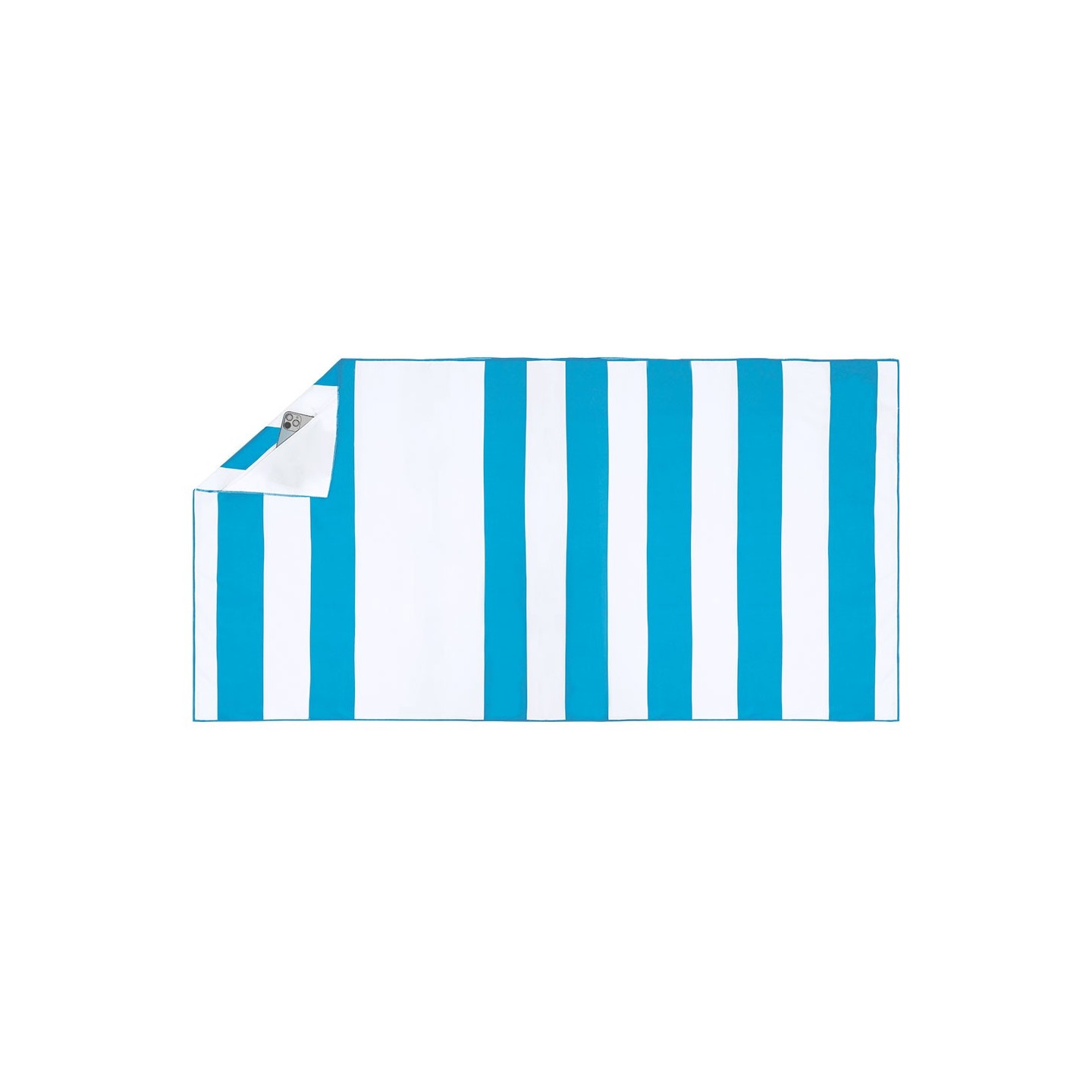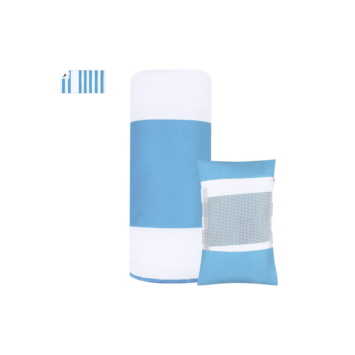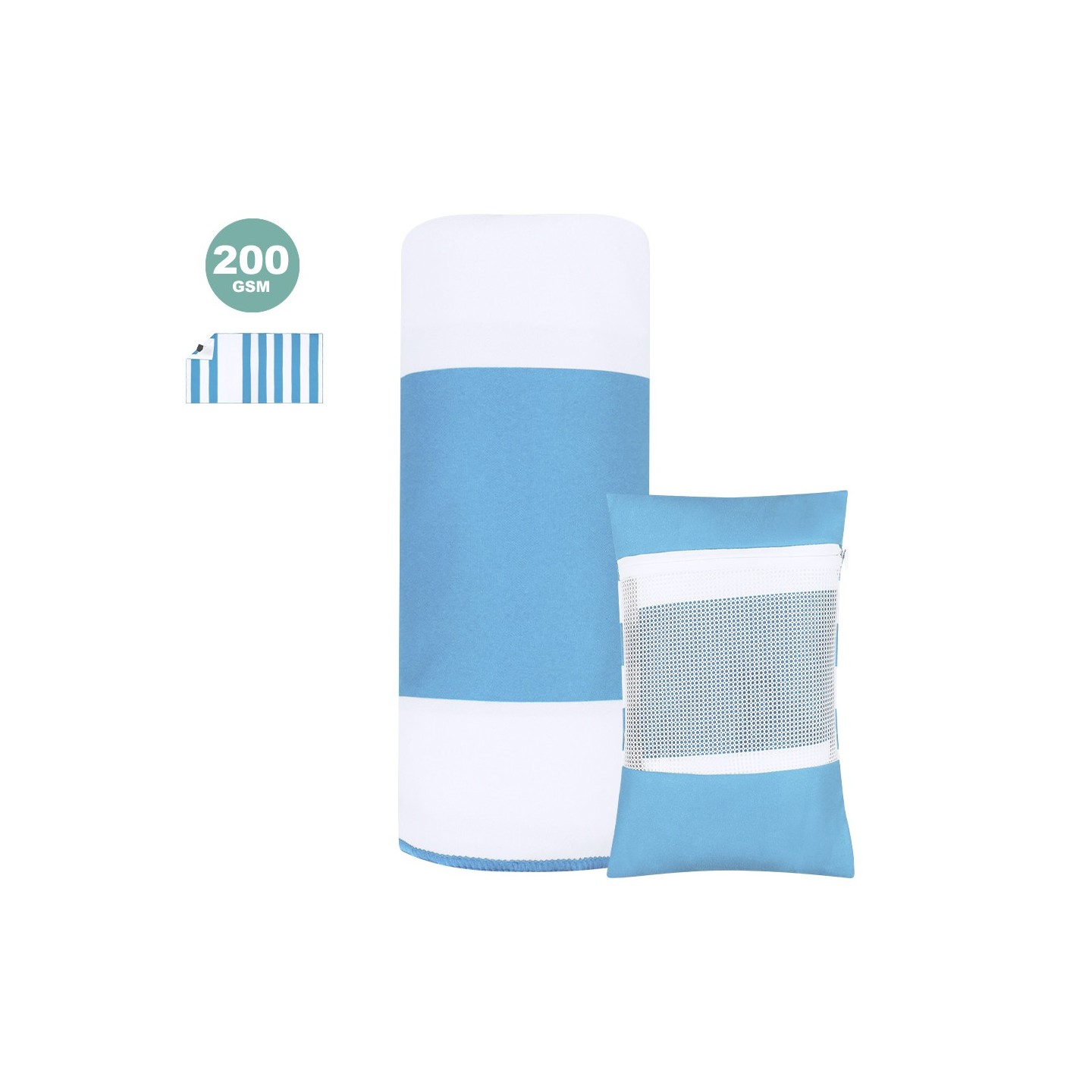Toalla absorbente de poliéster con bolsillo impermeable y funda. Diseño a rayas, ideal para playa o piscina. Personalizable con tu logo.
