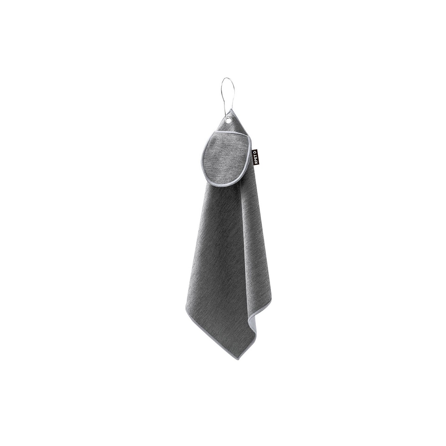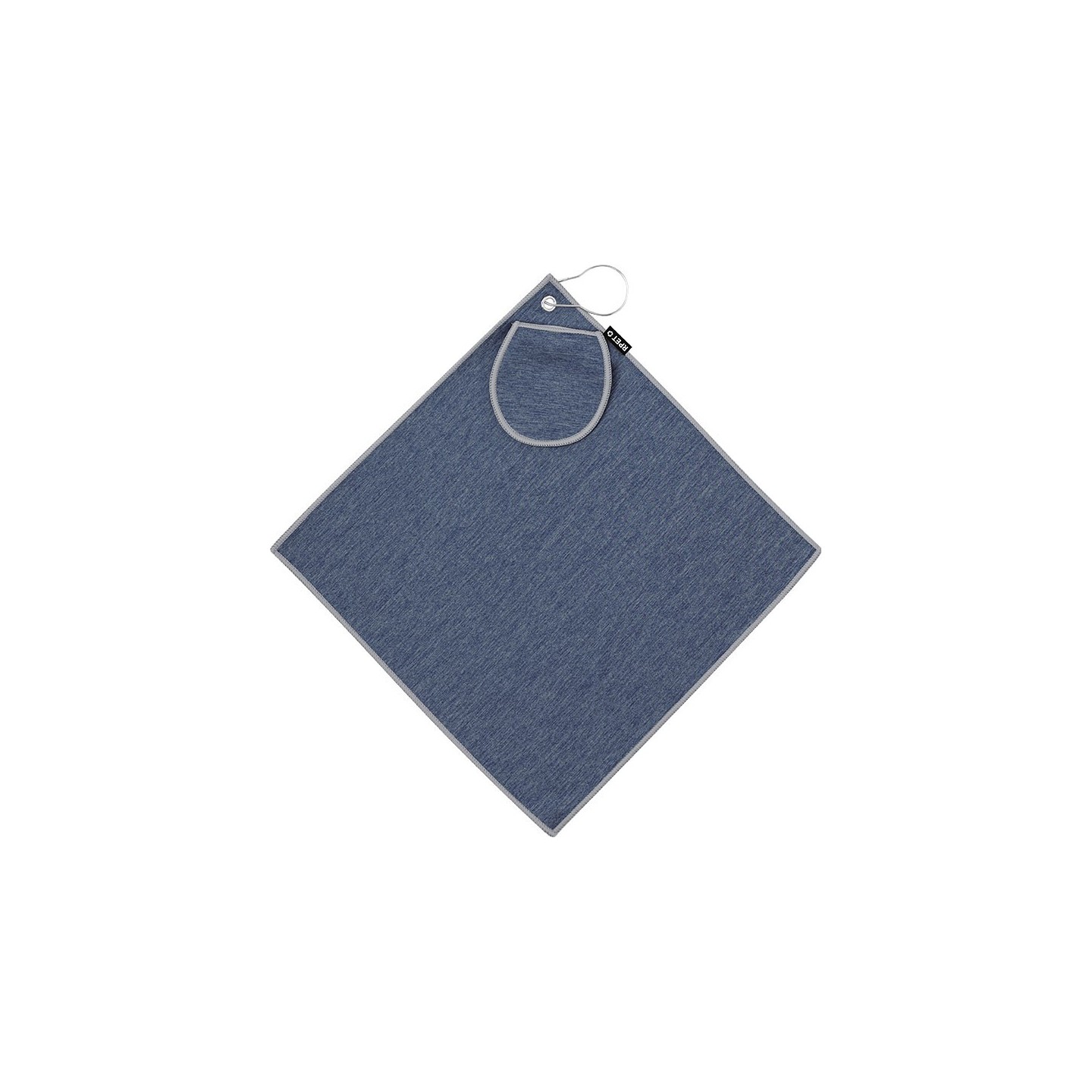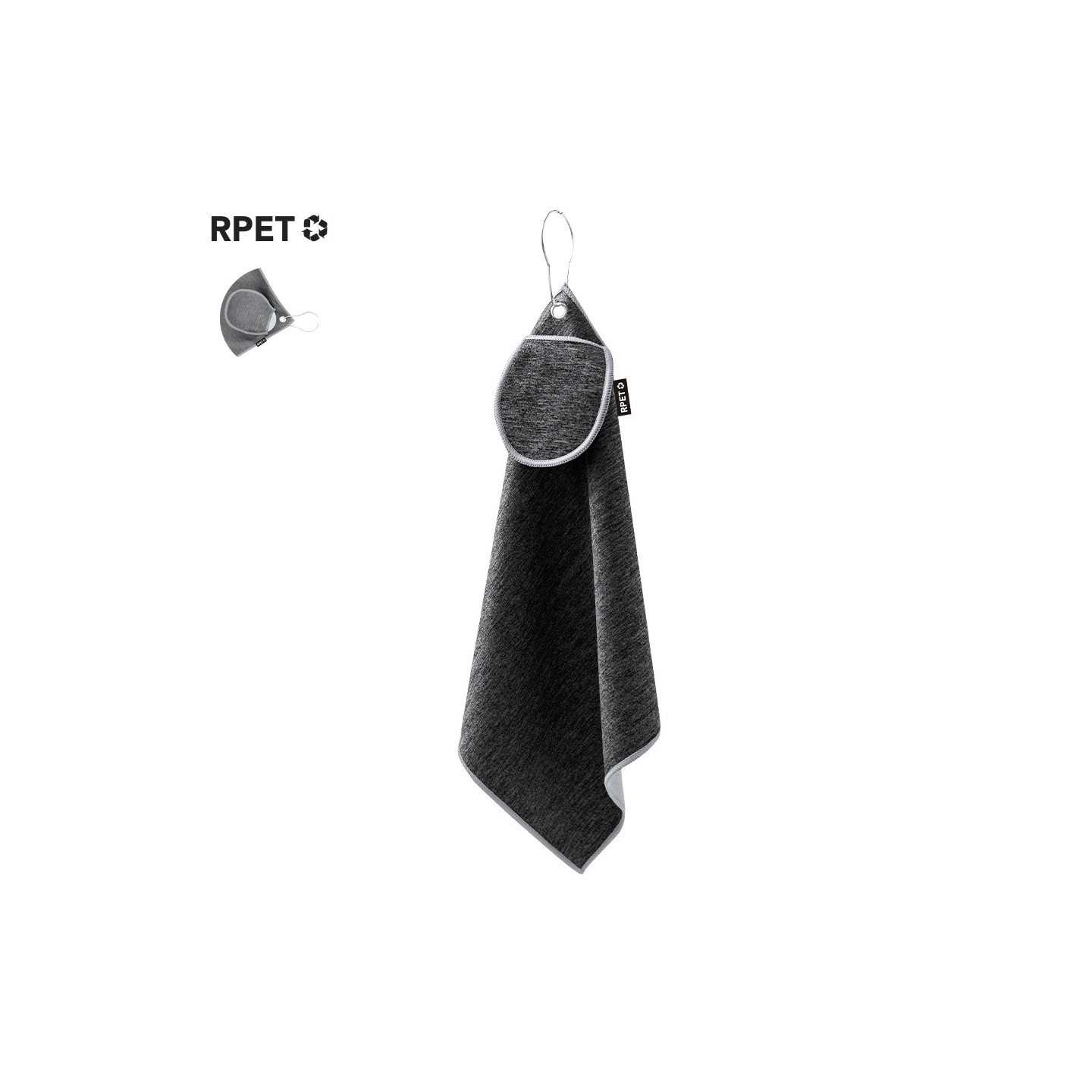 Toalla de golf CANROCK, fabricada en 100% Poliéster RPET, con doble textura, bolsillo para pelotas y mosquetón. Personalizable con tu logotipo. Ecológica y práctica.