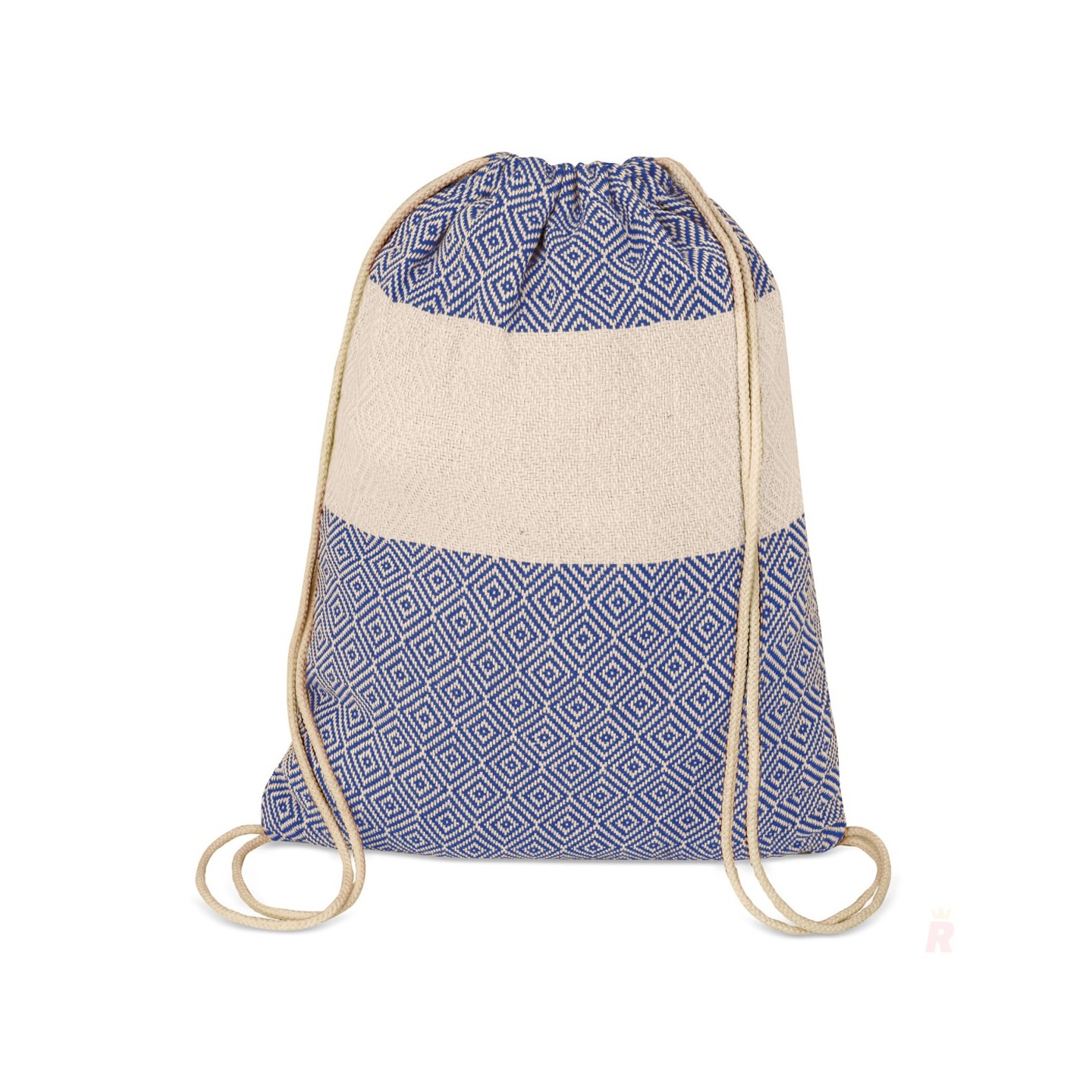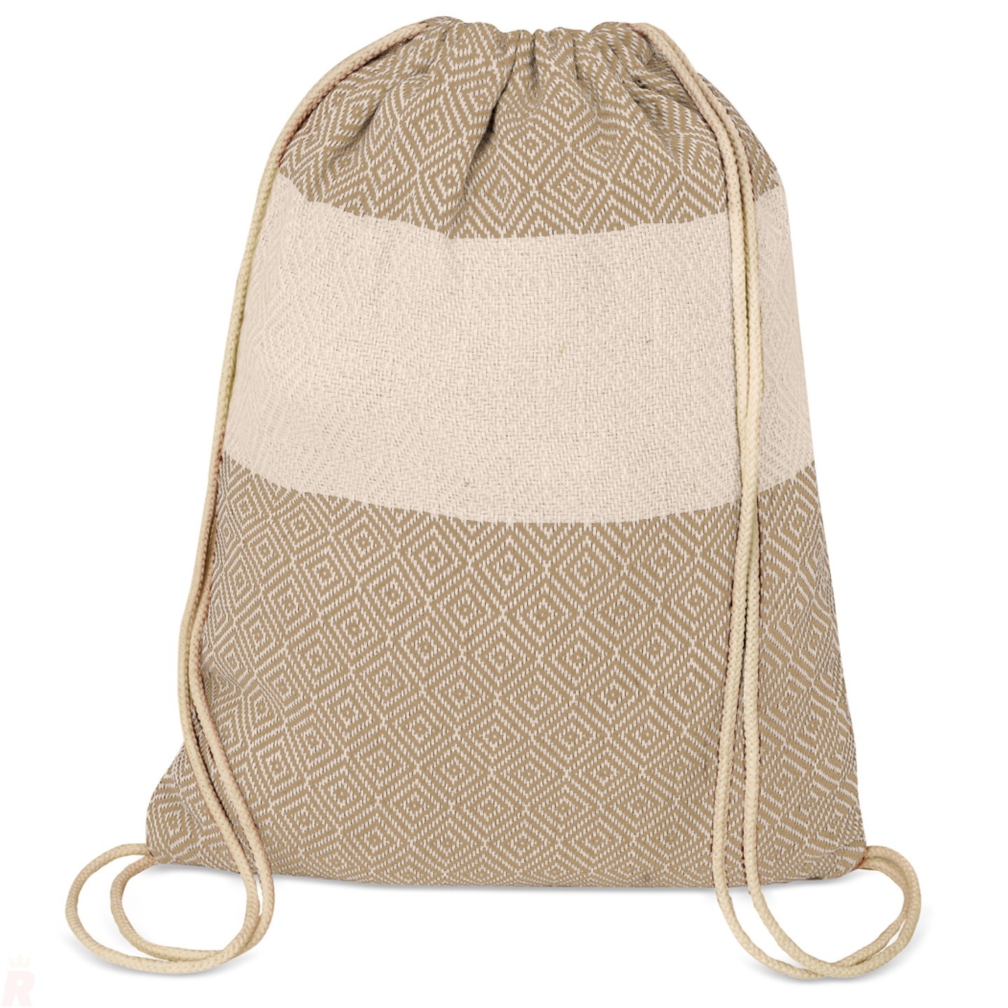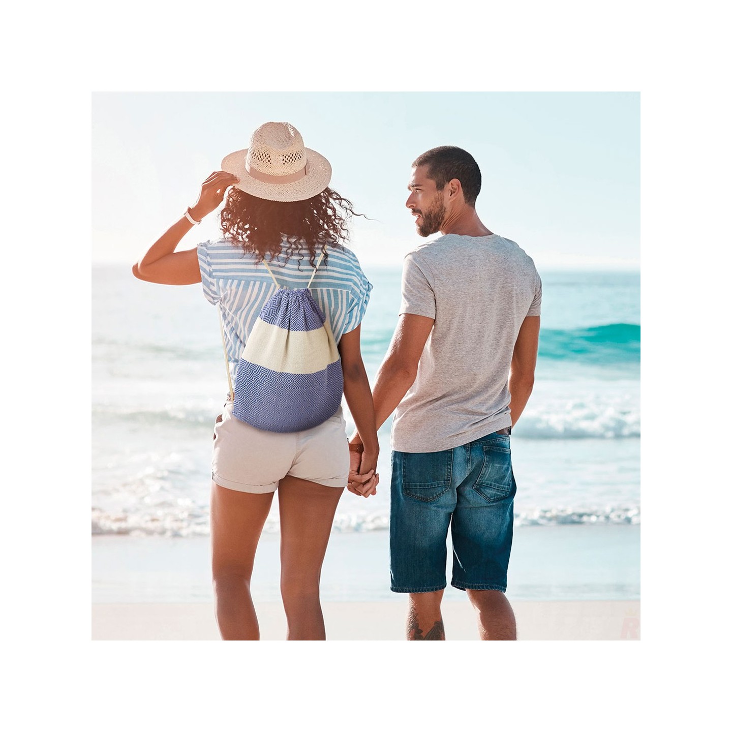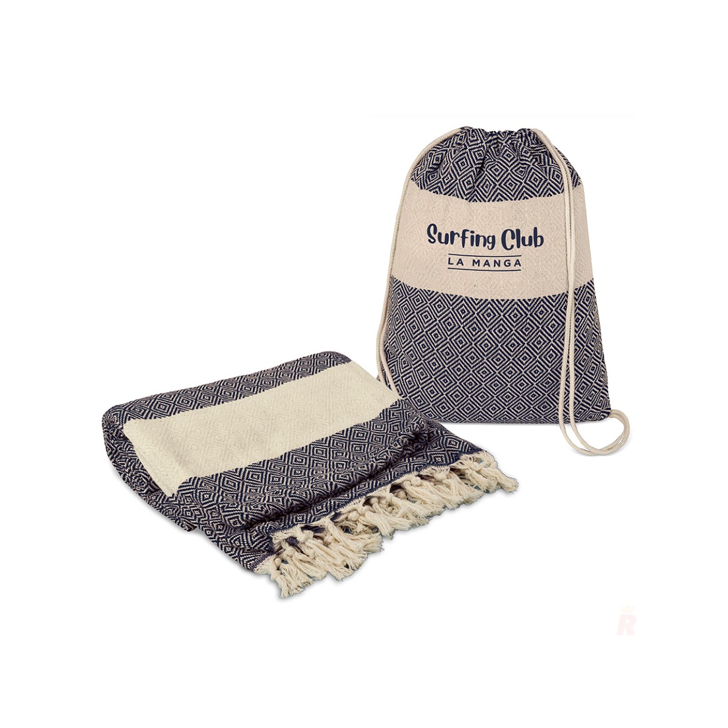 Toalla convertible en mochila, fabricada en algodón reciclado y orgánico. Suave, ecológica y práctica para regalar a clientes o empleados con logotipo personalizado