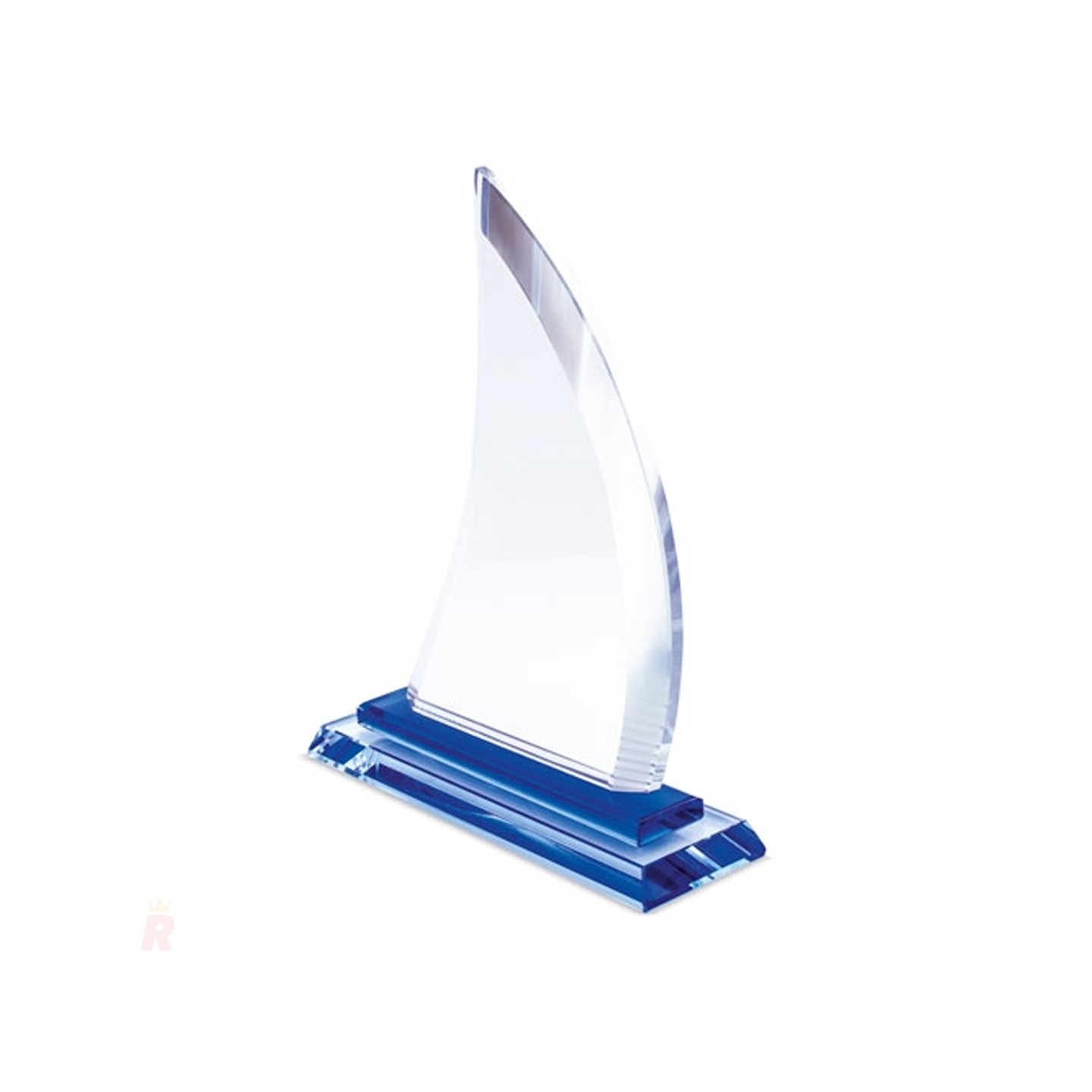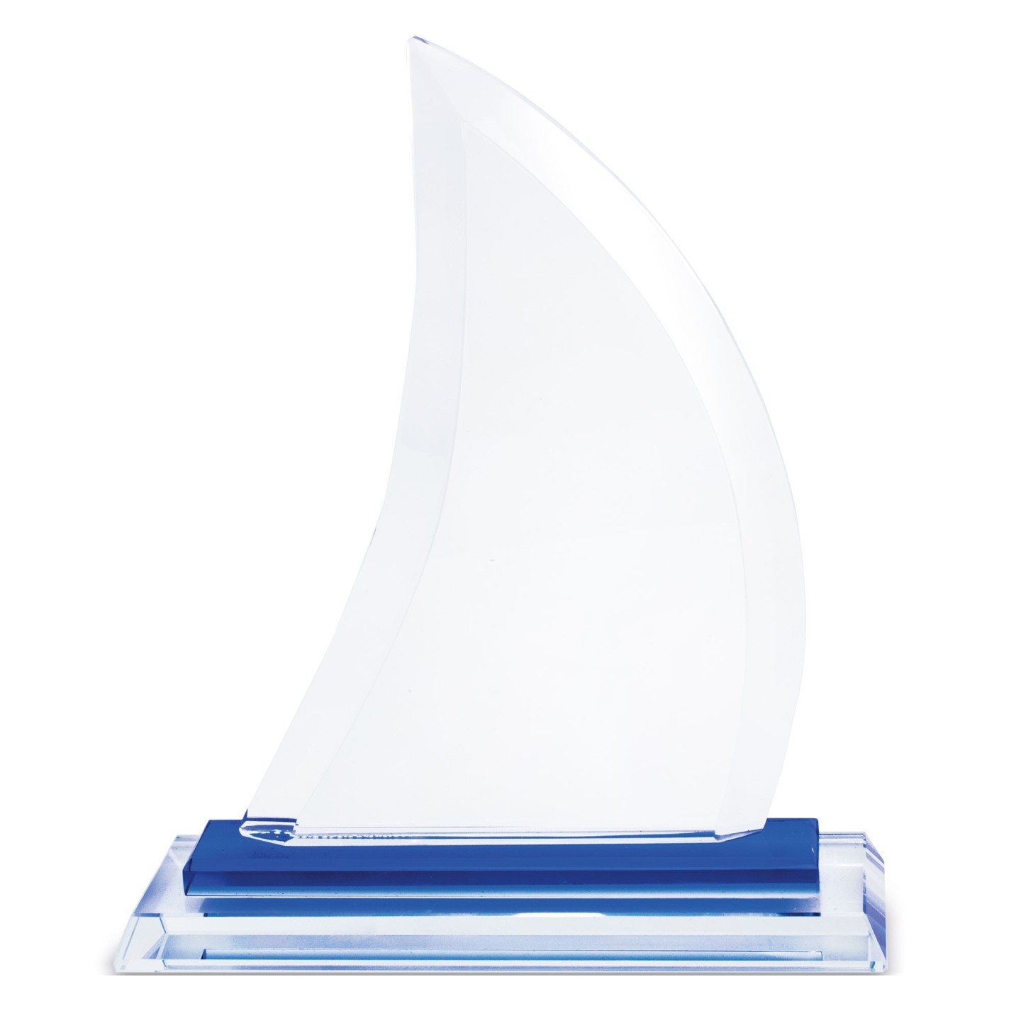 Este trofeo destaca por su original diseño en forma de barco velero, con líneas curvas y fluidas que evocan el movimiento del viento en la vela, transmitiendo una sensación de dinamismo y progreso. Su base rectangular combina tonos azul y transparente, creando un contraste visual atractivo que realza su presencia.