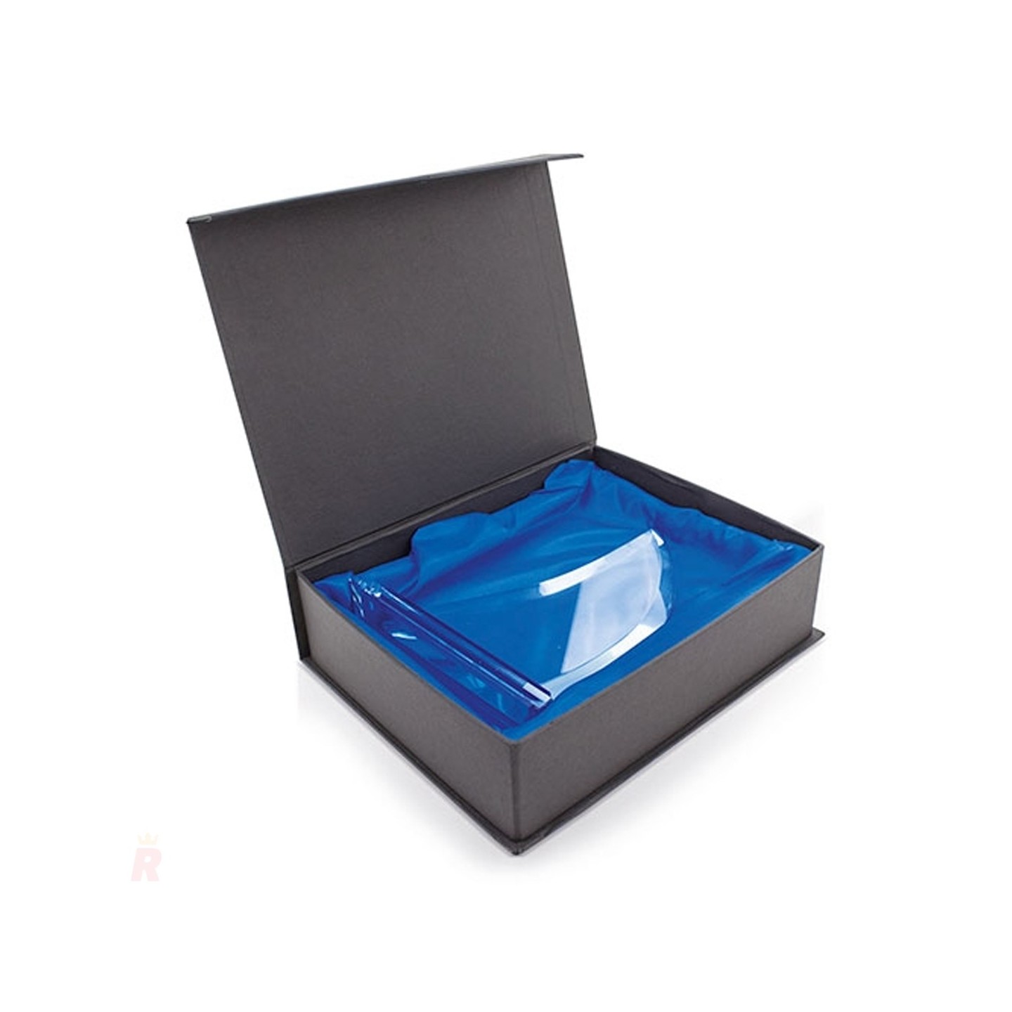 Trofeo de cristal en forma de velero con base azul y transparente. Diseño elegante y dinámico, ideal para eventos náuticos o de liderazgo. Incluye estuche de regalo con forro de raso y cierre imantado.
