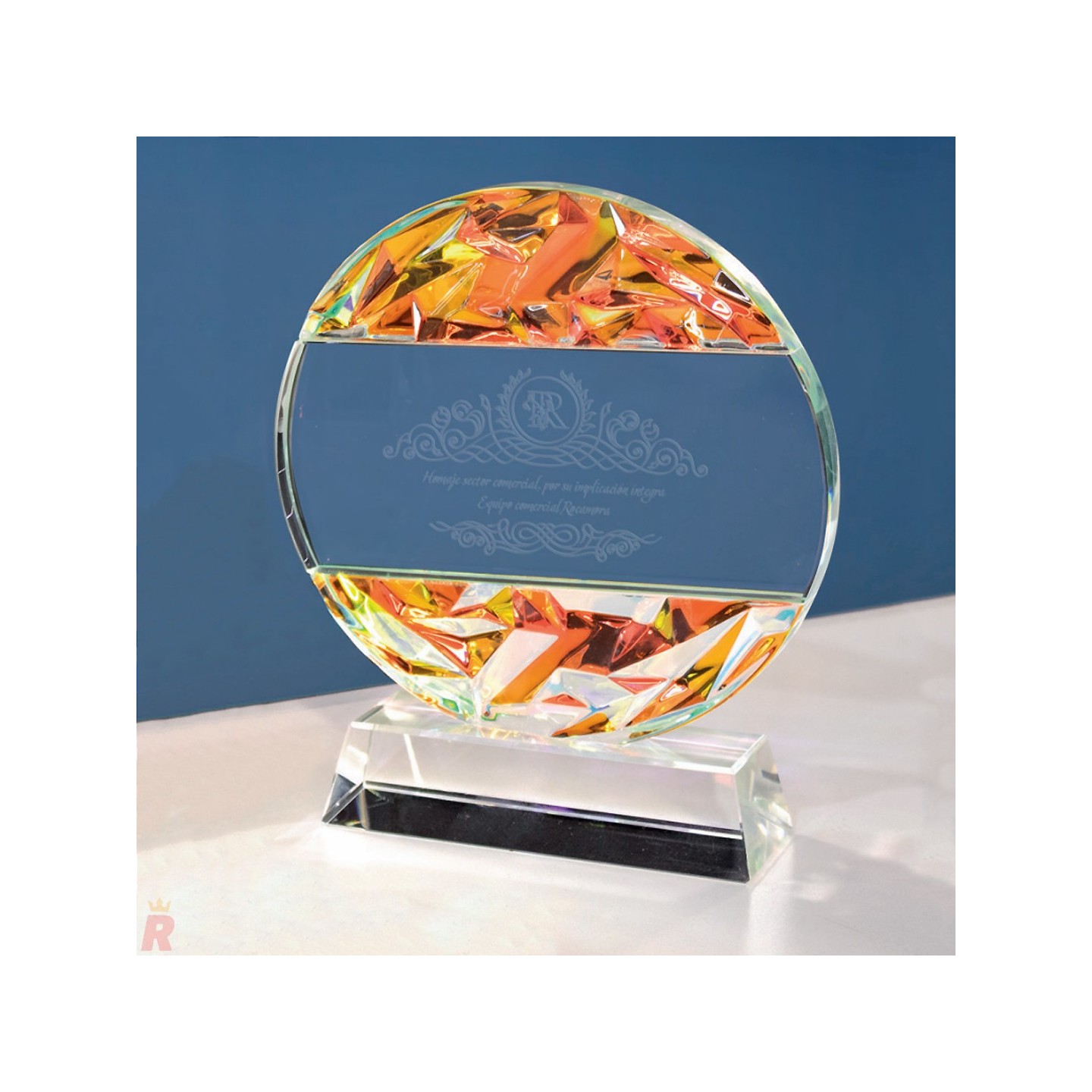 Este elegante trofeo tiene una forma circular, con fragmentos de cristal en tonalidades cambiantes que crean un efecto brillante y dinámico. Su base rectangular de cristal transparente aporta estabilidad y un toque sofisticado, ideal para ceremonias de premiación, galardones empresariales y reconocimientos especiales.