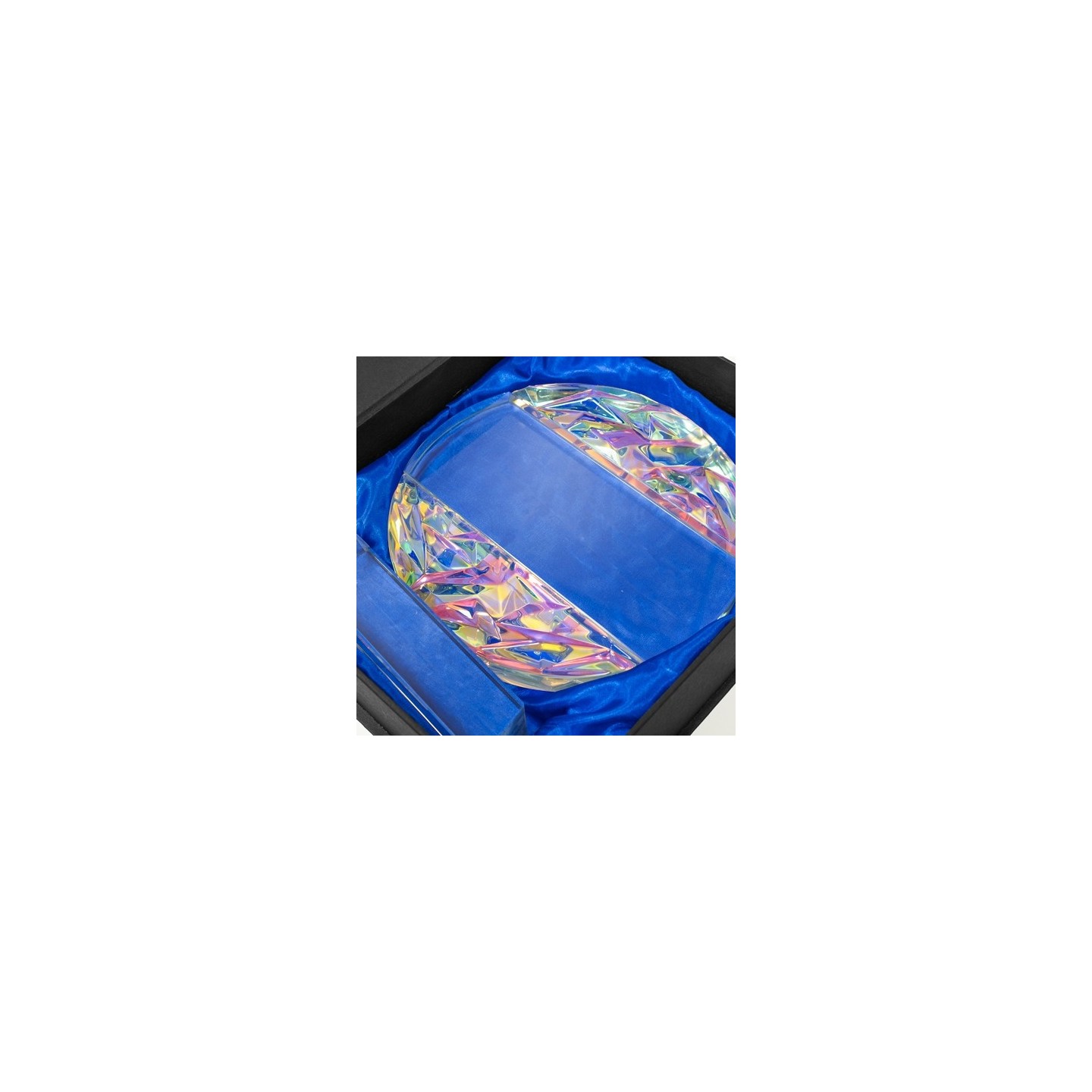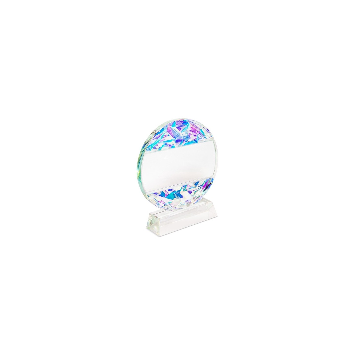 Trofeo de cristal con reflejos de colores según el ángulo de visión. Diseño circular con base transparente. Presentado en estuche acolchado con cierre imantado.