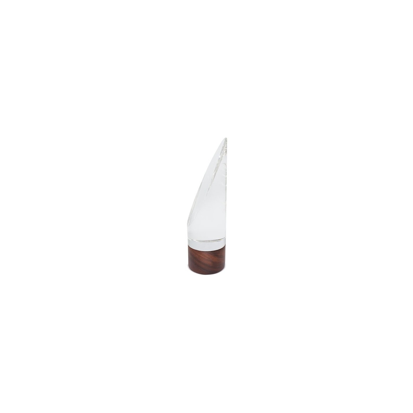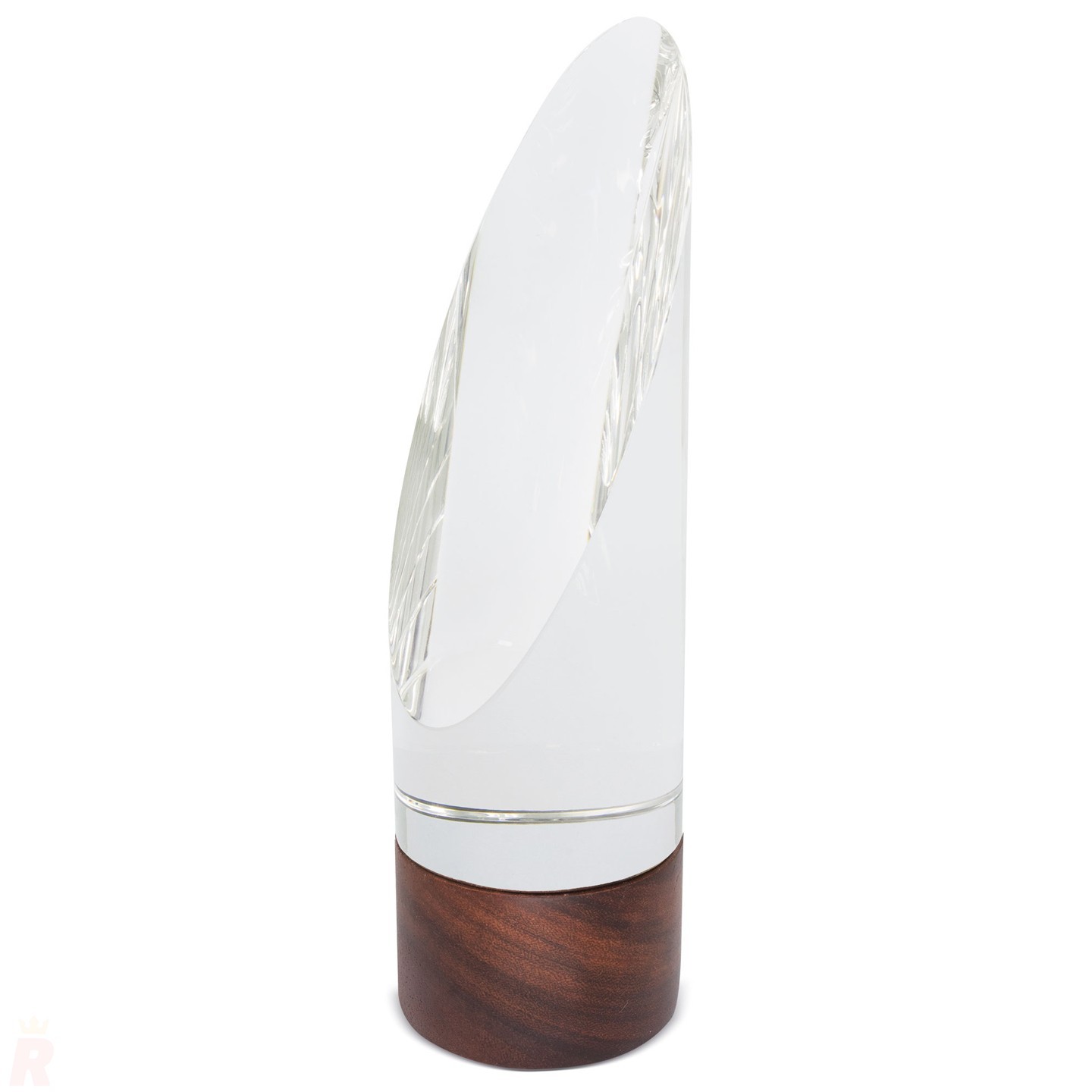 La base está elaborada en madera oscura, aportando solidez y un contraste refinado con el cilindro de cristal cortado en inglete que se eleva majestuosamente, evocando la forma de una estalagmita. Esta combinación de materiales y formas transmite una sensación de crecimiento y fortaleza, simbolizando el esfuerzo y la dedicación recompensados.