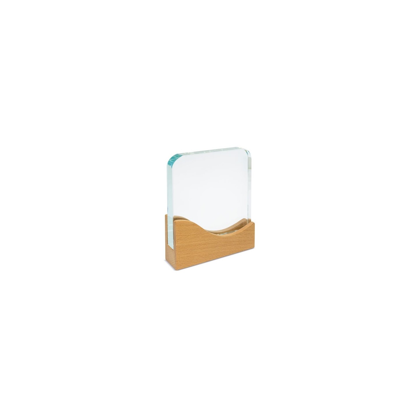 La base está elaborada en madera de alta calidad, aportando solidez y un contraste cálido con la estructura principal de cristal. La figura de cristal adopta una forma rectangular con esquinas redondeadas, ofreciendo una estética contemporánea y suave que simboliza la armonía y la excelencia.