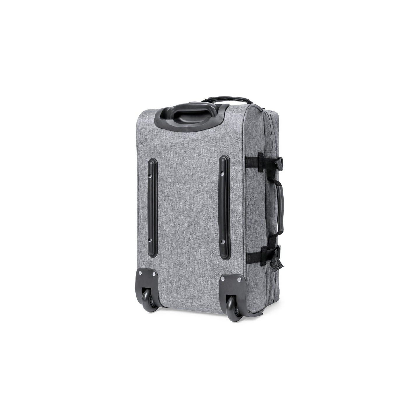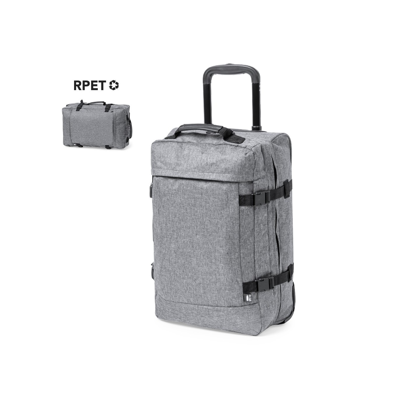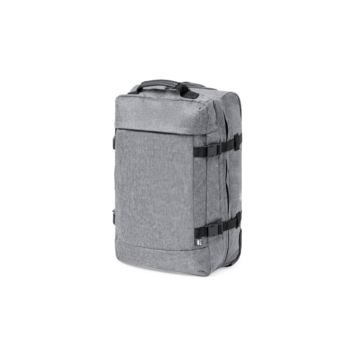Trolley nature de resistente poliéster RPET con cierre TSA y compartimento principal forrado con cintas elásticas. Cuenta con 2 ruedas, 2 asas acolchadas, cintas ajustables y bolsillo frontal con cremallera.
