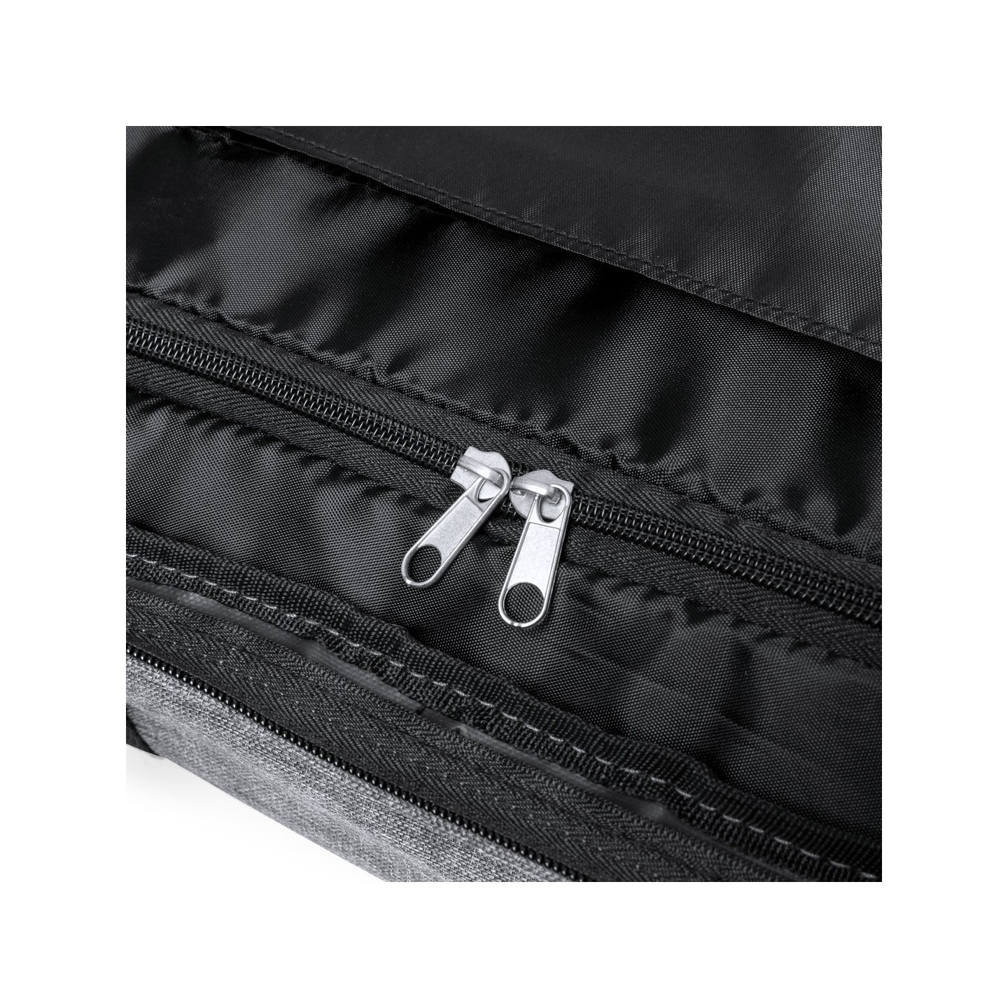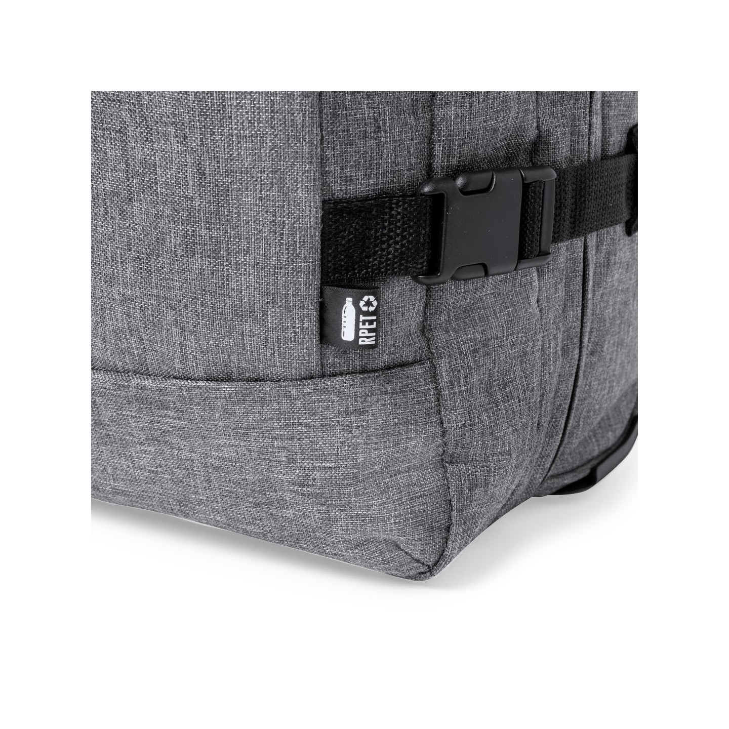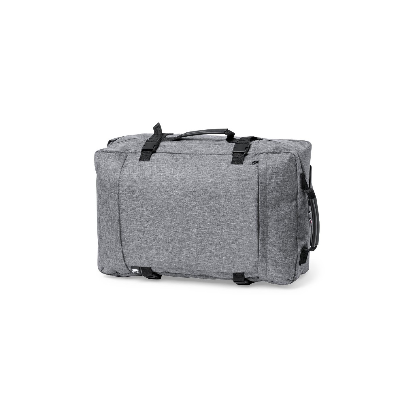 Trolley nature de resistente poliéster RPET con cierre TSA y compartimento principal forrado con cintas elásticas. Cuenta con 2 ruedas, 2 asas acolchadas, cintas ajustables y bolsillo frontal con cremallera.