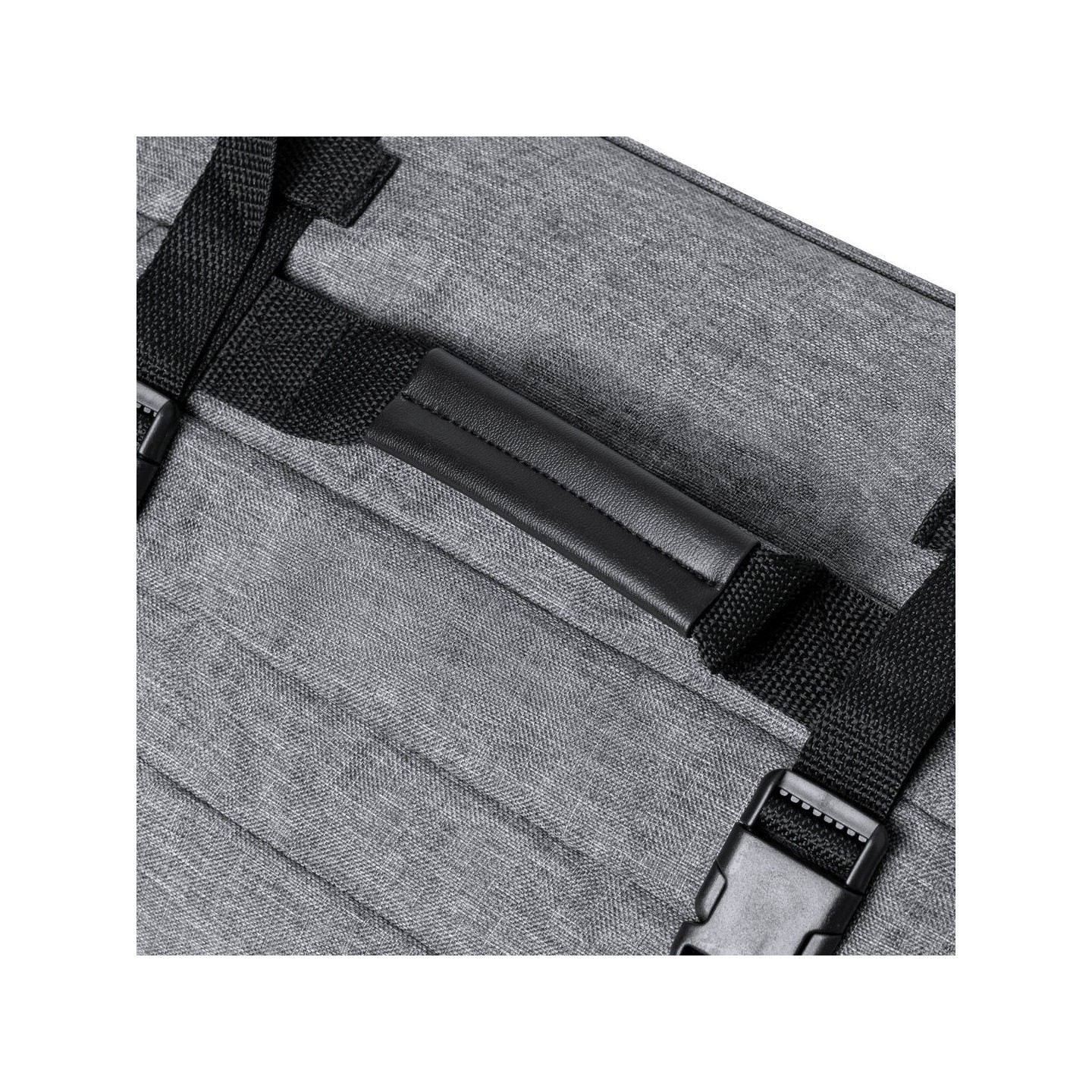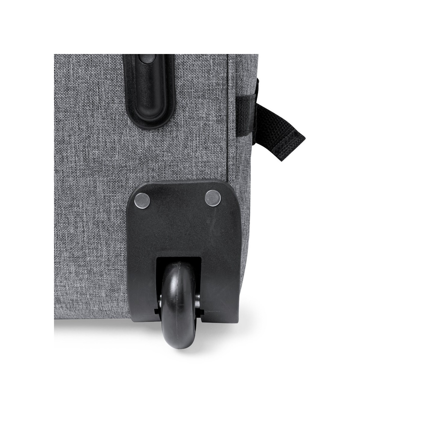 El trolley está fabricado en resistente poliéster 300D RPET y cuenta con un interior forrado y cintas elásticas para sujetar la ropa y otros objetos durante el transporte. En el exterior, cuenta con dos cintas ajustables, cierres de hebilla, un bolsillo frontal con cremallera invisible y dos asas acolchadas para transportarlo con comodidad.