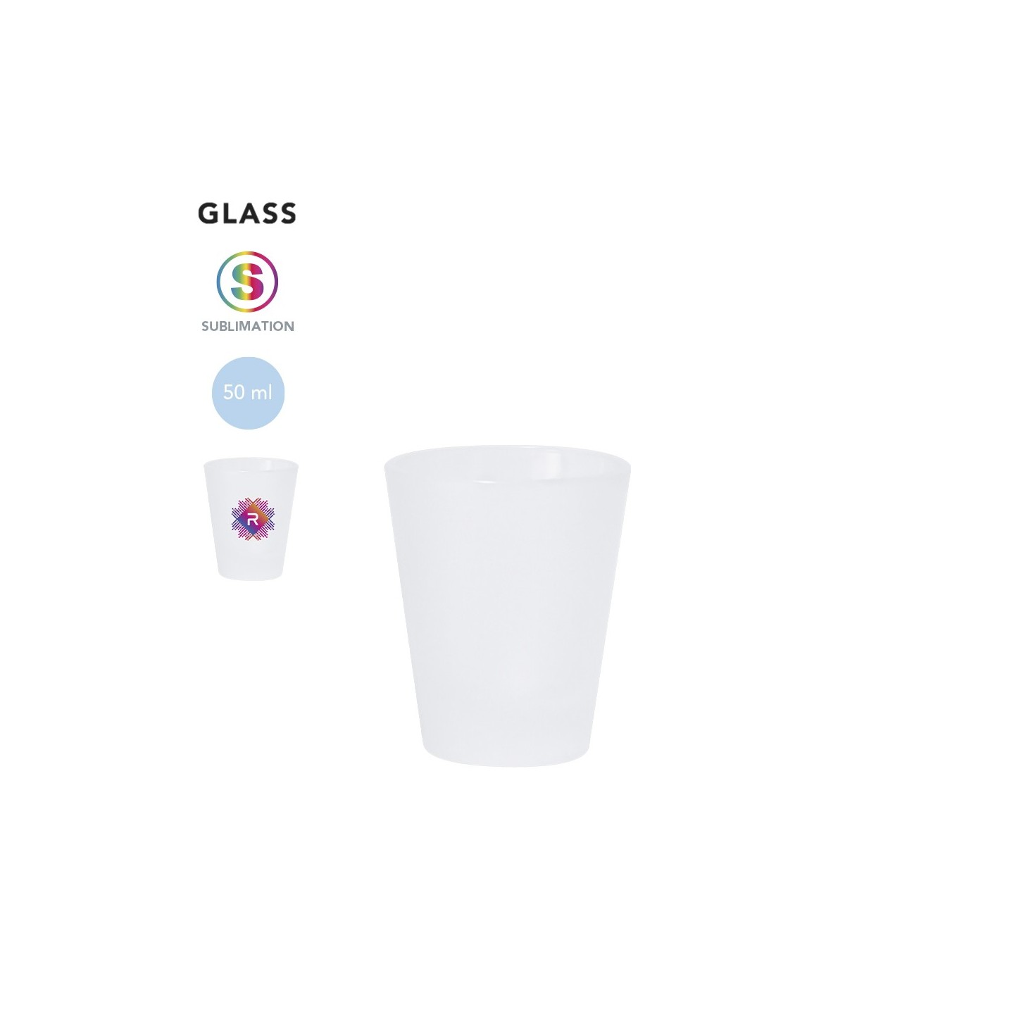 Vaso de chupito de 50 ml en cristal frosted, ideal para sublimación. Personalizable con tu logotipo, perfecto para promociones y eventos.