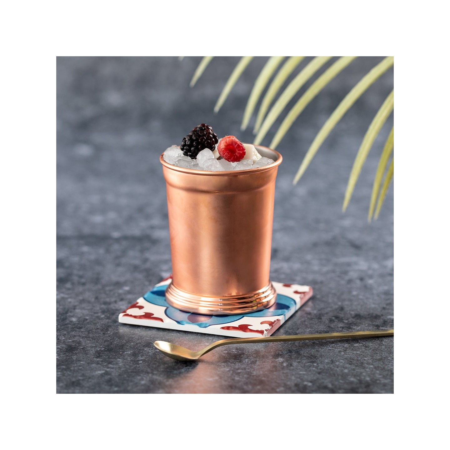 El vaso Riberton es una opción perfecta para disfrutar tus bebidas favoritas. Con una capacidad de 400 ml, está fabricado en acero inoxidable con un atractivo recubrimiento de cobre galvanizado en su exterior.