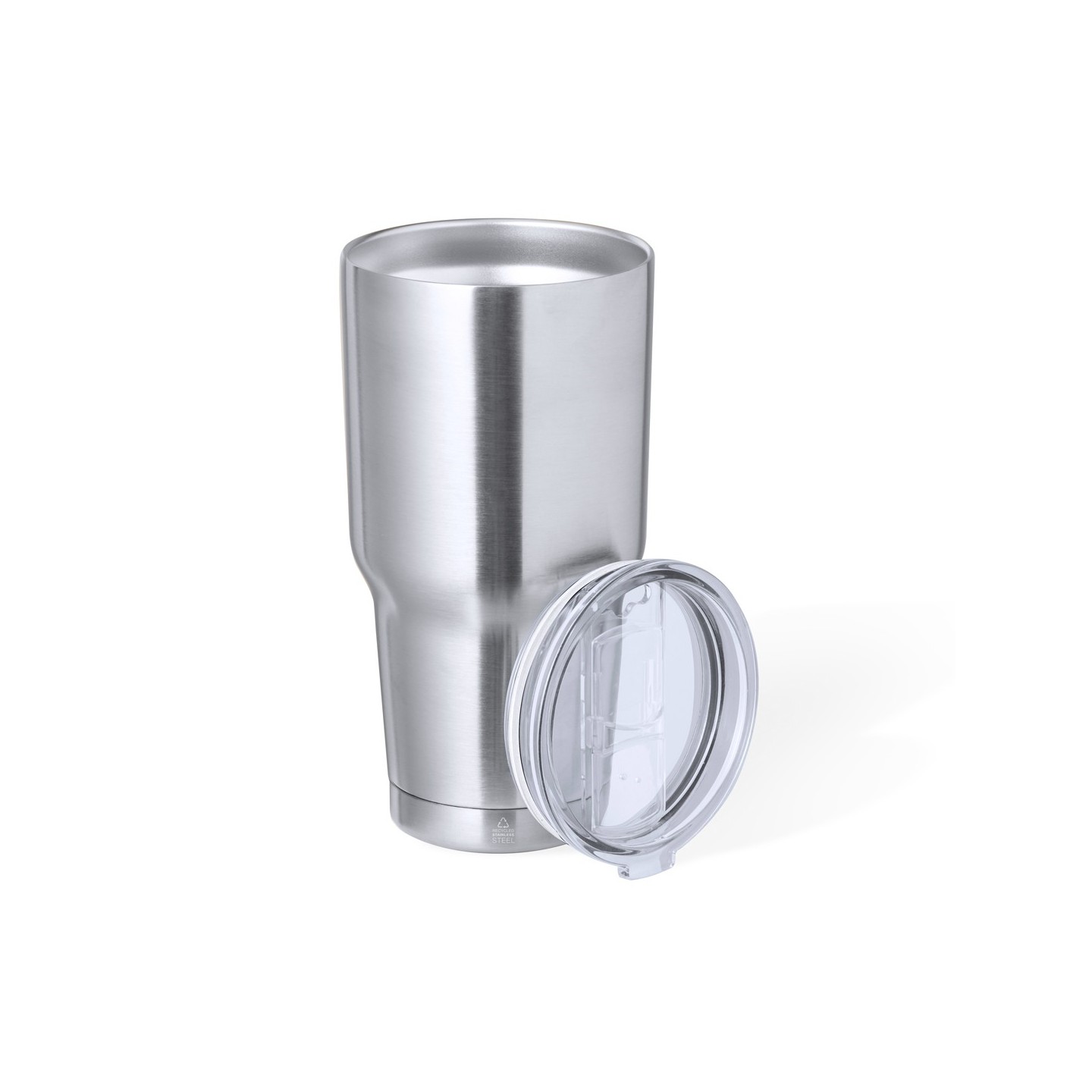 Vaso térmico de sobremesa fabricado en acero inox reciclado de doble pared y 800 ml de capacidad. Con dosificador en tapa con abrefácil, libre de BPA, en acabado plata. Con logotipo Acero Inox Reciclado. Presentado en caja individual de diseño kraft.