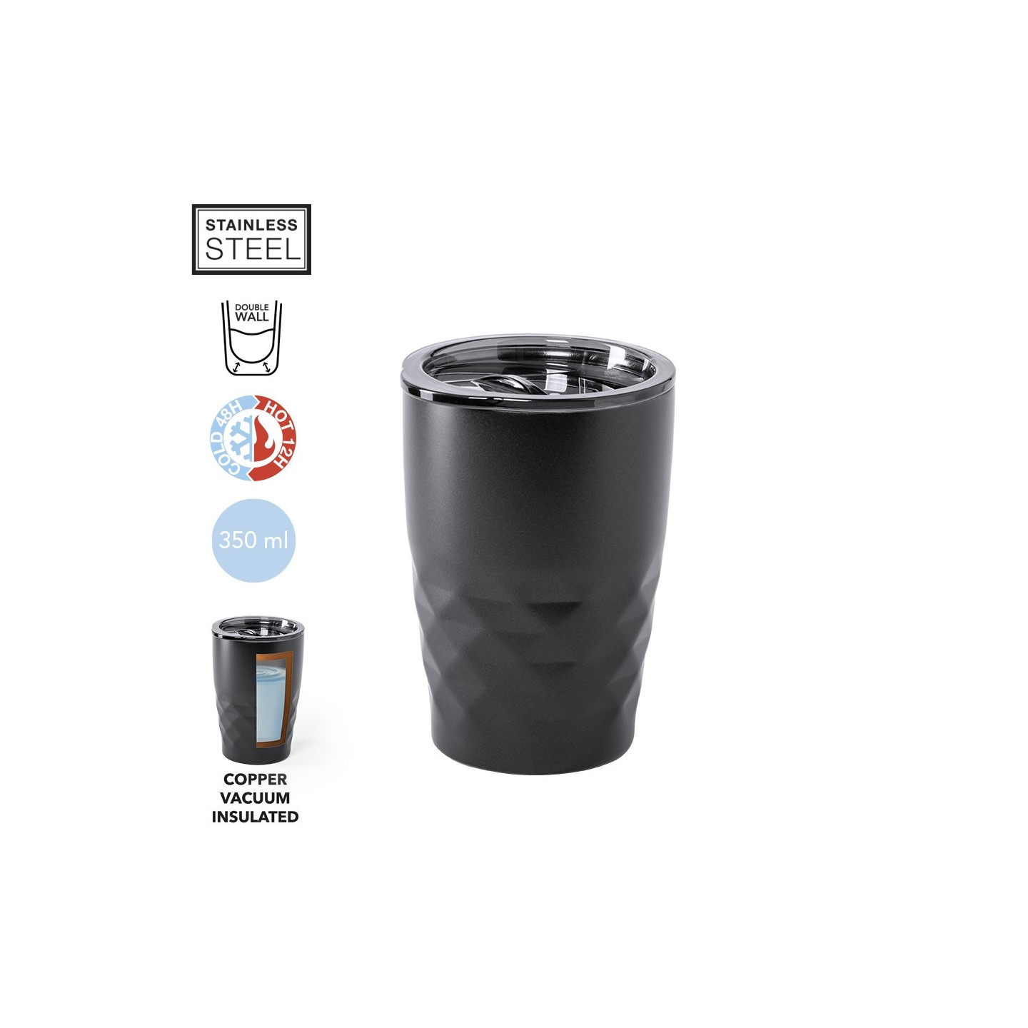 El Vaso Térmico Blur es de acero inoxidable, doble capa y aislamiento de cobre al vacío. Mantén tus bebidas calientes por 8 horas y frías por 24 horas. 350ml de capacidad.