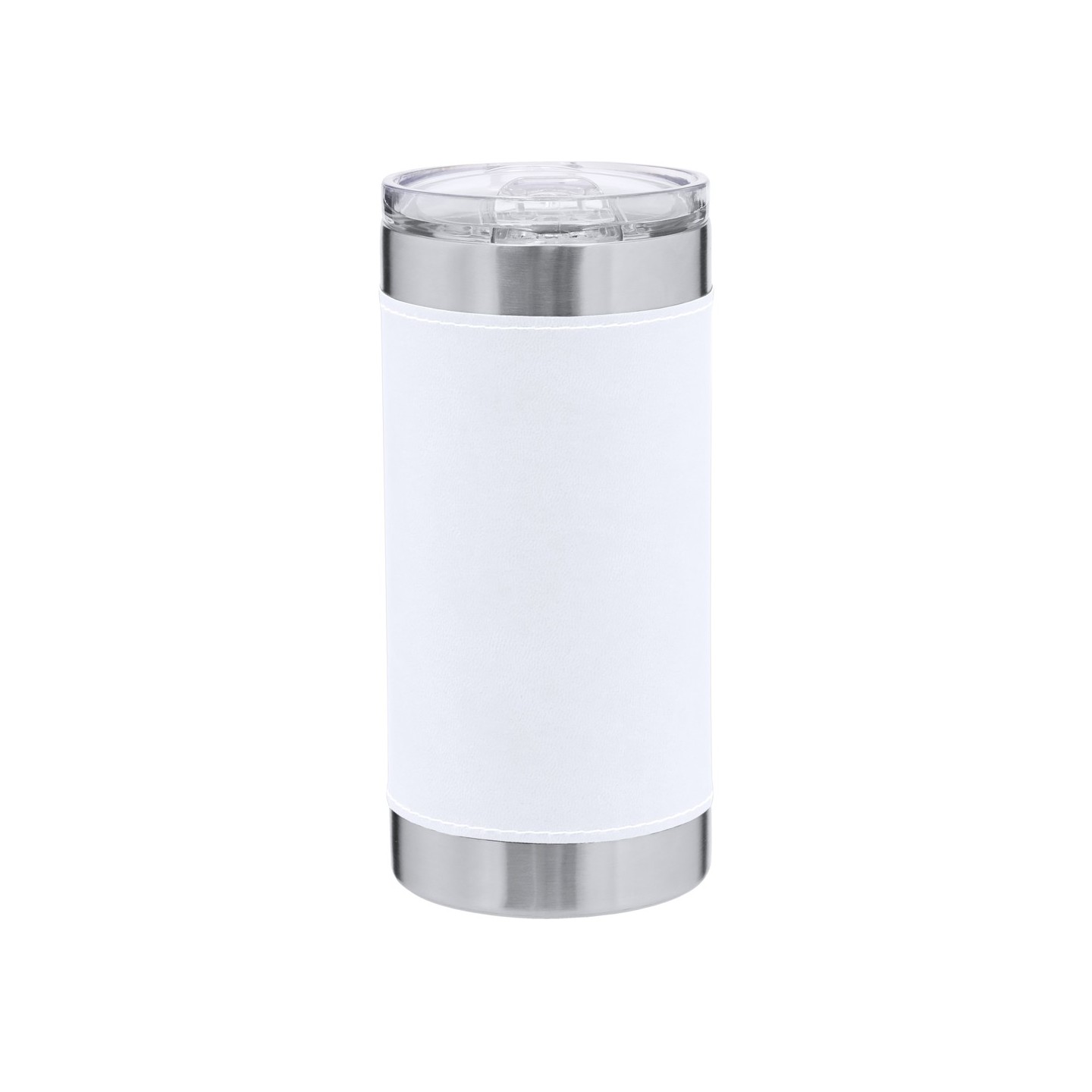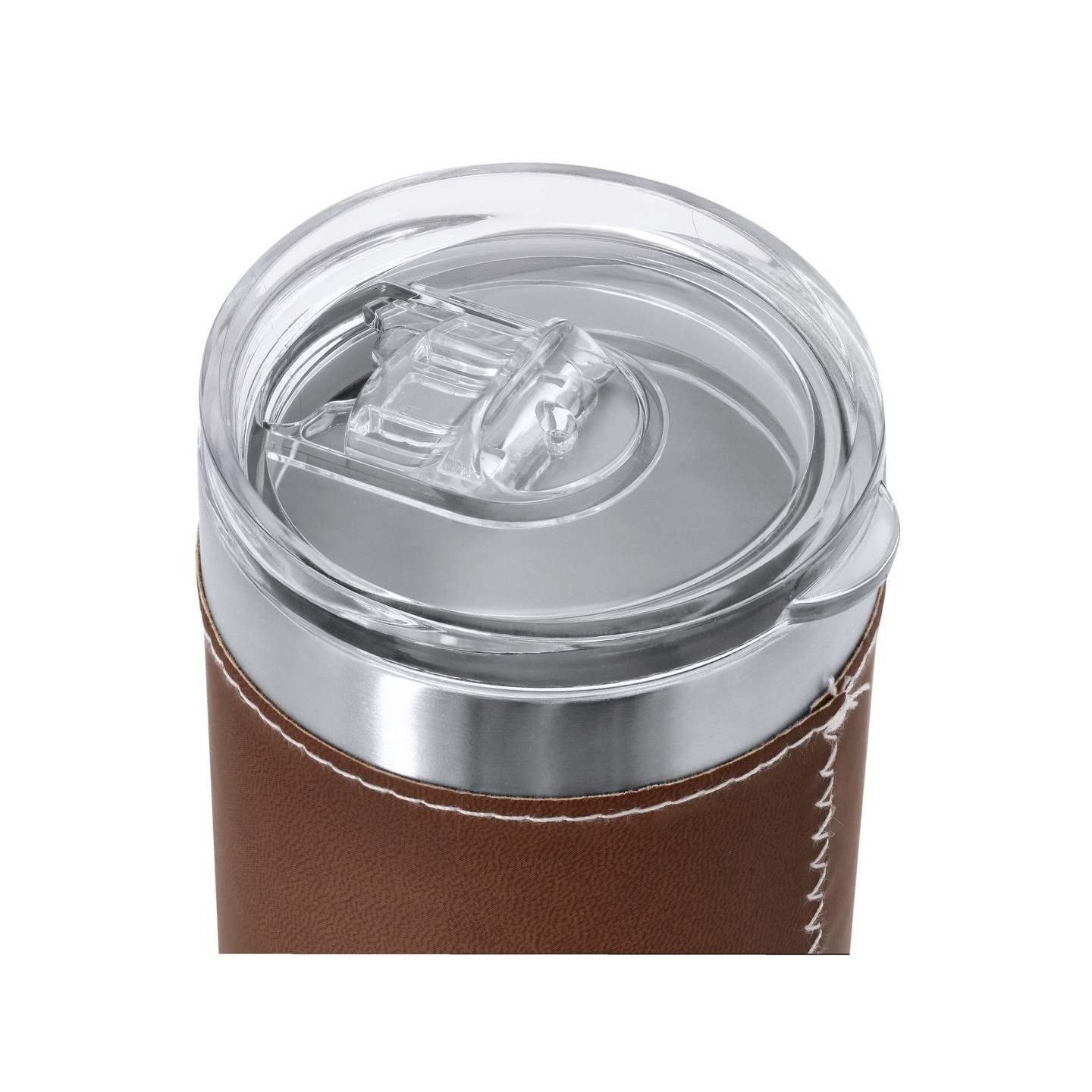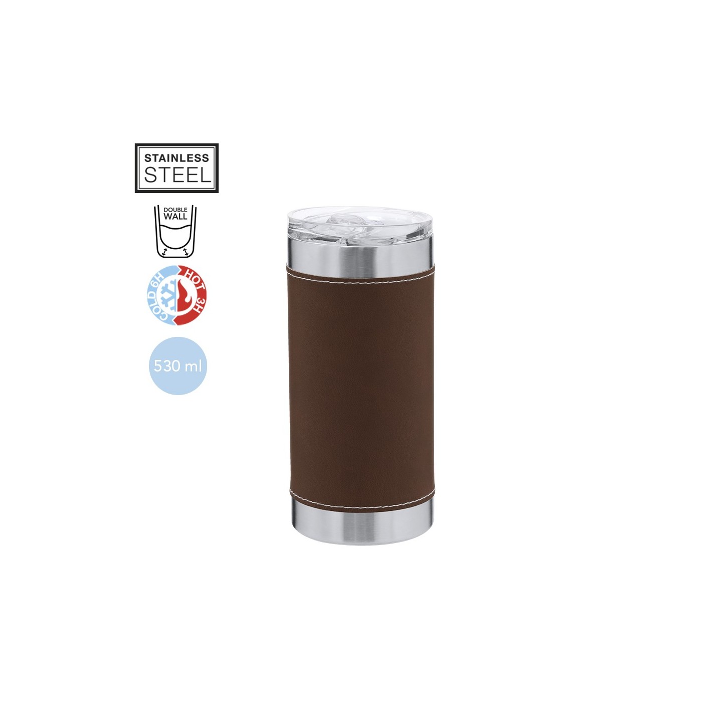 Vaso térmico de acero inoxidable de doble pared, 530 ml. Elegante fajín de PU y tapa con dosificador. Ideal para personalizar con tu logotipo