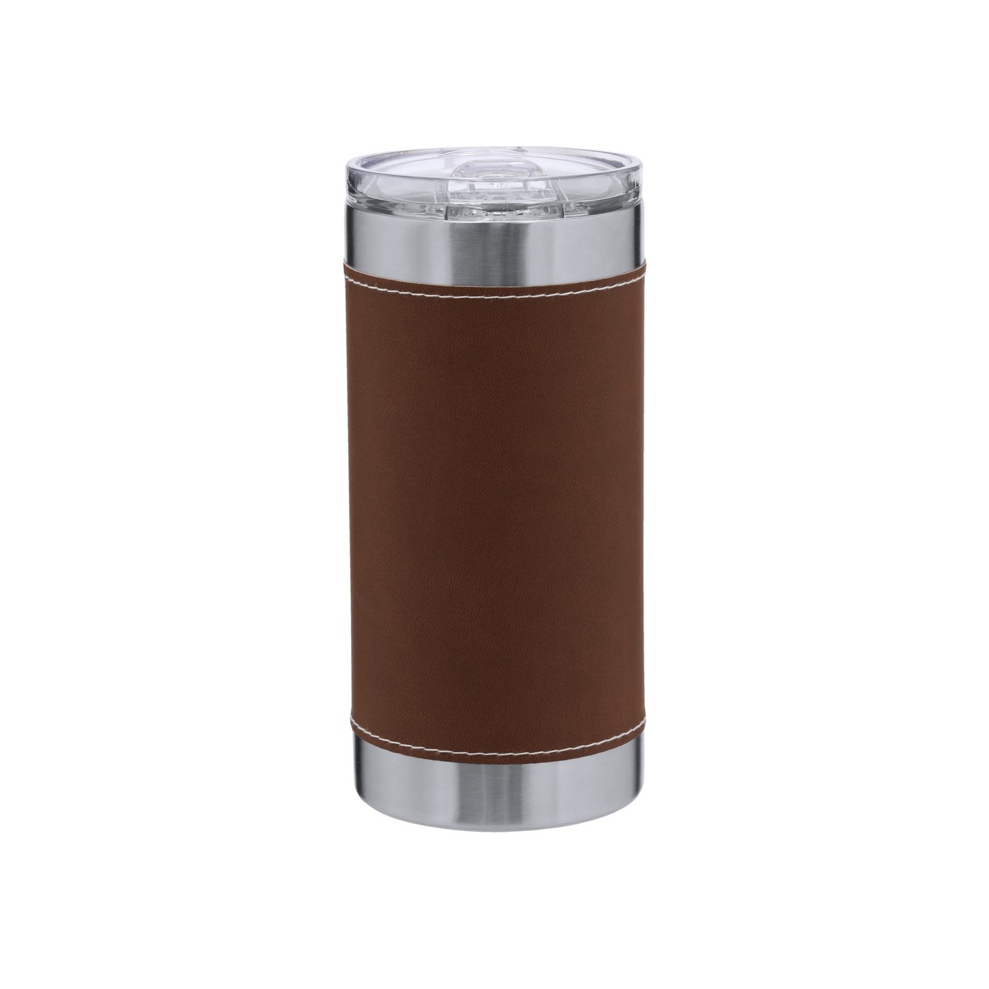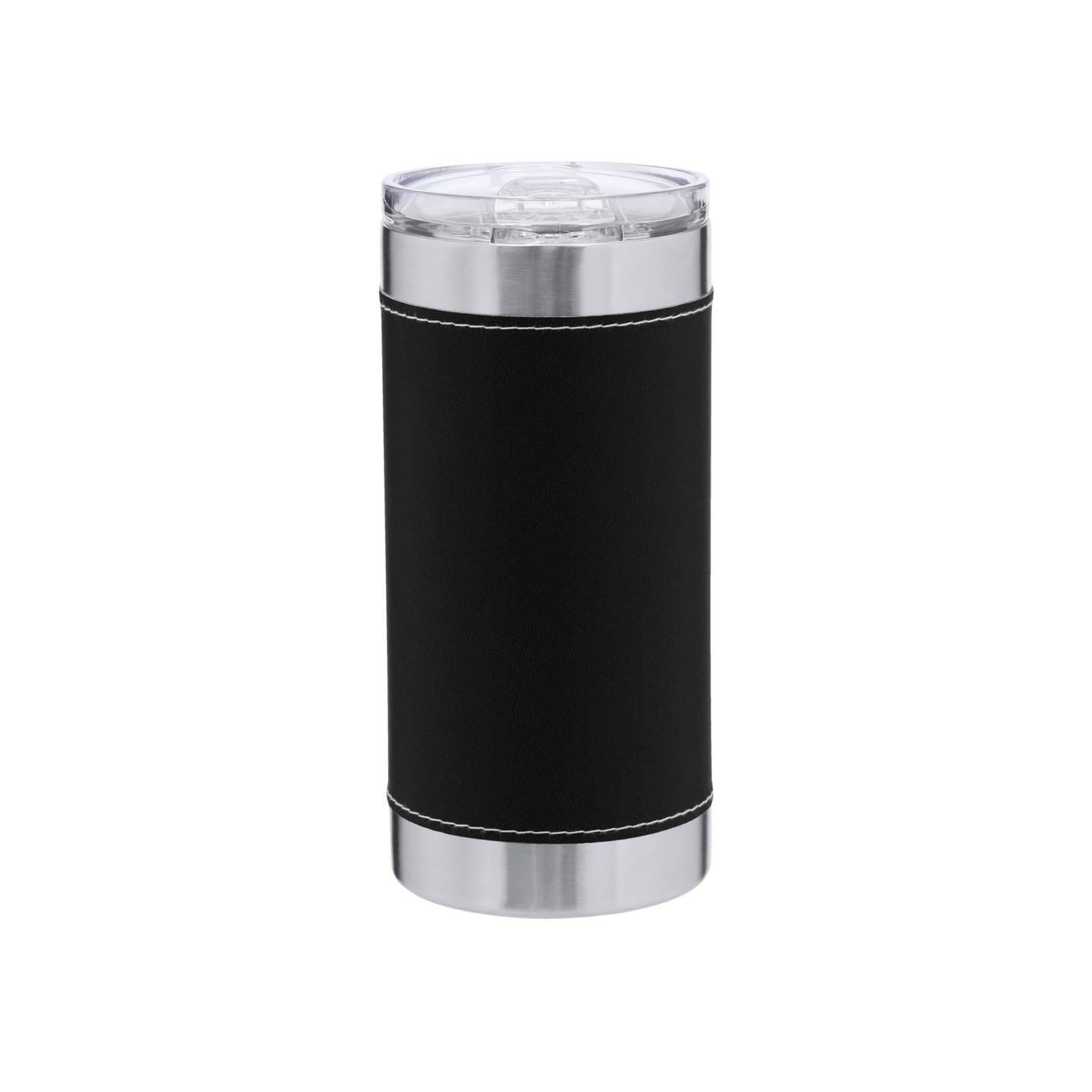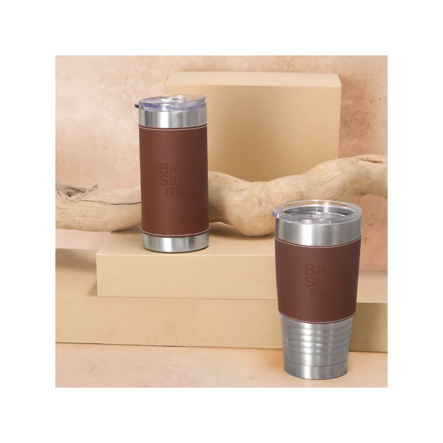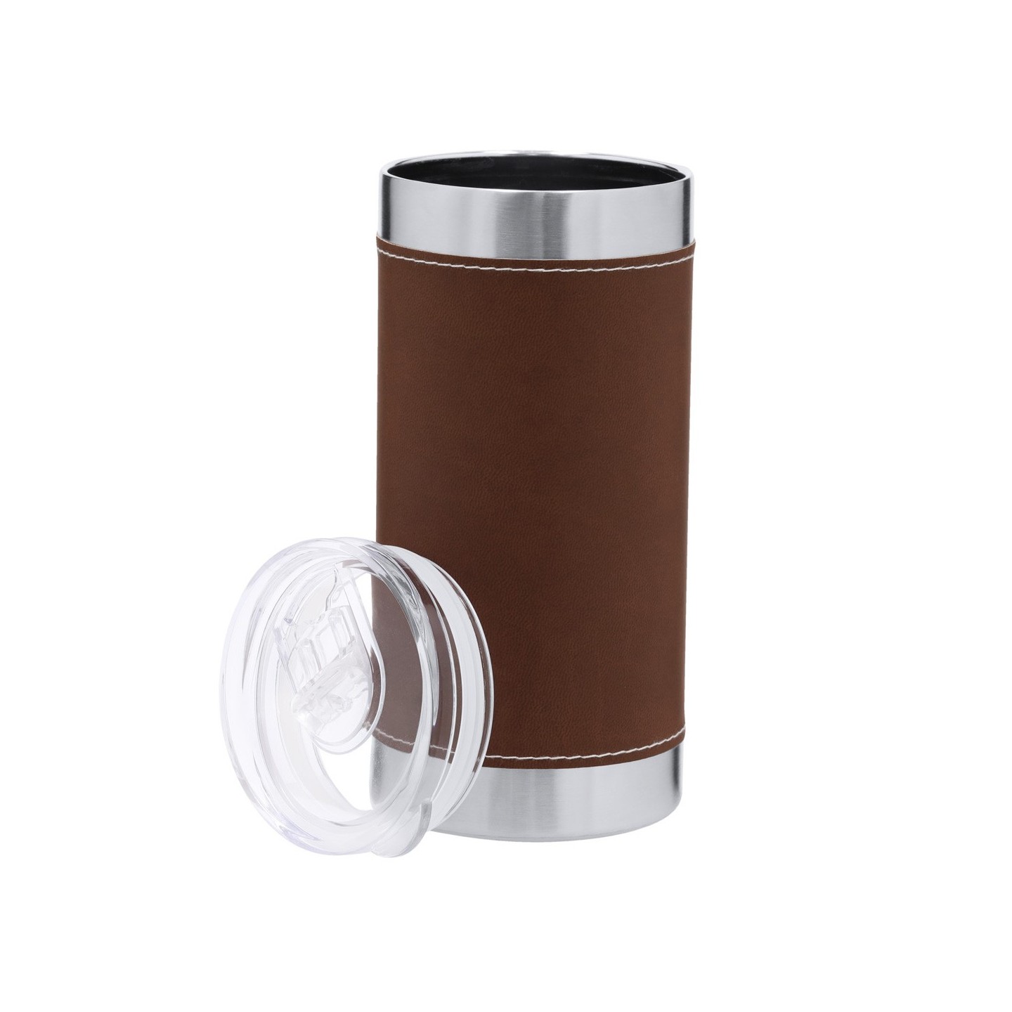 Vaso térmico de acero inoxidable de doble pared, 530 ml. Elegante fajín de PU y tapa con dosificador. Ideal para personalizar con tu logotipo