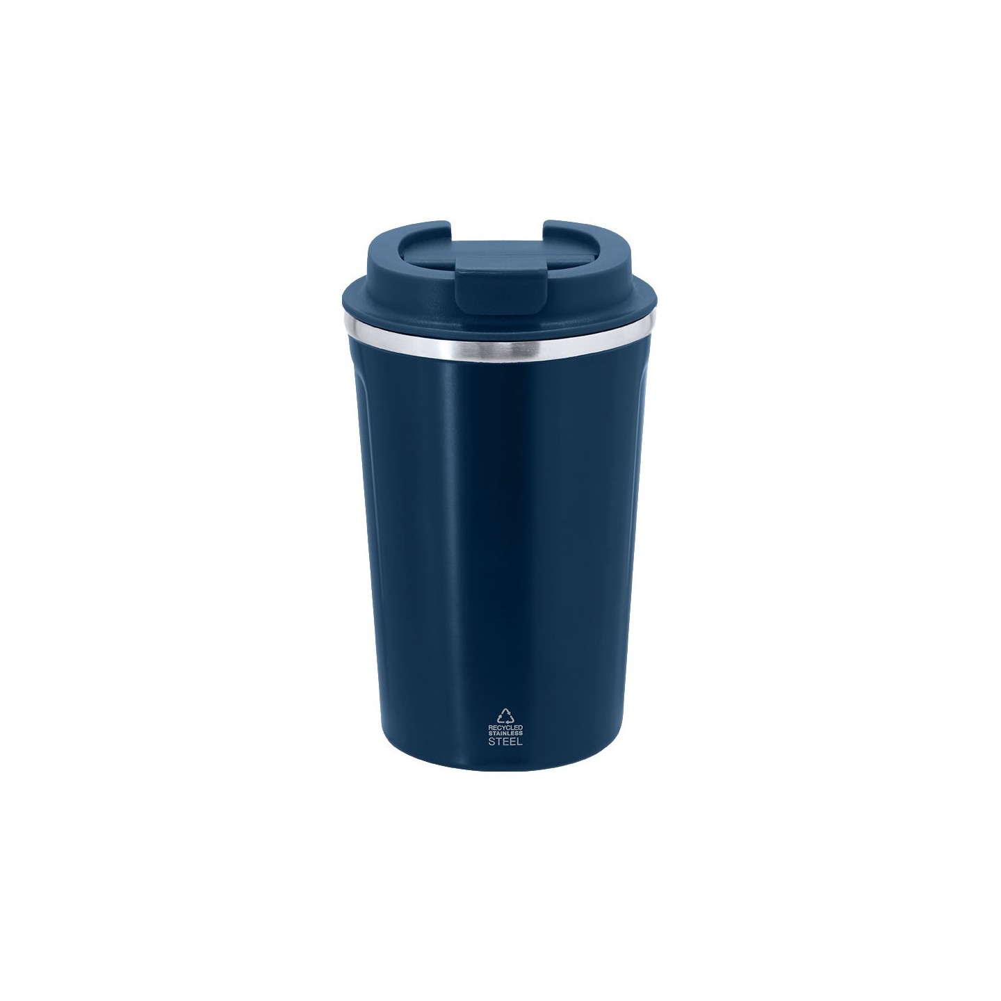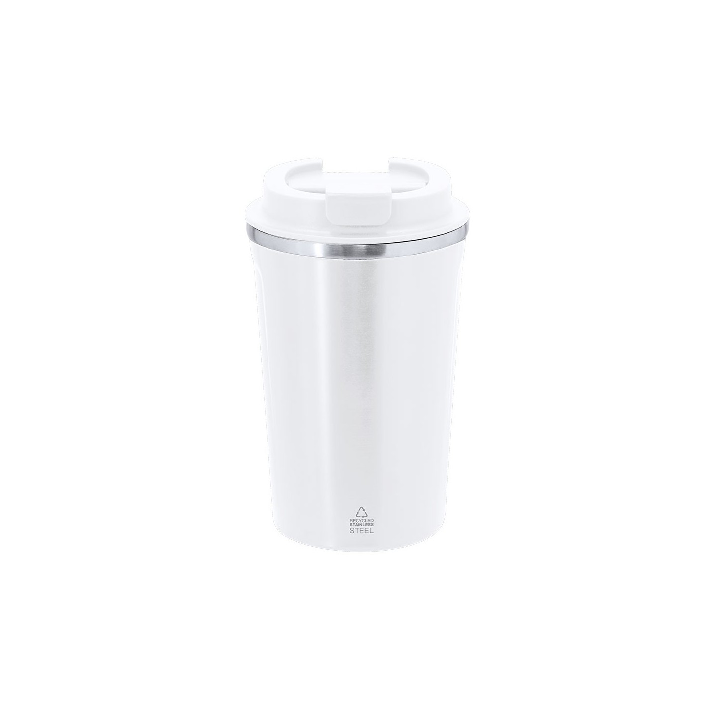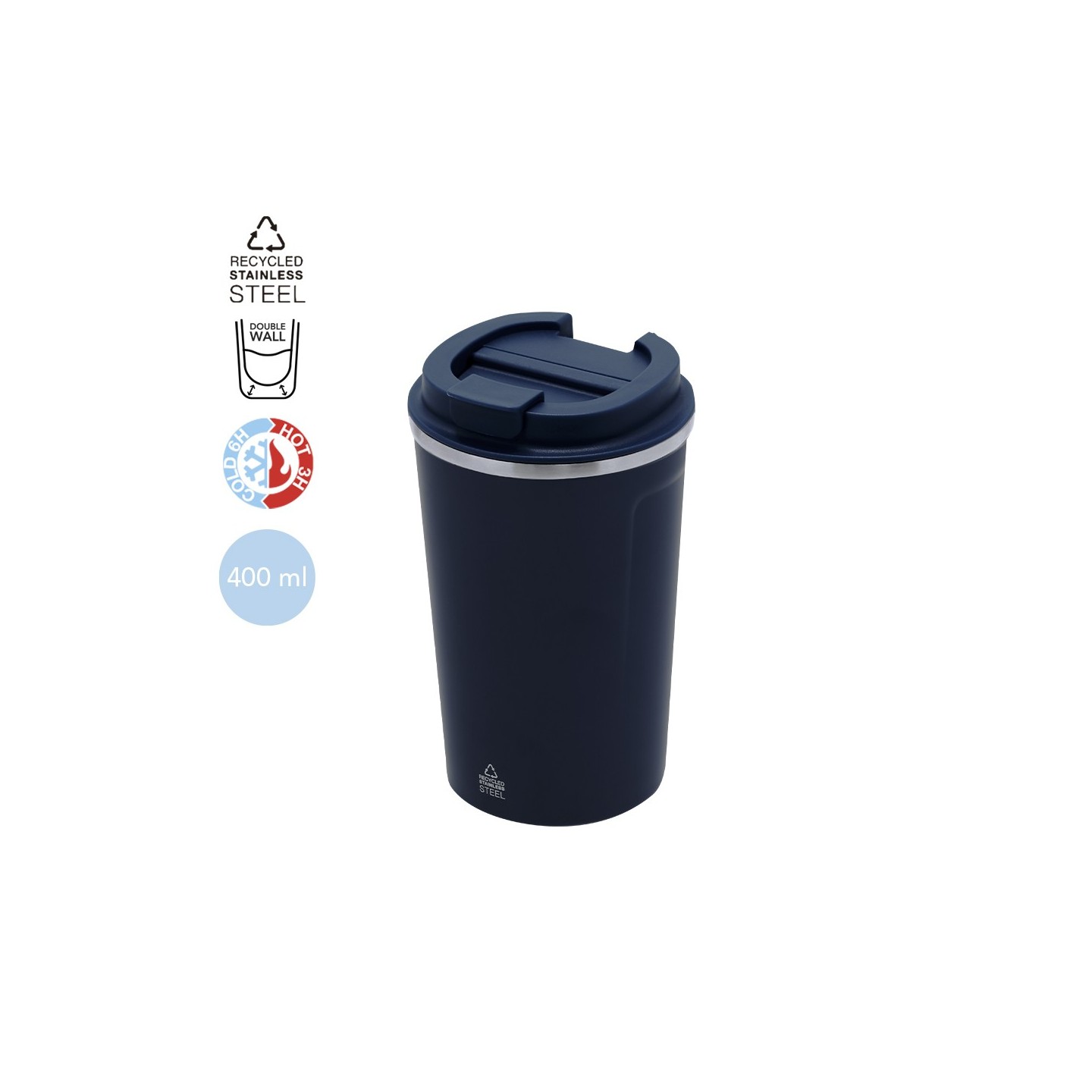 Vaso térmico de 400 ml en acero inoxidable reciclado, mantiene la temperatura hasta 6h frío y 3h calor. Personalizable con tu logotipo.