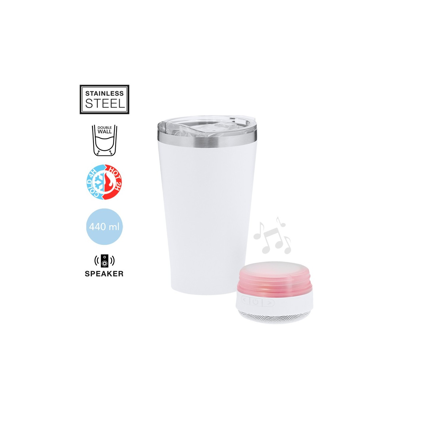 El Vaso Térmico Altavoz Tandix combina un vaso de acero inoxidable de 440 ml con un altavoz Bluetooth 5.3. Ideal para bebidas frías o calientes, es personalizable y perfecto para cualquier ocasión.