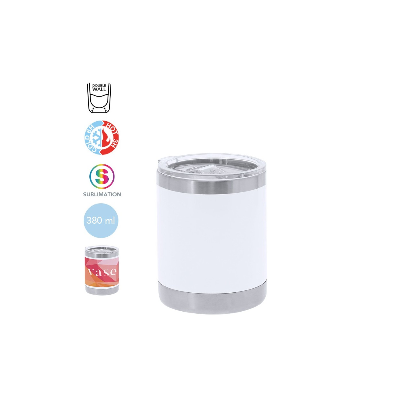 Vaso térmico de acero inoxidable de 380 ml, mantiene las bebidas frías hasta 6 horas y calientes 3 horas. Personalizable por sublimación, ideal para promociones.