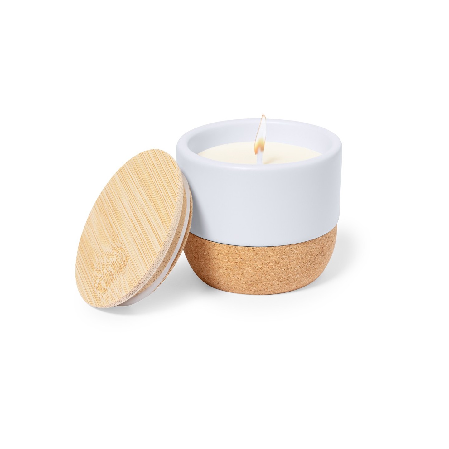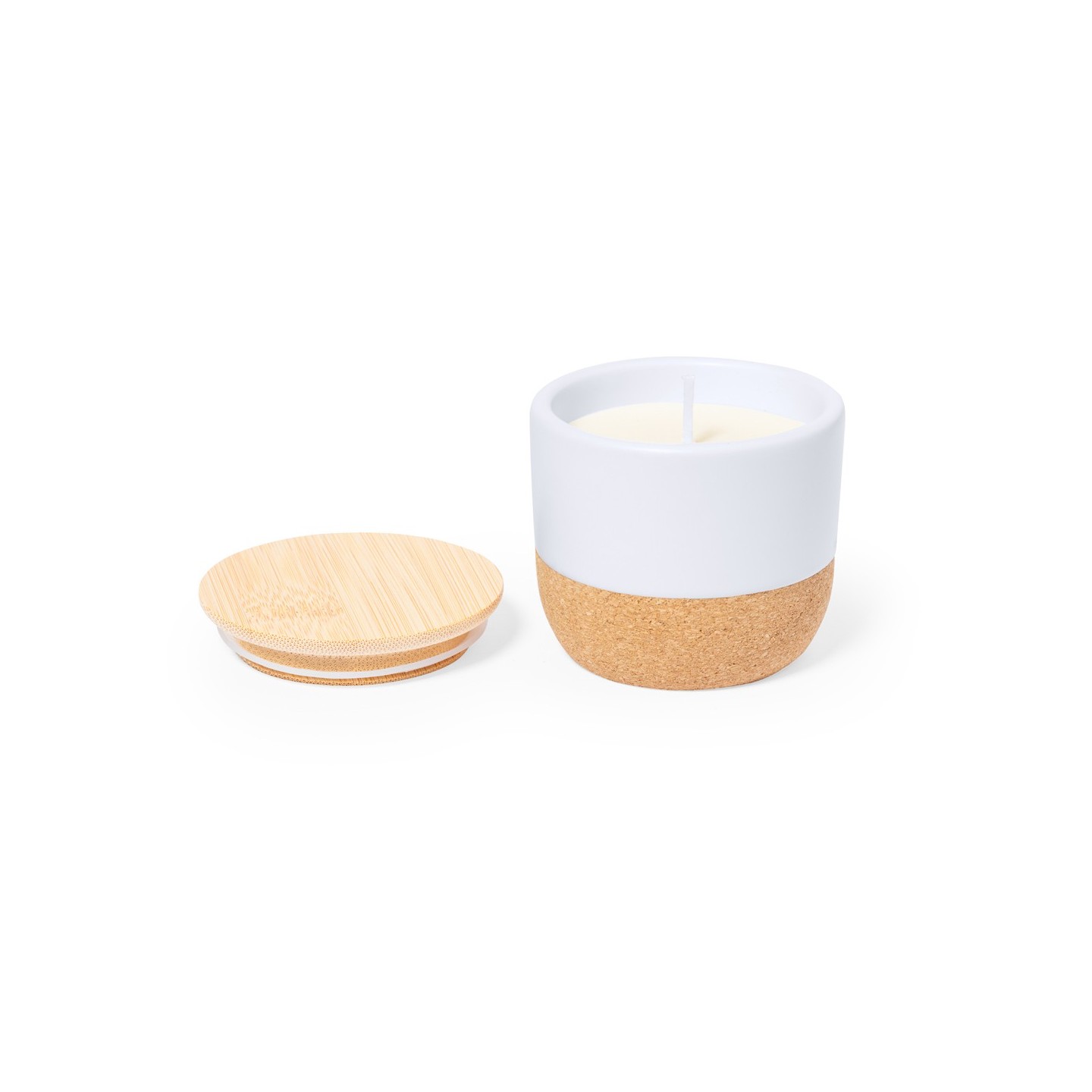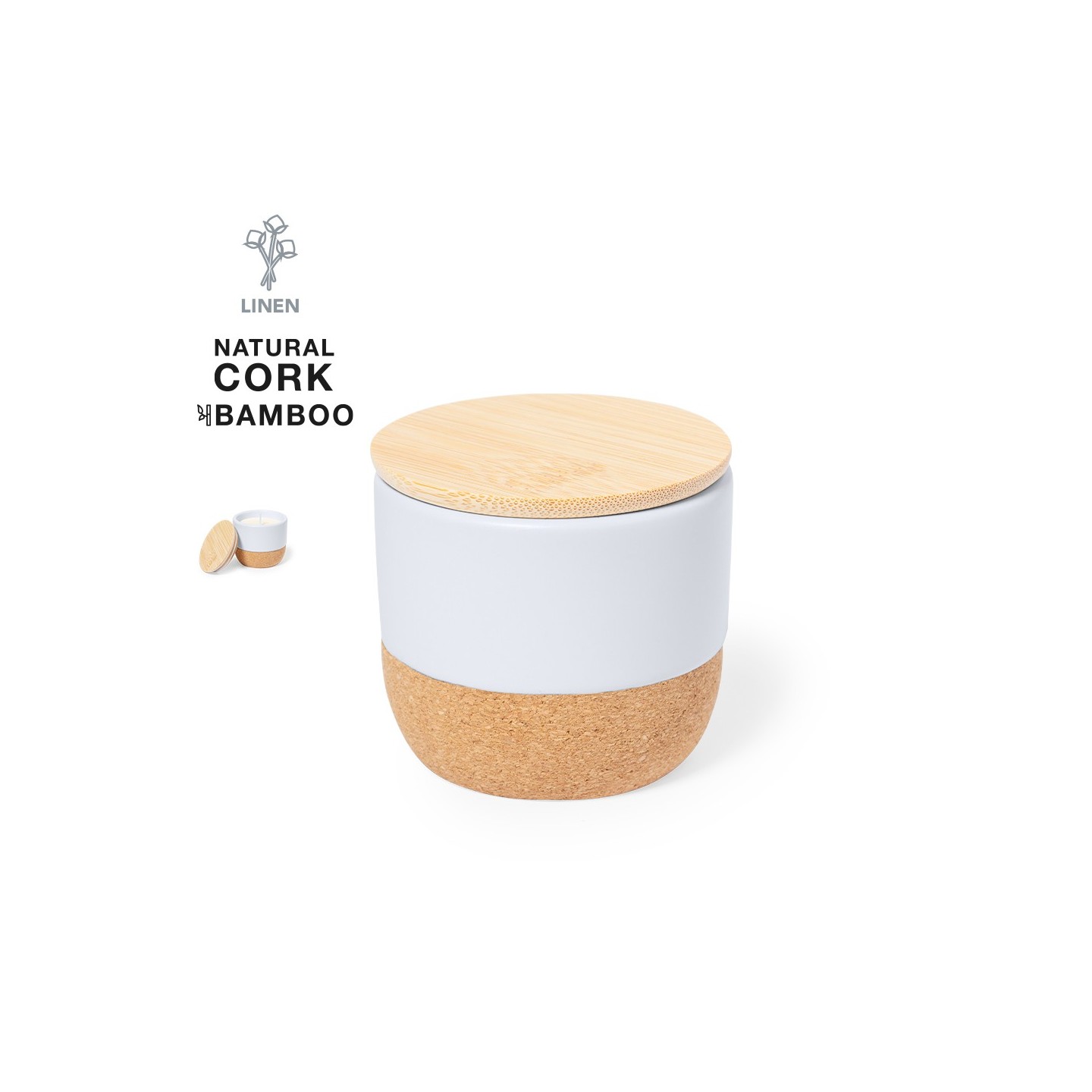 La Vela Aromática Lavolia enamora con su fragancia a lino en tarro de cerámica blanco con base de corcho y tapadera de bambú. Ideal como regalo, personalizable.