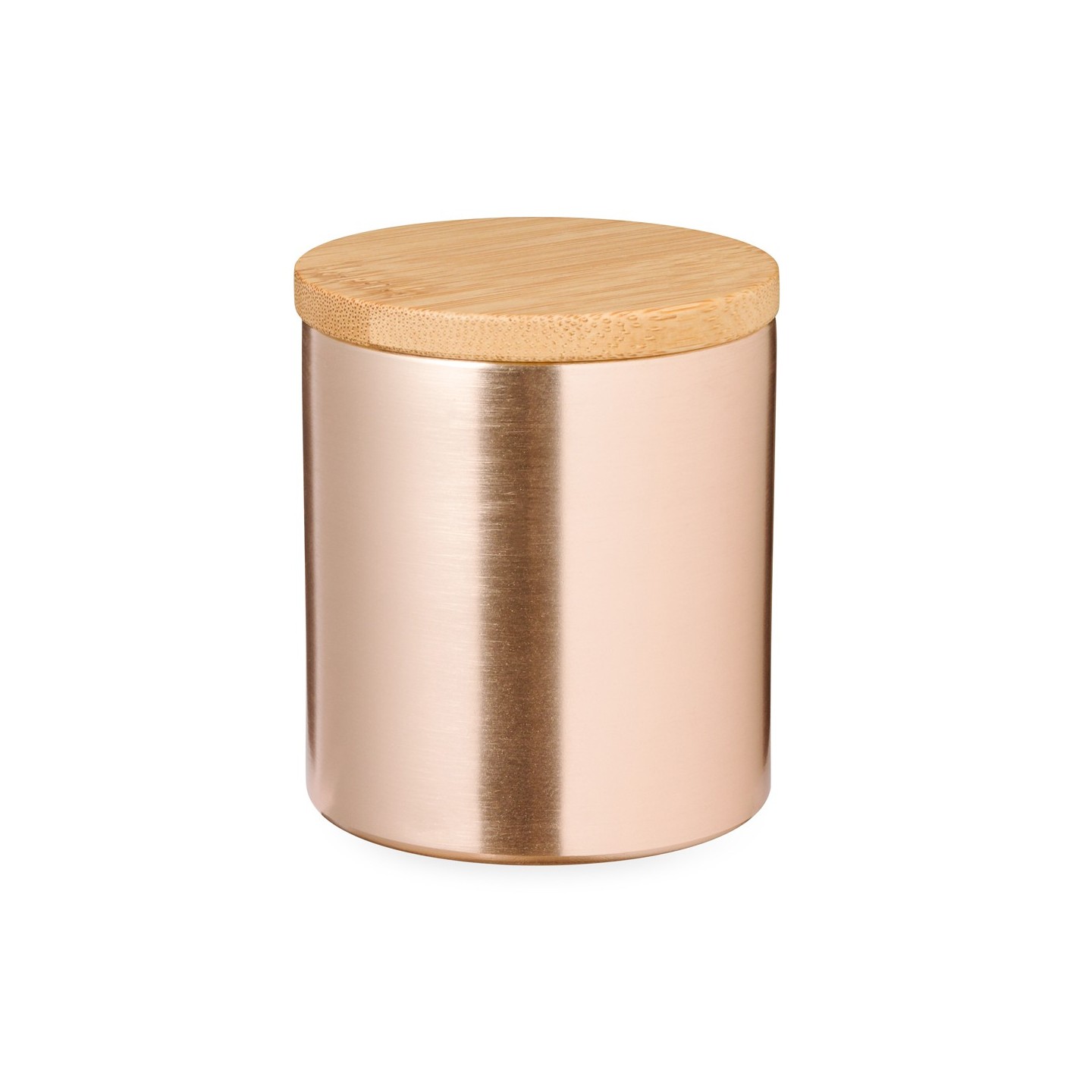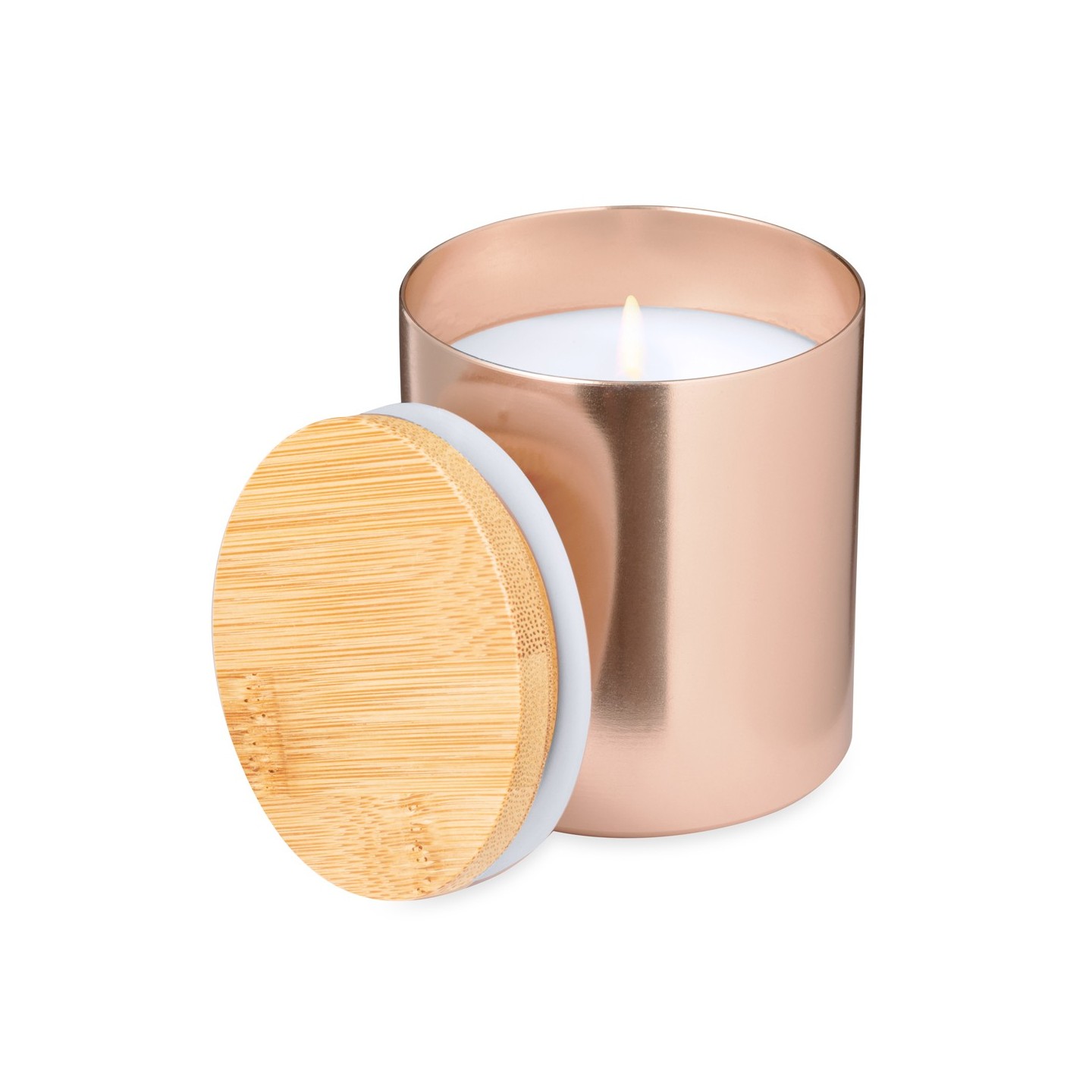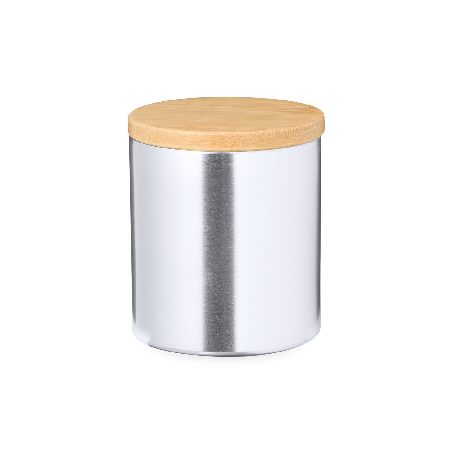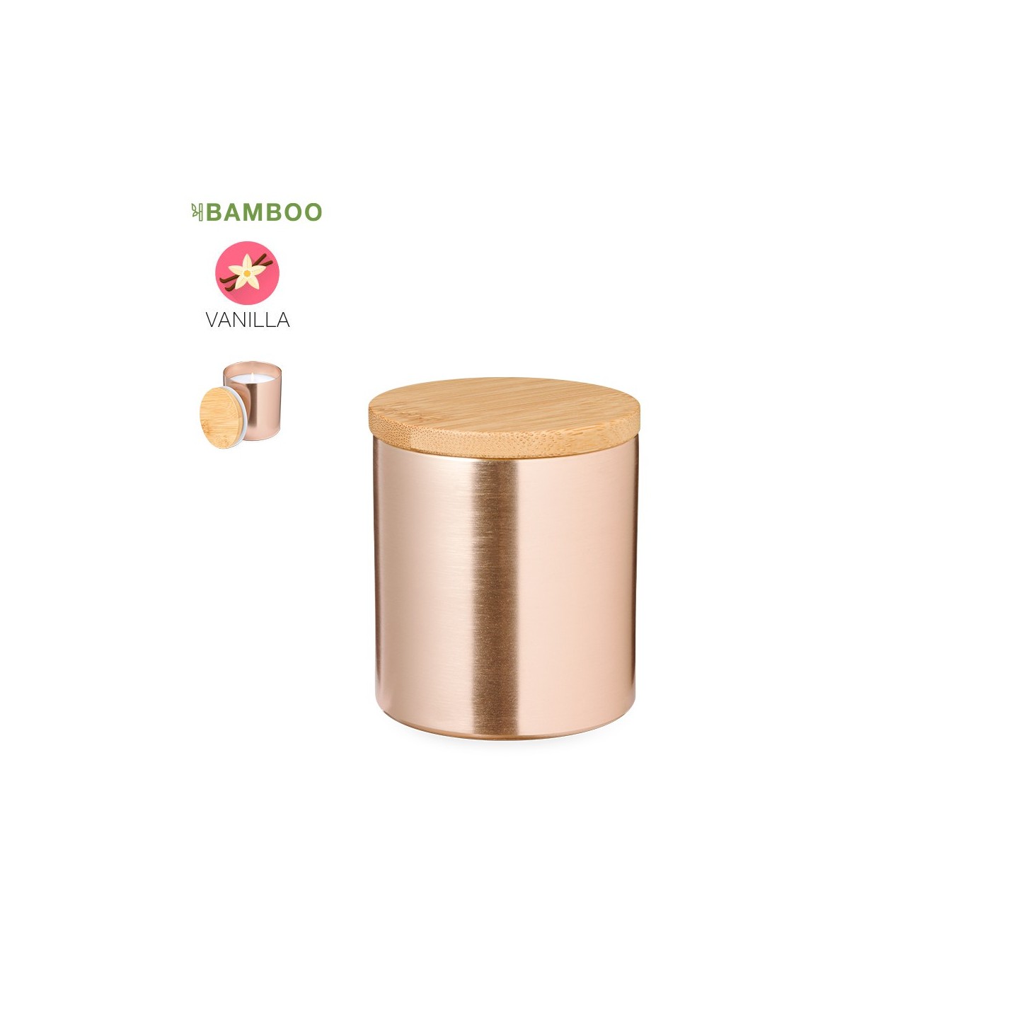 La Vela Aromática Rudyn tiene aroma a vainilla en tarro de metal con tapadera de bambú. Ideal como regalo, personalizable para empresas