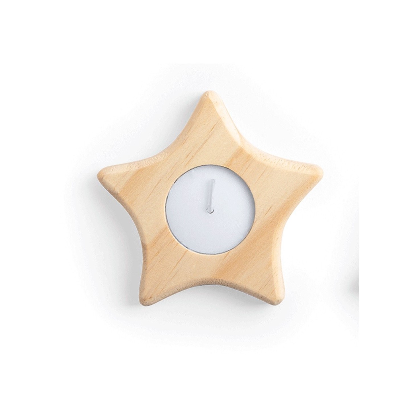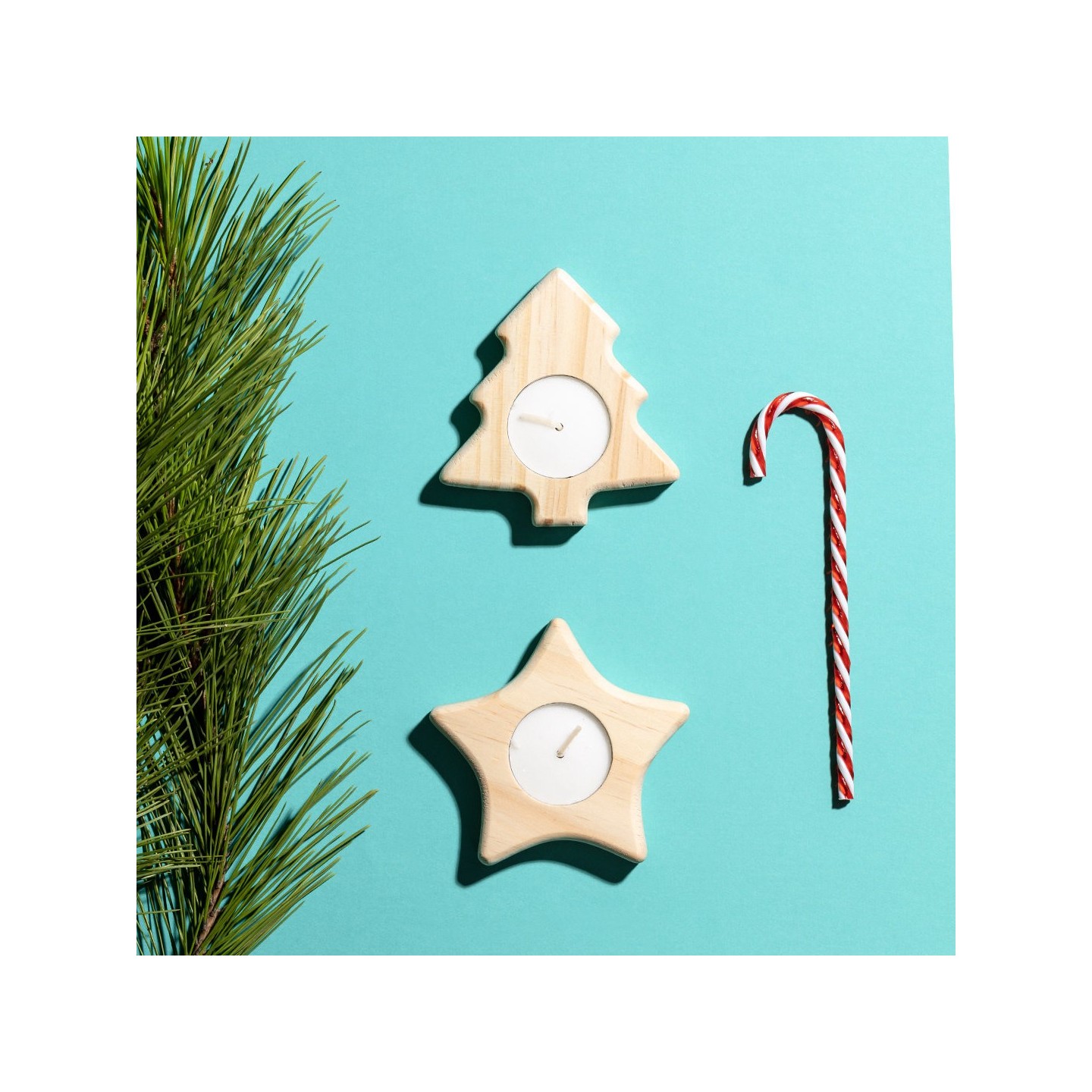 Encantadora vela de Navidad en madera de pino con diseño de estrella y arbolito. Perfecta para regalos personalizados.