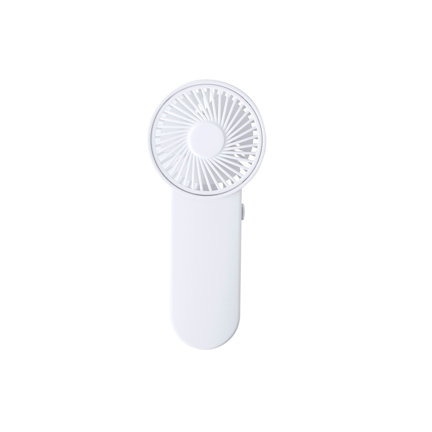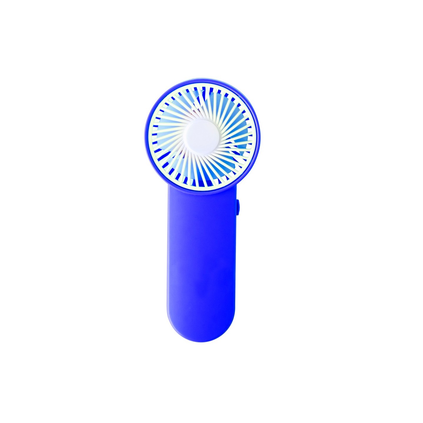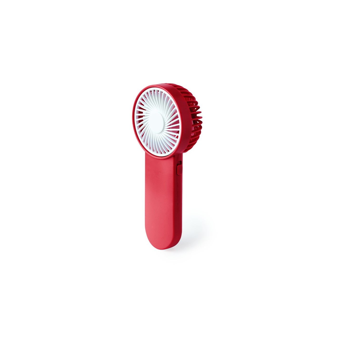 Ventilador de mano en ABS resistente. Botón on/off lateral. Disponible en varios colores. Funciona con 2 pilas AA (no incluidas). Presentado en caja. Personalizable.