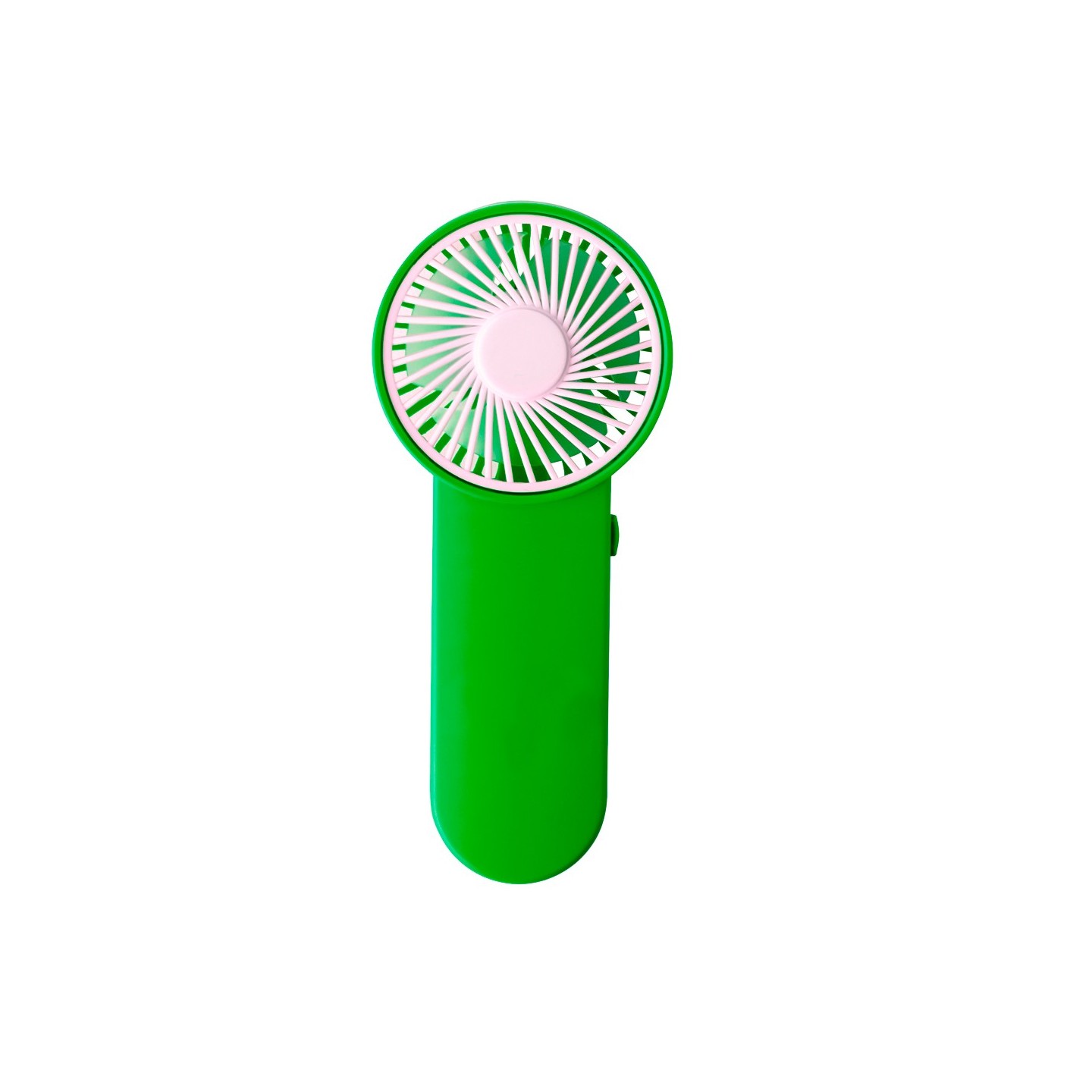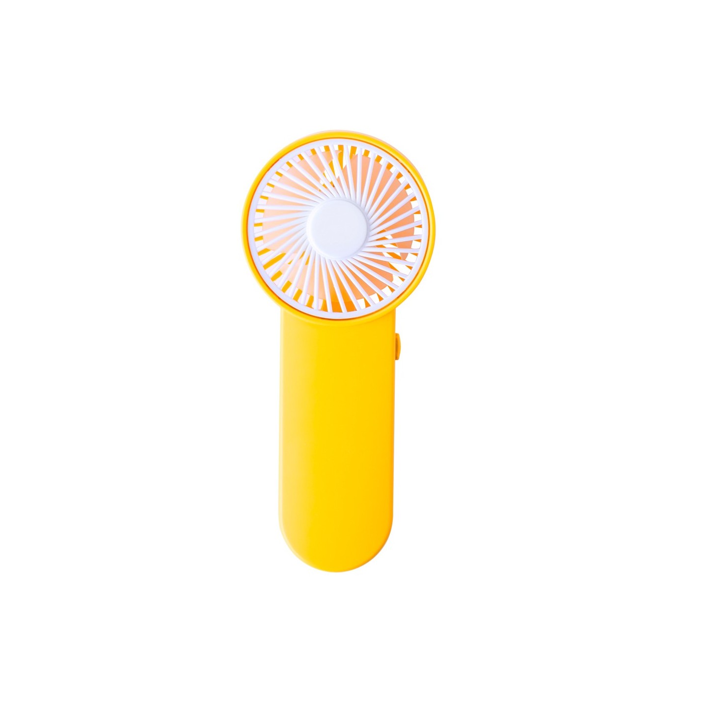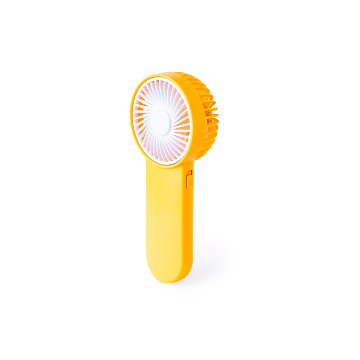 Ventilador de mano en ABS resistente. Botón on/off lateral. Disponible en varios colores. Funciona con 2 pilas AA (no incluidas). Presentado en caja. Personalizable.