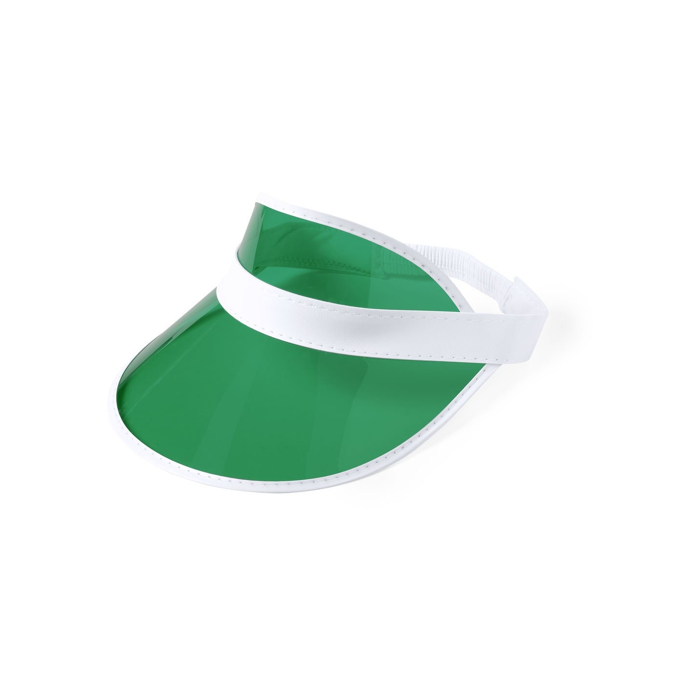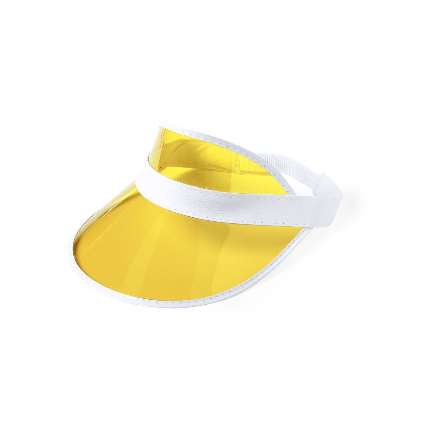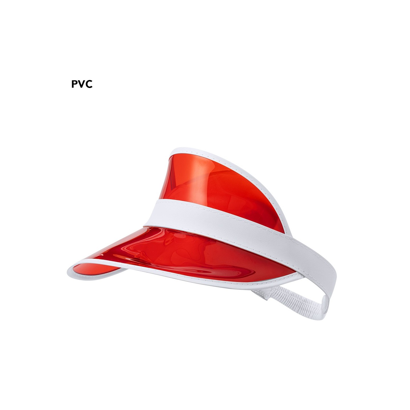 La visera Narim ofrece protección UV y estilo con su diseño transparente y detalles en blanco. Ideal para personalizar con el logo de tu empresa.
