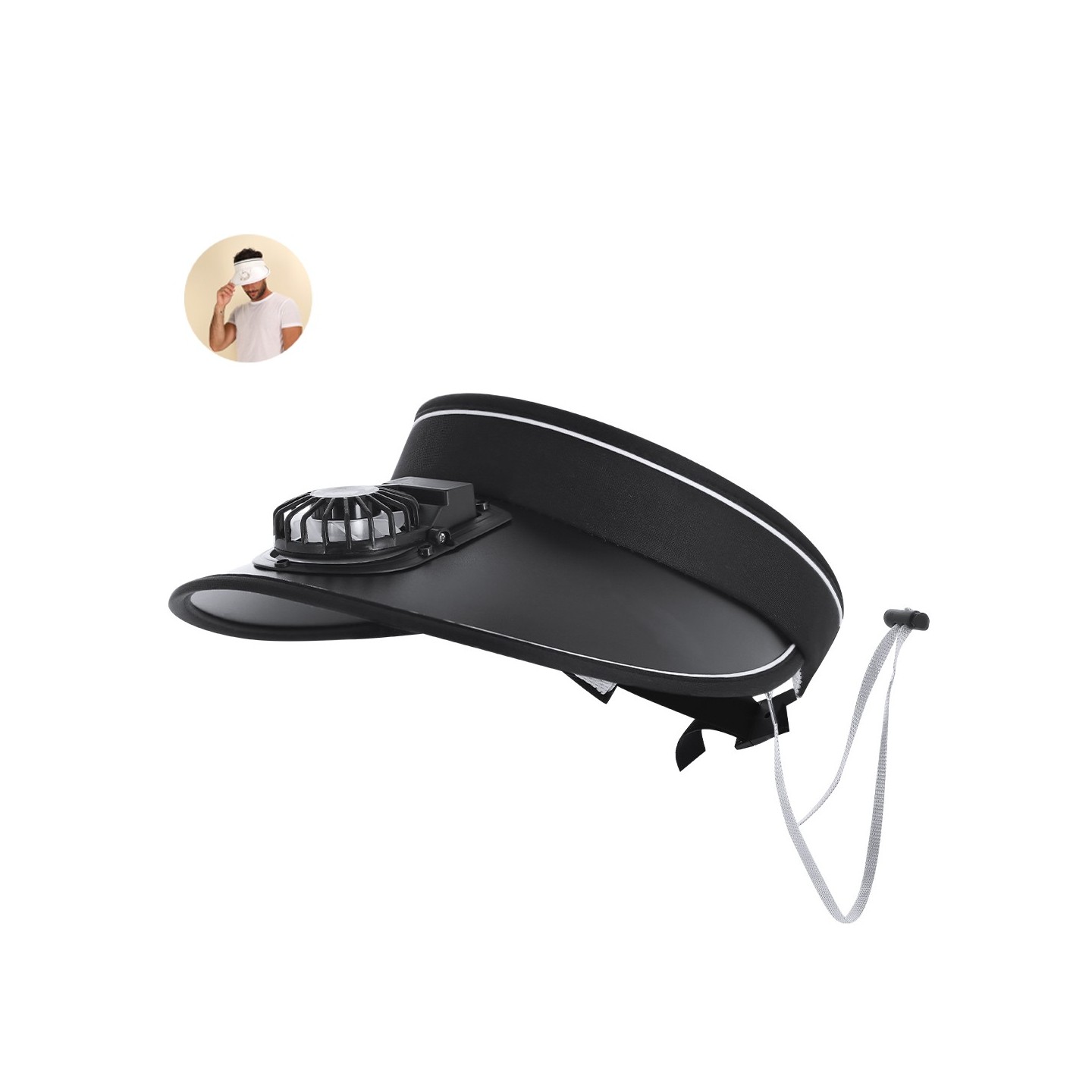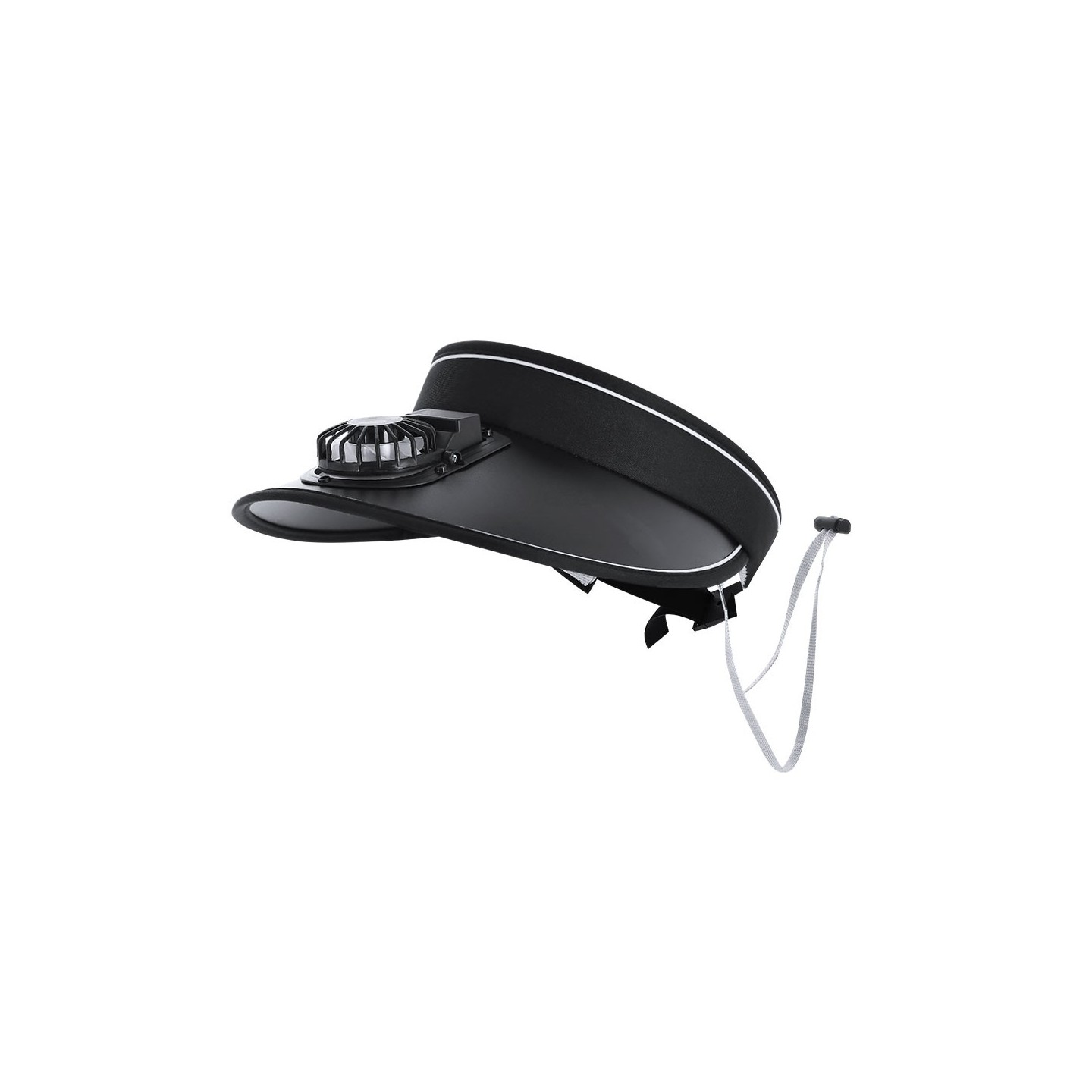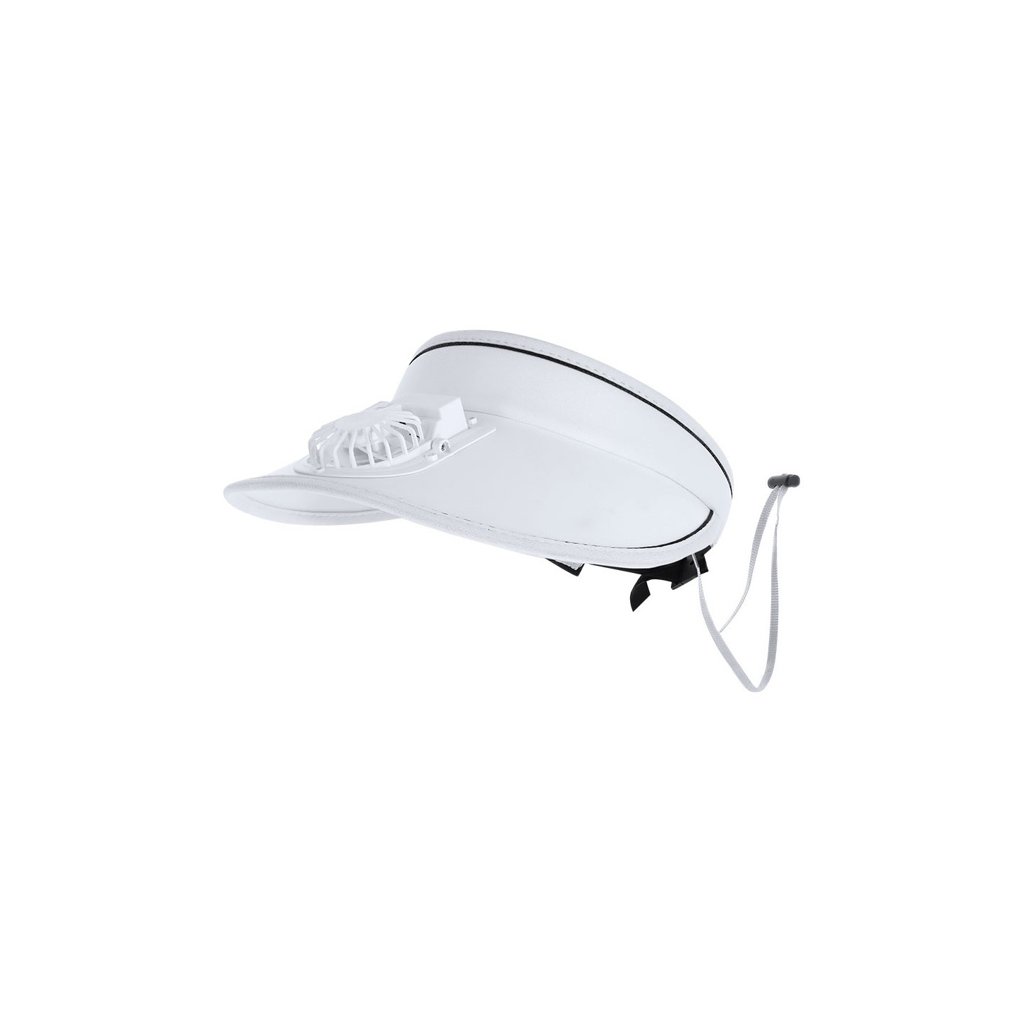 Visera con ventilador recargable, 3 velocidades y ajuste personalizado. Incluye cordón de transporte y batería recargable. Personalizable con tu logo.