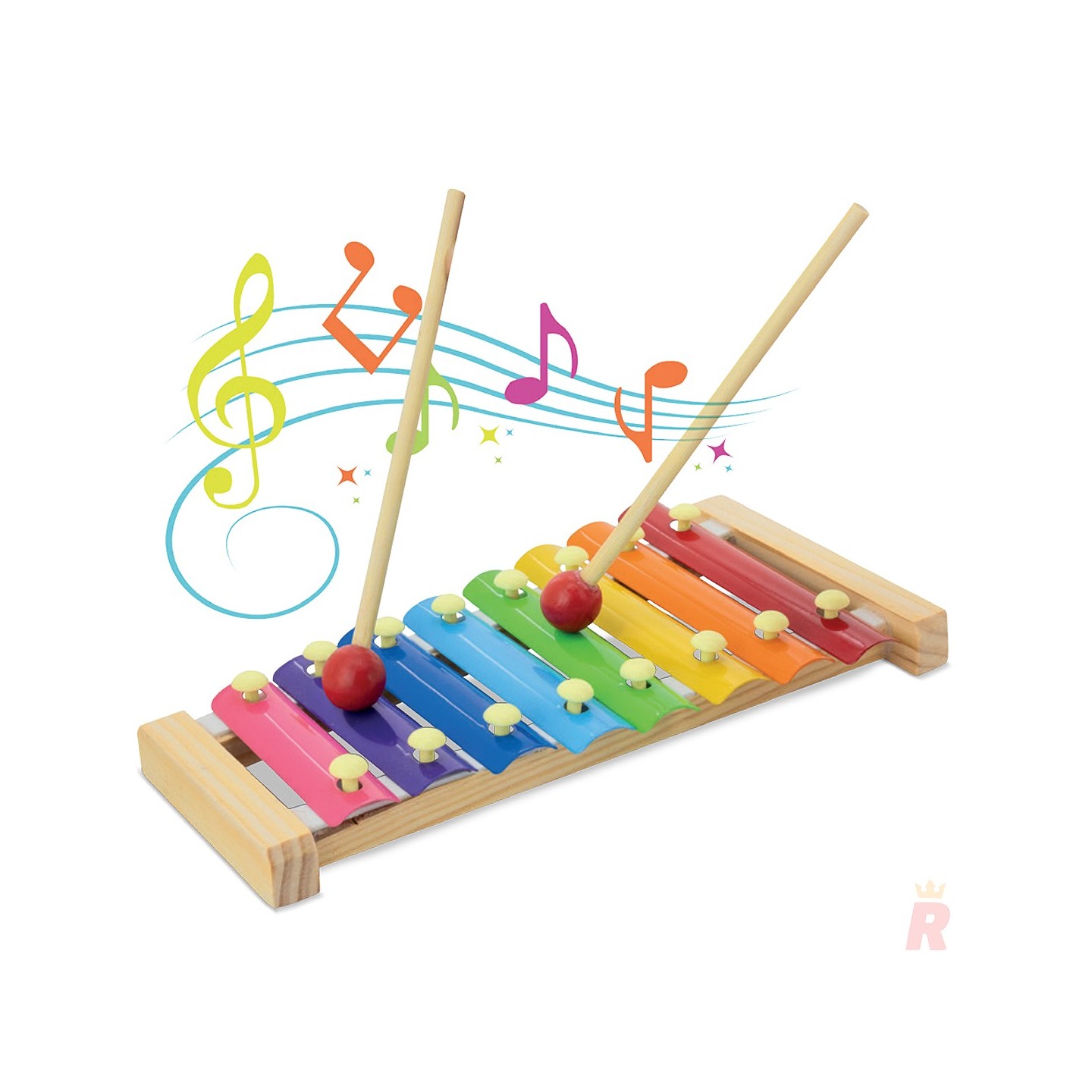 Xilófono educativo con ocho barras metálicas de colores brillantes. Fomenta el desarrollo musical, la creatividad y el aprendizaje de los colores en los niños