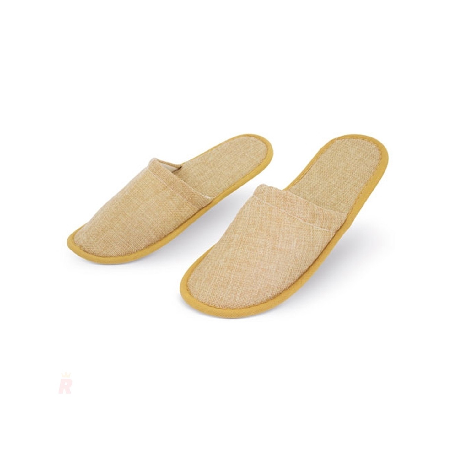 Zapatillas con suela antideslizante, acabado simil cáñamo y materiales ecológicos. Talla única, personalizables con logotipo. Ideales para hoteles y spas. Medidas: 27.70 x 11 cm.