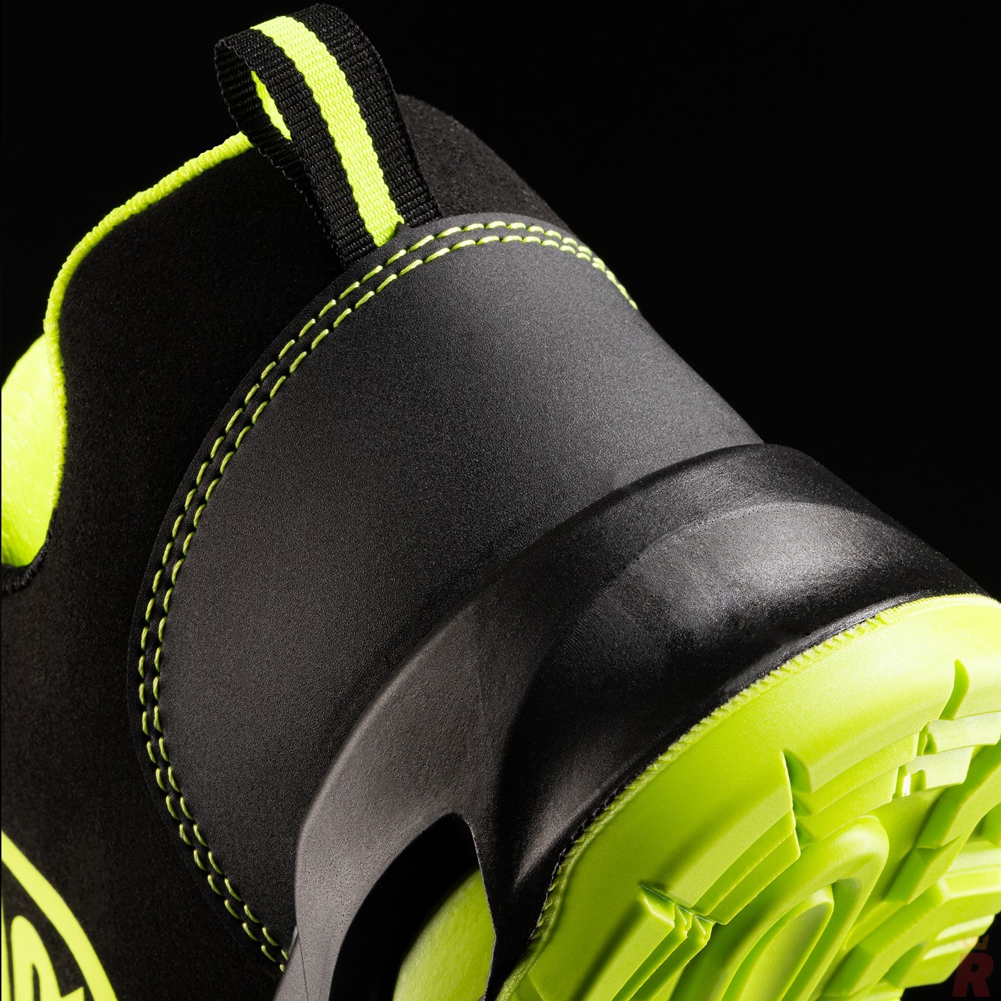 El diseño ergonómico, reforzado con talonera sólida, proporciona un ajuste firme y estable, mientras que el interior acolchado en tejido técnico de color flúor mejora la comodidad durante largas jornadas laborales. Su puntera de fibra de vidrio soporta impactos de hasta 200 julios y la plantilla antiperforación textil PS protege sin restar flexibilidad. Además, la suela de poliuretano de doble densidad ofrece un excelente agarre y absorción de energía.